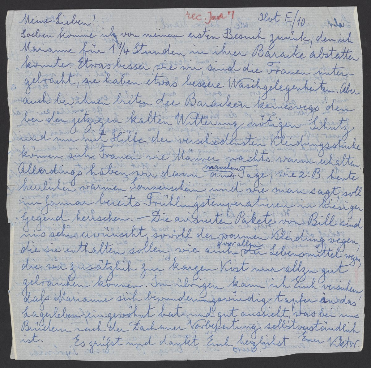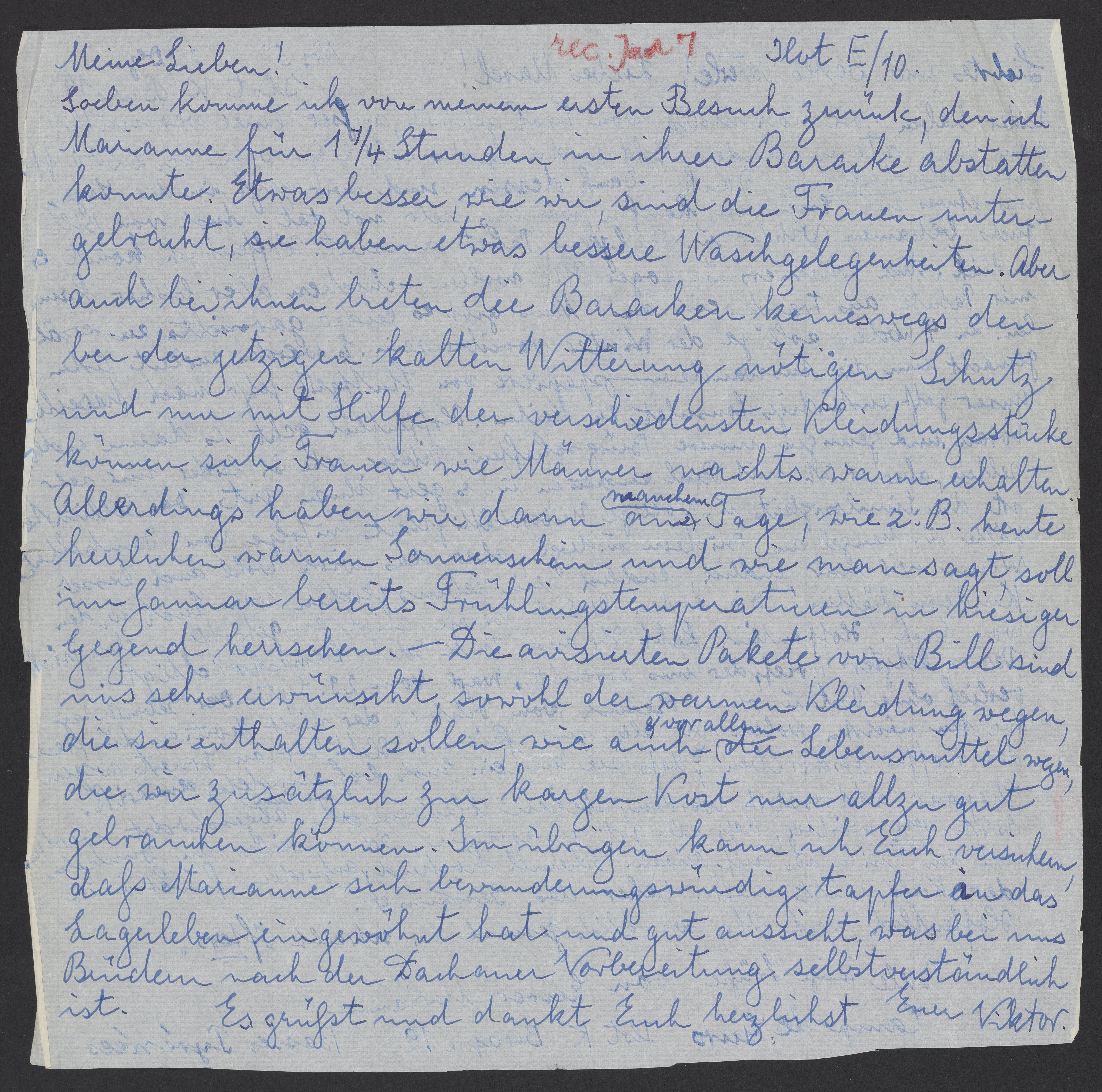 Soeben komme ich von meinem ersten Besuch zurück, den ich Marianne für 1 ¼ Stunden in ihrer Baracke abstatten konnte. Etwas besser, wie wir, sind die Frauen untergebracht, sie haben etwas bessere Waschgelegenheiten. Aber auch bei ihnen breiten die Baracken keineswegs den bei der jetzigen kalten Witterung nötigen Schutz und nur mit Hilfe der verschiedensten Kleidungsstücke können sich Frauen wie Männer nachts warm erhalten. Allerdings haben wir dann manchem am Tage, wie z.B. herzlichen warmen Sonnenschein und wie man sagt, soll im Januar bereits Frühlingstemperaturen in hiesiger Gegend herrschen. – Die avisierten Pakete von Bill sind uns sehr erwünscht, sowohl der warmen Kleidung wegen, die sie enthalten sollen, wie auch vor allem der Lebensmittel wegen, die wir zusätzlich zur kargen Kost nur allzu gut gebrauchen können. Im Übrigen kann ich Euch versichern, dass Marianne sich bewunderungswürdig tapfer in das Lagerleben eingewohnt hat und gut aussieht, was bei uns Brüdern nach der Dachauer Vorbereitung selbstverständlich ist.
