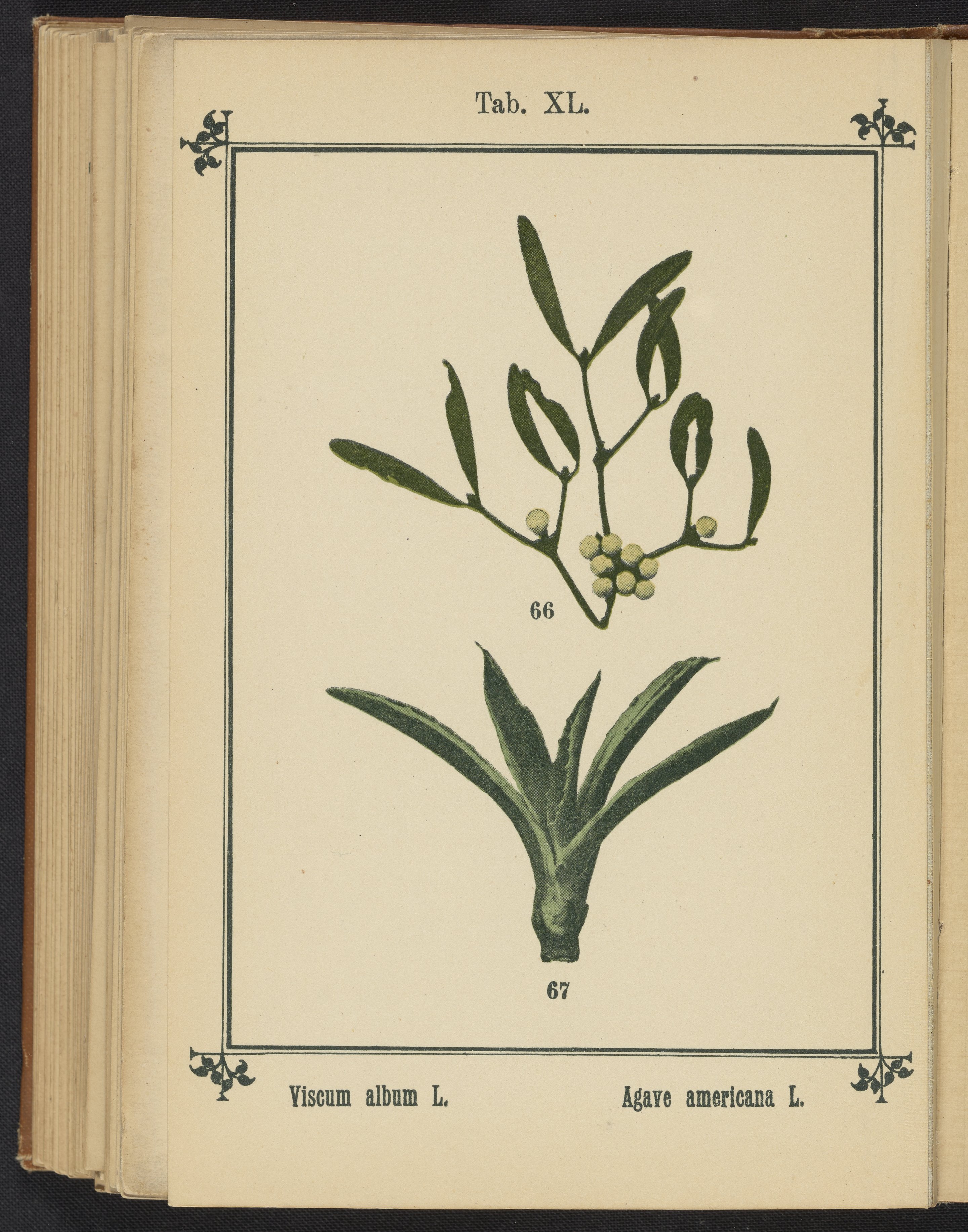 Kneipp, Sebastian. “Viscum Album L. and Agave Americana L.” Plant-Atlas to "My Water-Cure," : Containing Sixty Nine Pictorial Representations of All the Medicinal-Plants Mentioned as Well as Some Others in General Use among the People. Kempten, Germany: J. Koesel, 1893. https://digital.sciencehistory.org/works/fb494931b.