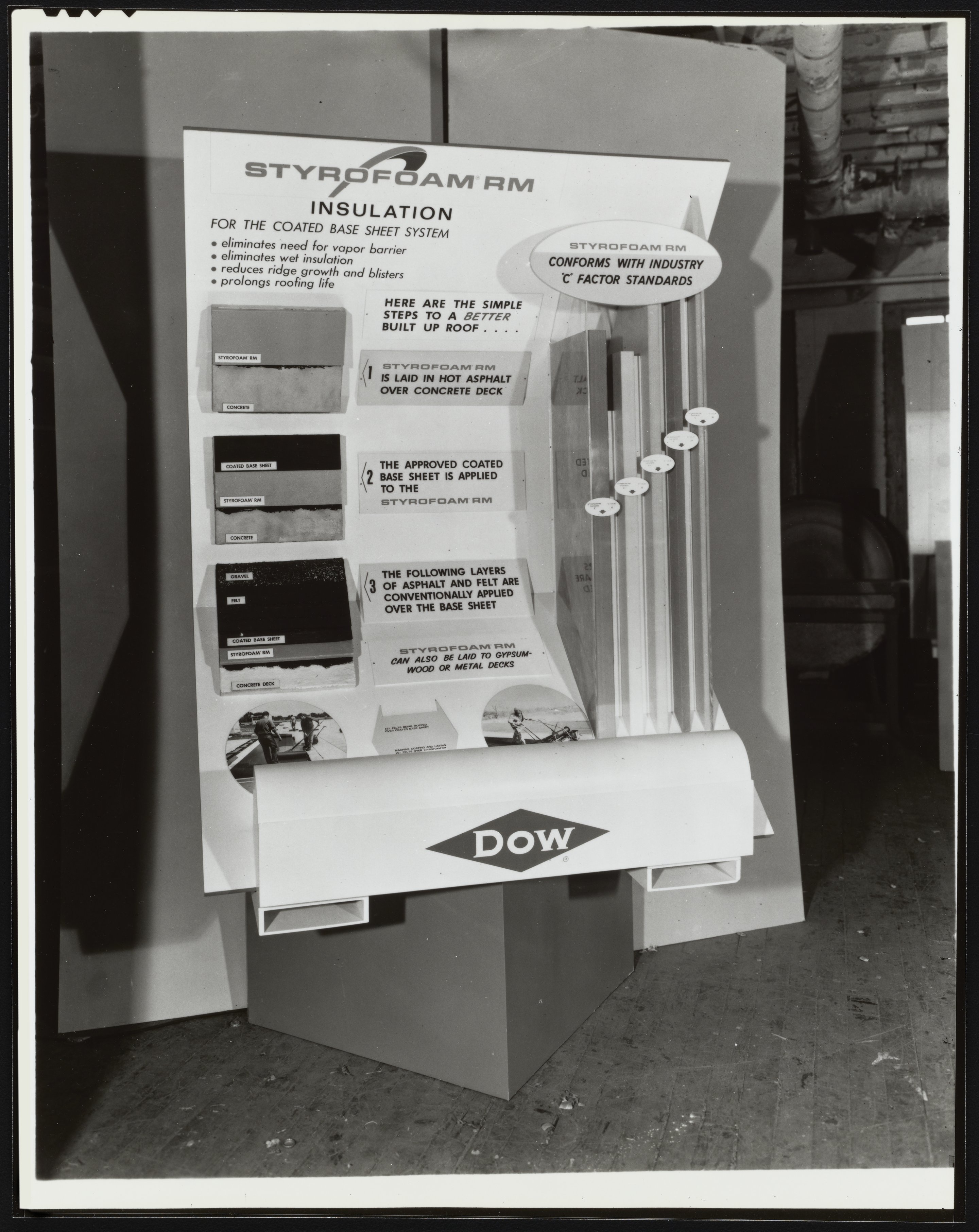 General view of a promotional display for Styrofoam insulation detailing the material's use in roofing. Invented in 1941 by researchers in Dow's Chemical Physics Lab, "Styrofoam" properly refers to the Dow Chemical Company’s trademarked brand of closed-cell extruded polystyrene foam commonly used for thermal insulation and craft applications.