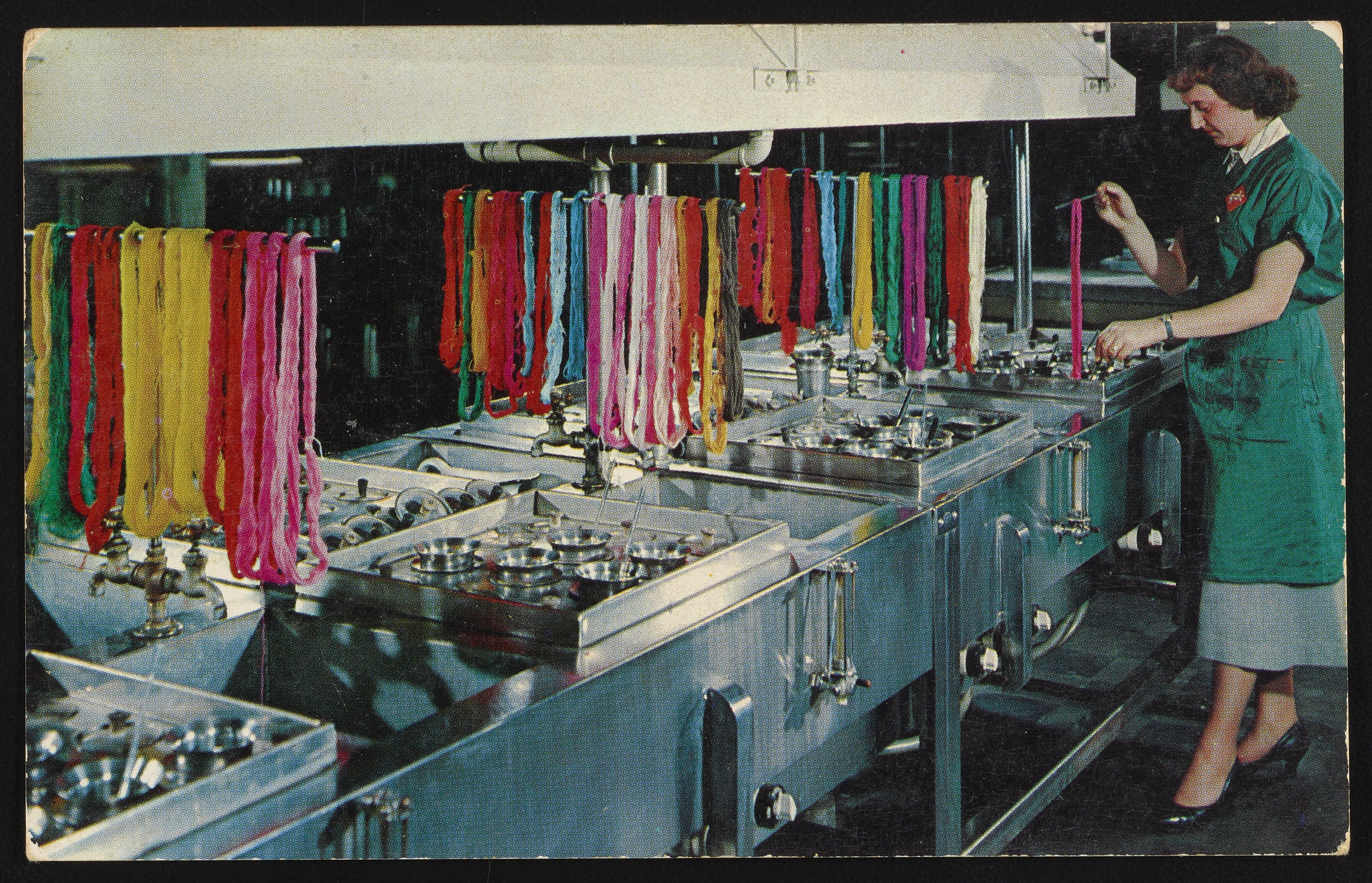 Postcard produced by the General Dyestuff Corporation, a sales division of the General Aniline & Film Corporation, depicting a woman using a dye bath. Colorful strands of fabric dyed various colors are draped above the dye baths.