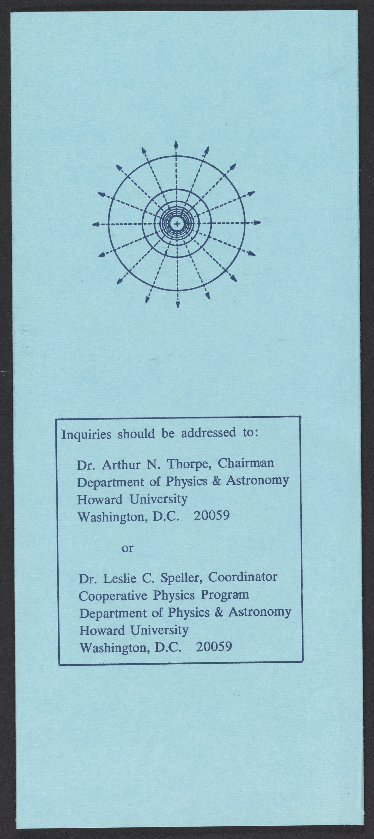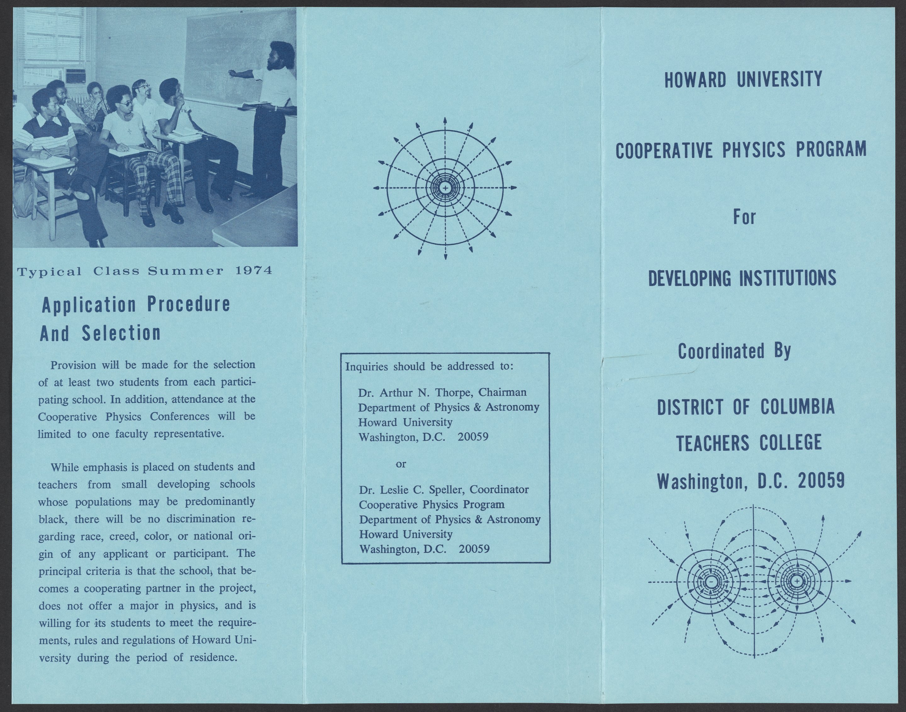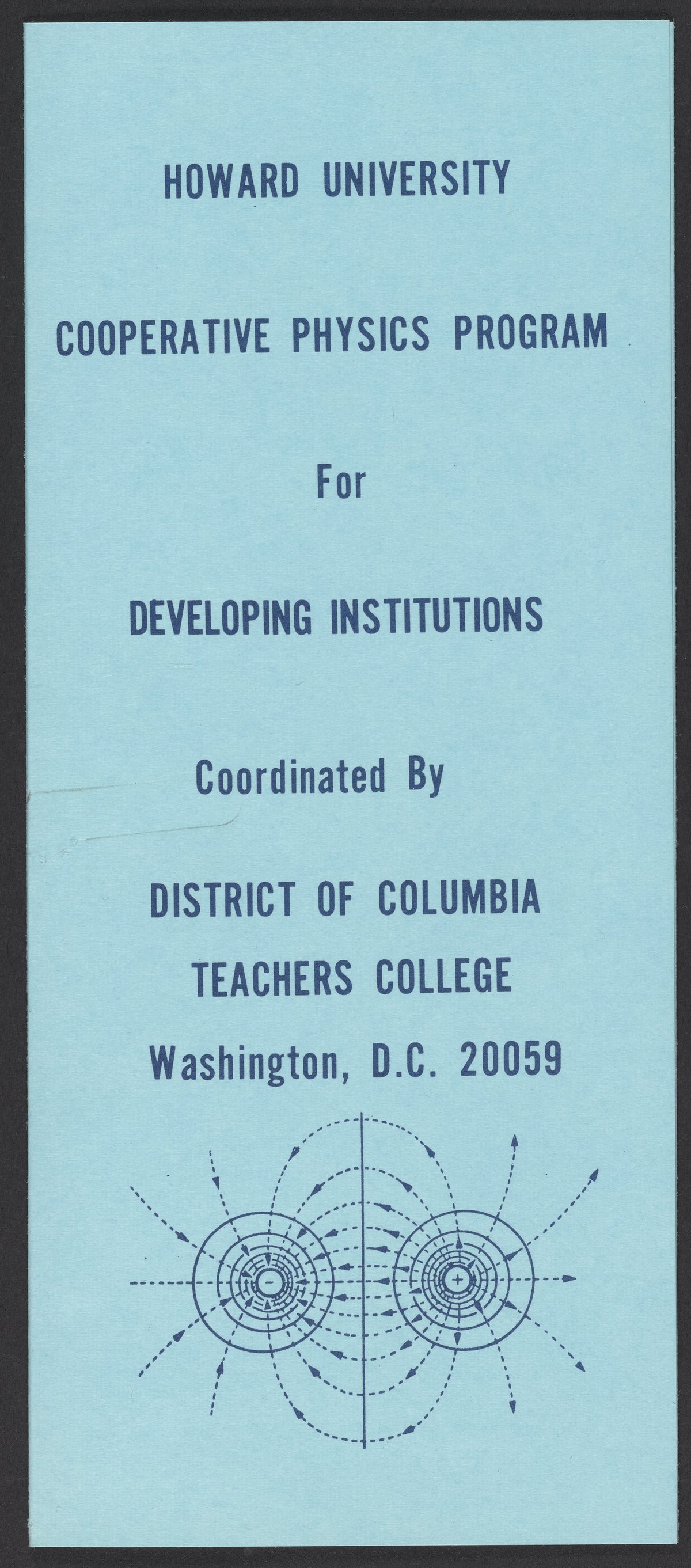 Brochure for Howard University's cooperative physics program for developing institutions, which brought students from colleges and universities that offered no minor or major in physics to Howard University for advanced undergraduate training in physics.