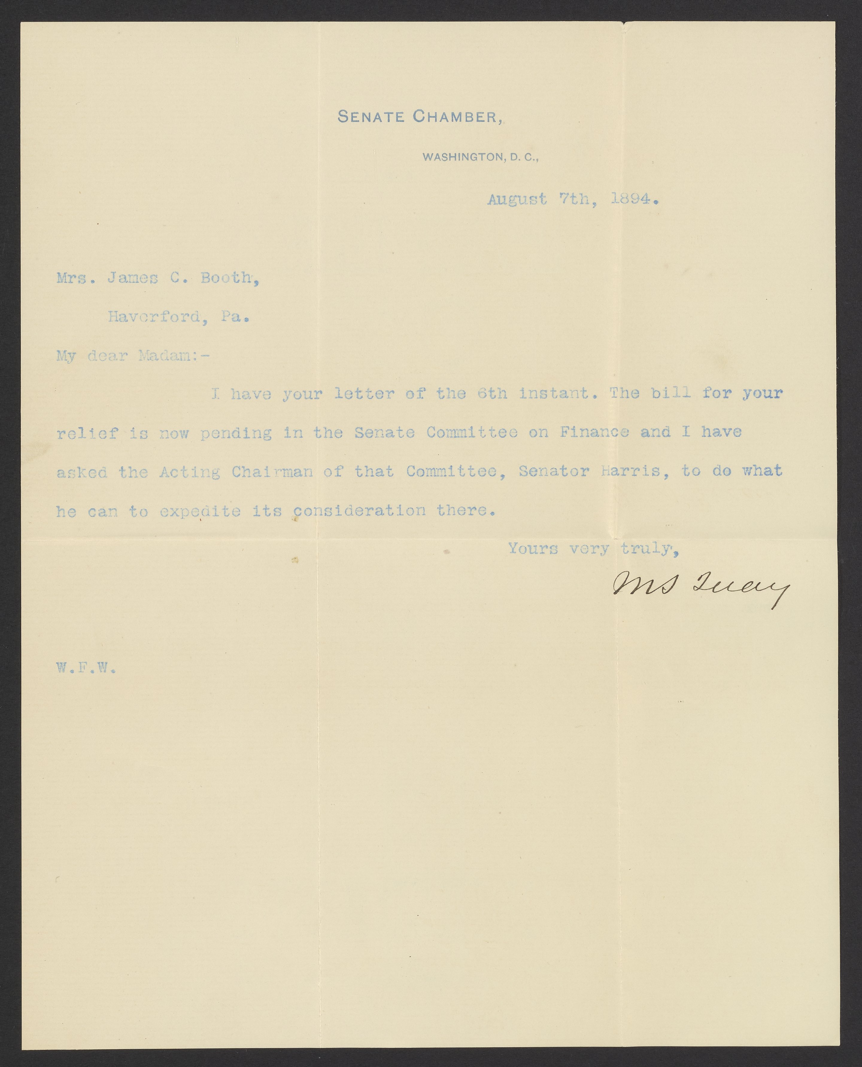 Matthew S. Quay (1833-1904) of the United States Senate writes to inform Margaret M. Booth née Cardeza that the bill for her relief is now pending and Acting Chairman of the Senate Committee on Finance, Senator Harris, will expedite its consideration.