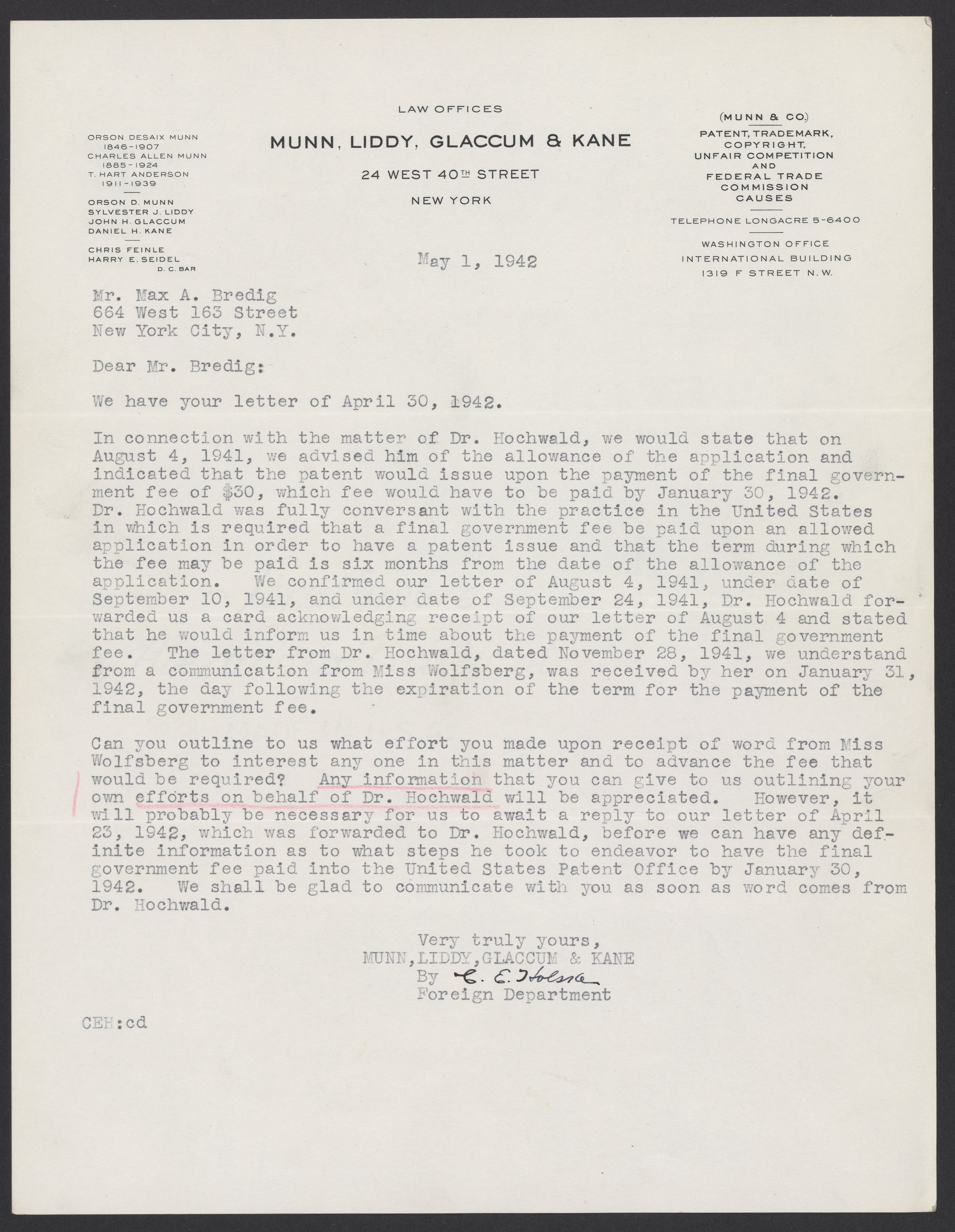 Clarence. E. Holske of Munn, Liddy, Glaccum, and Kane, a New York-based law firm, writes to Max Bredig (1902-1977) regarding the patent application of Fritz Hochwald (1897-1968). The firm has not received the government fee necessary to approve his application.