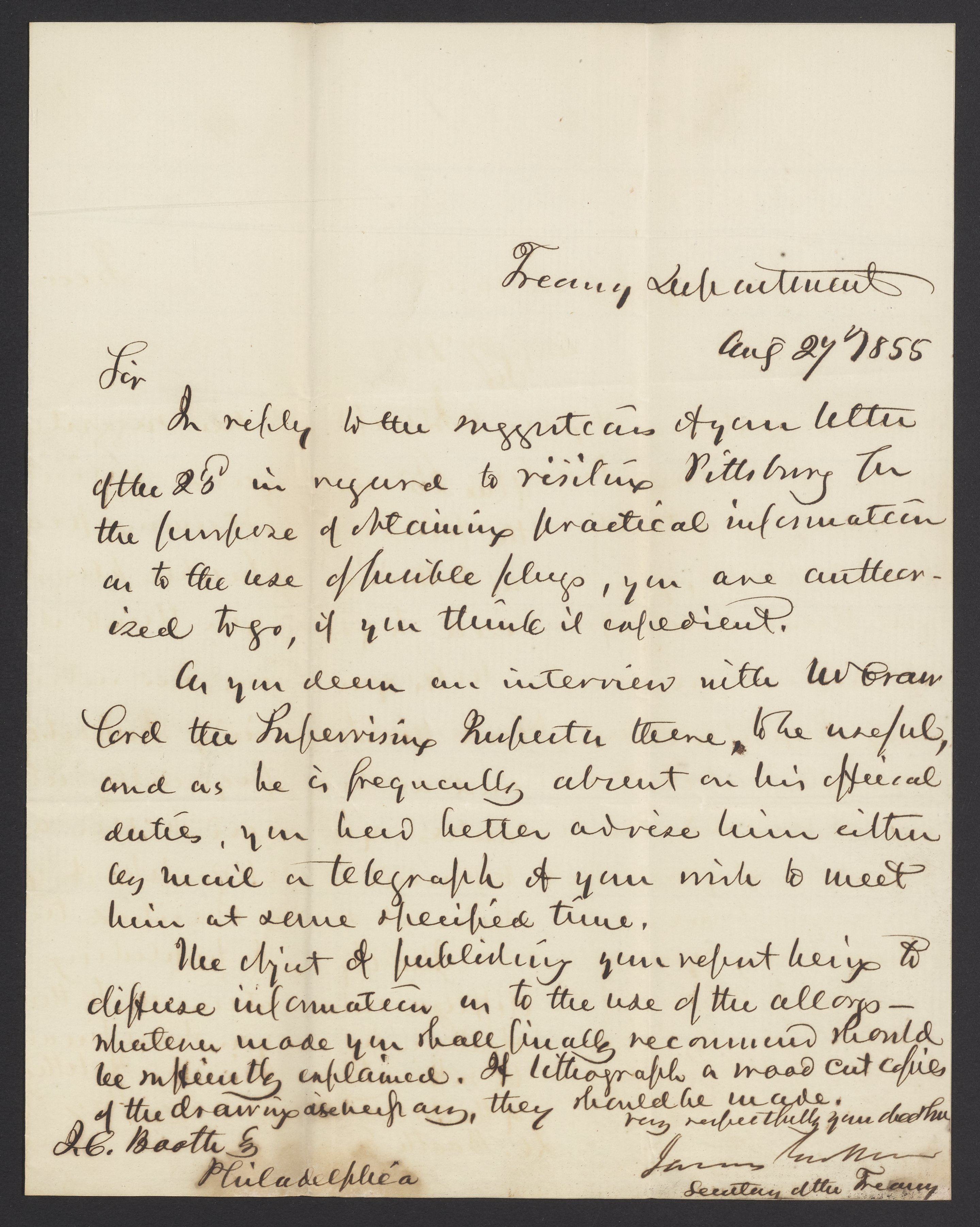 Small JPG1200 x 1502px — 253 KBLarge JPG2880 x 3604px — 1.0 MBFull-sized JPG3309 x 4141px — 1.3 MBOriginal fileTIFF — 3309 x 4141px — 39.3 MBJames B. Guthrie (1792 - 1869), United States Secretary of the Treasury from 1853-1857, writes to James Curtis Booth (1810-1888) authorizing Booth to take a trip to Pittsburgh to study practical uses for fusible alloys.