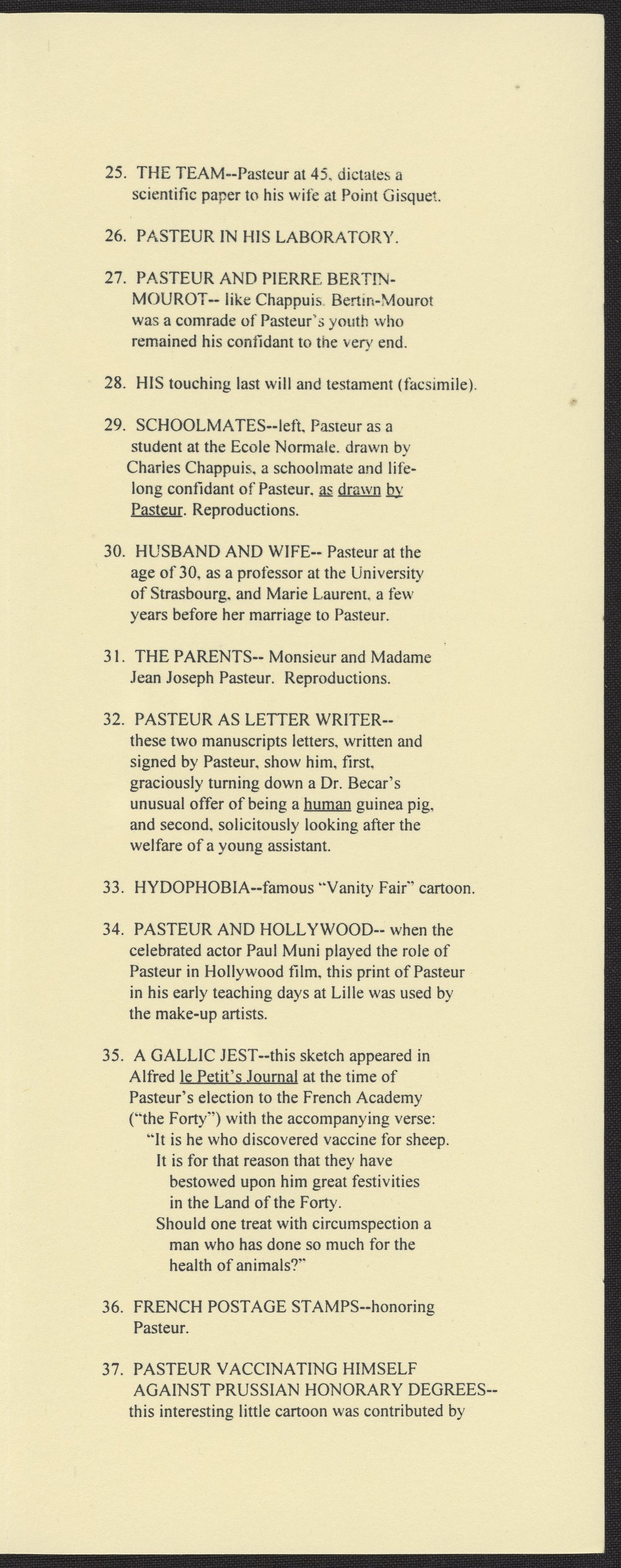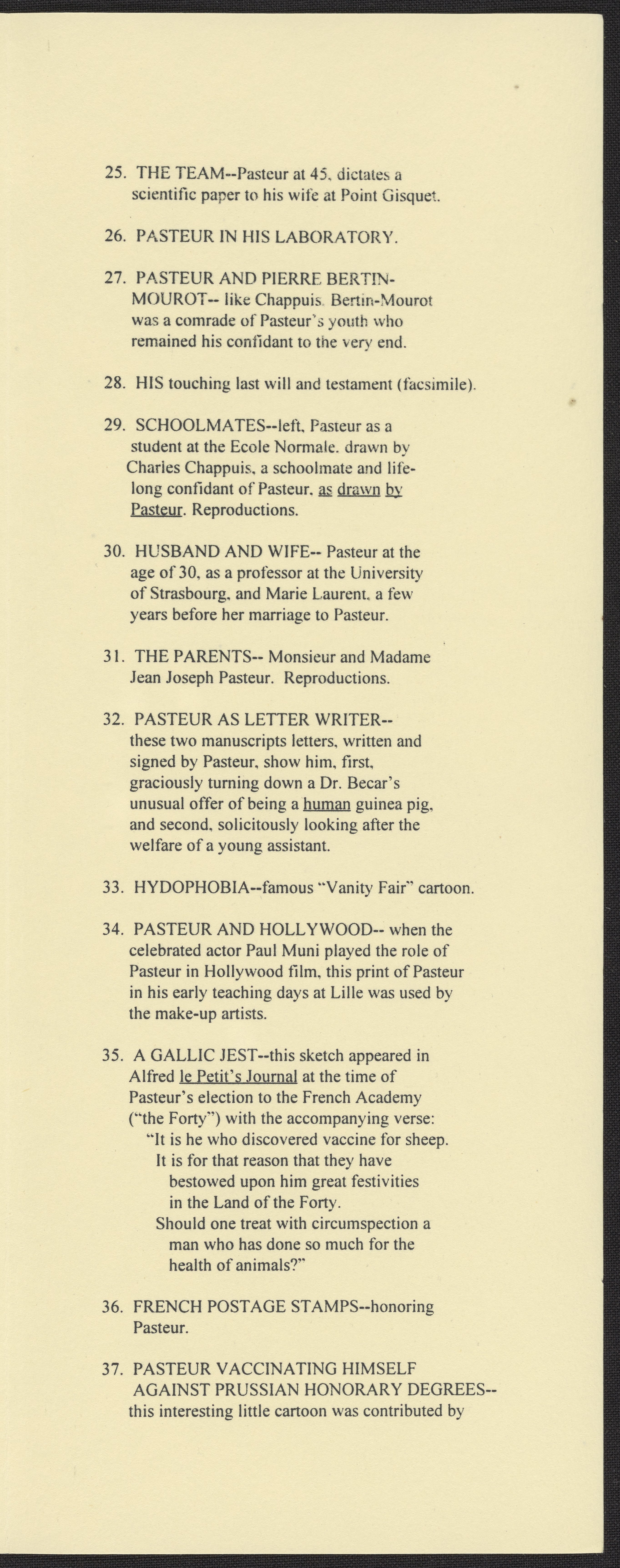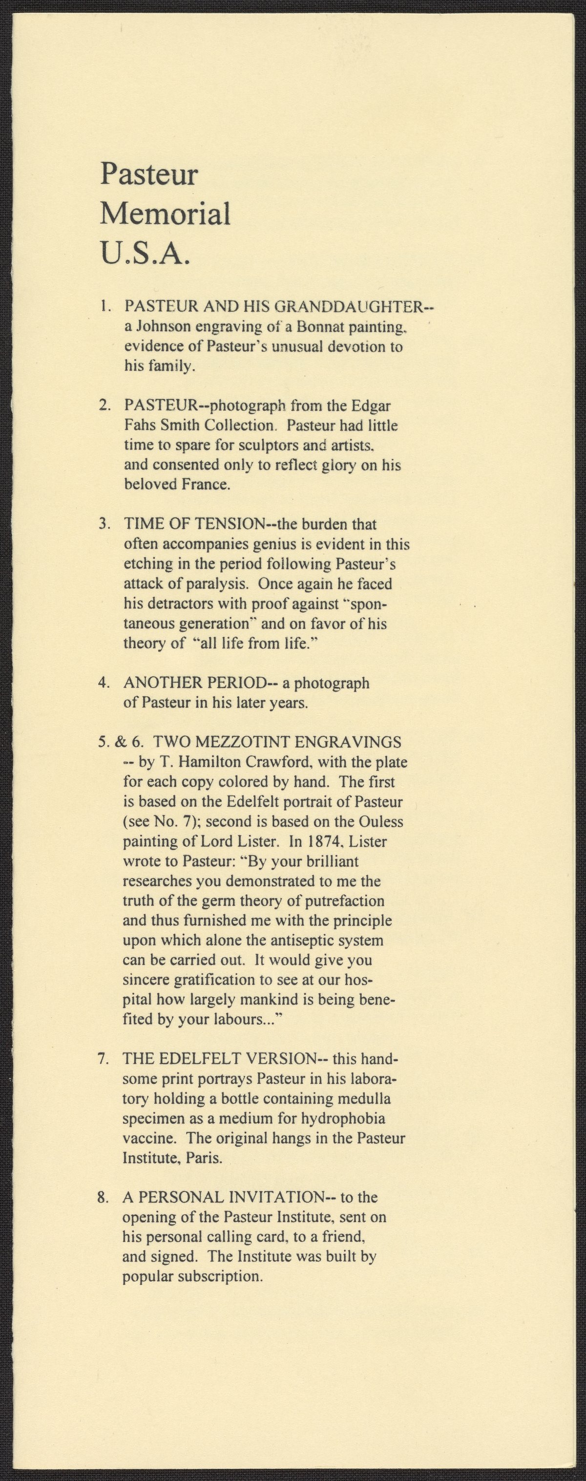 Small JPG1200 x 3031px — 549 KBFull-sized JPG2726 x 6886px — 2.6 MBOriginal fileTIFF — 2726 x 6886px — 53.7 MBCatalog for an exhibition of materials related to Louis Pasteur (1822-1895) believed to have been exhibited at the Fisher Scientific Company. Several entries have been digitized and can be found within the Fisher Pasteur Memorial Collection.