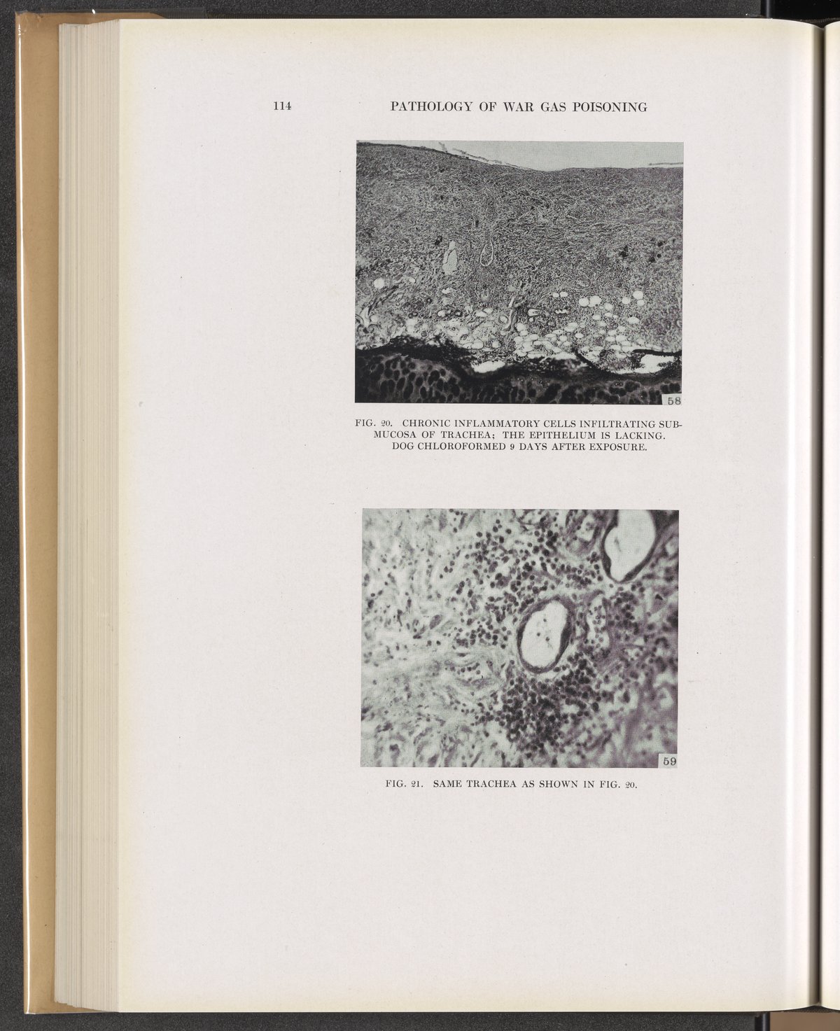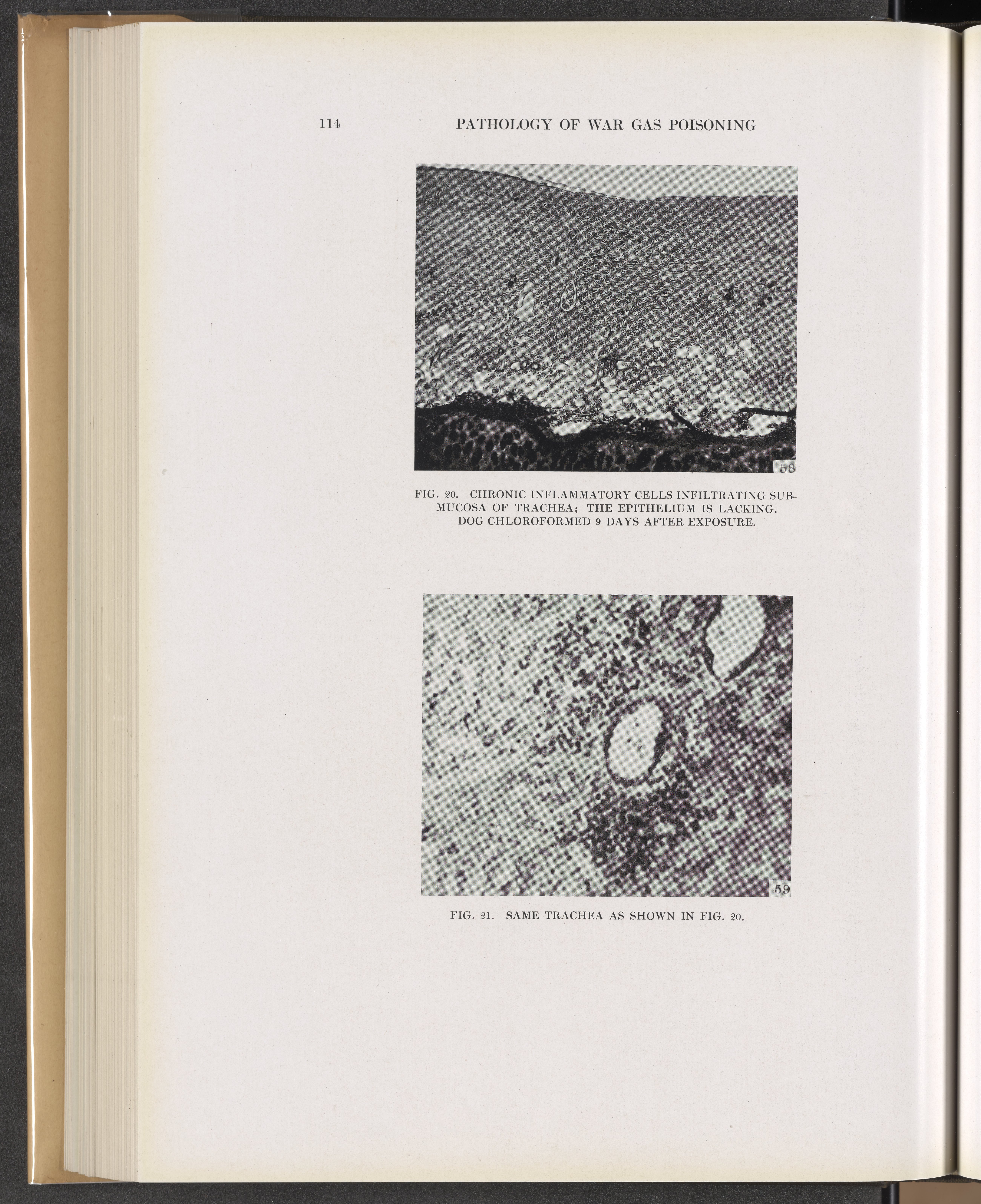 Winternitz, M. C. (Milton C.). “Fig. 20: Chronic Inflammatory Cells Infiltrating Submucosa of Trachea; the Epithelium Is Lacking. Fig. 21: Same Trachea as Shown in Fig. 20.” Collected Studies on the Pathology of War Gas Poisoning. New Haven, Connecticut: Yale University Press, 1920. https://digital.sciencehistory.org/works/ff365539k.
