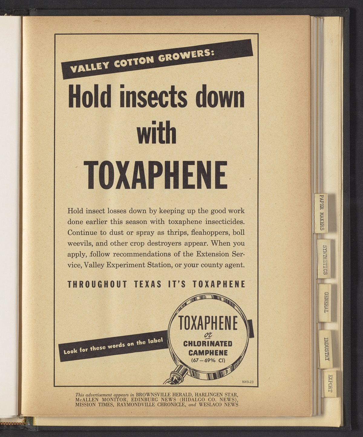 Hercules Incorporated. “Valley Cotton Growers: Hold Insects Down with Toxaphene.” 1949 Hercules Advertisements, 1949. Records of Hercules Incorporated, Volume 1949. Science History Institute. Philadelphia. https://digital.sciencehistory.org/works/ff365603d.