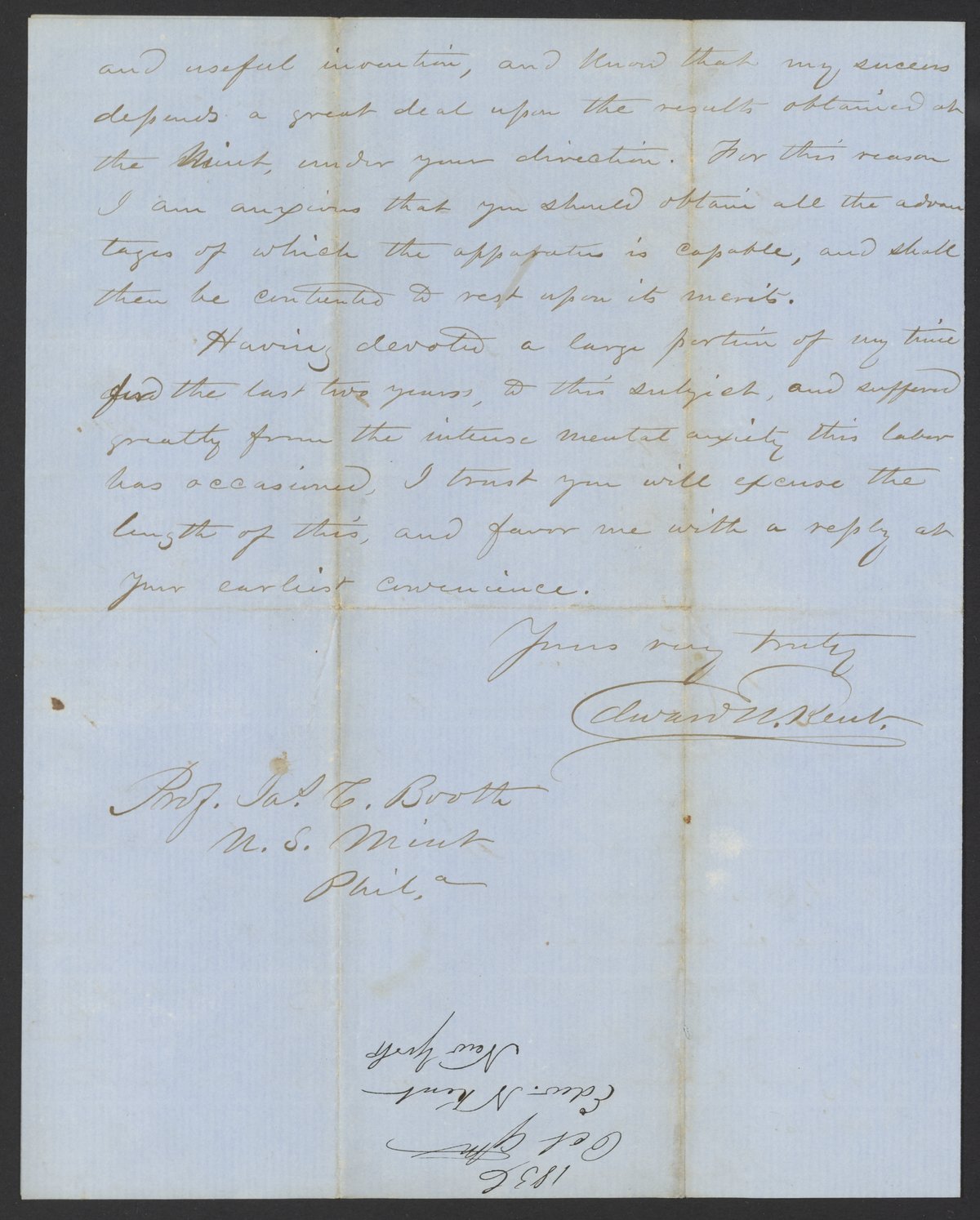 Letter from Edward N. Kent to James Curtis Booth, October 9, 1856