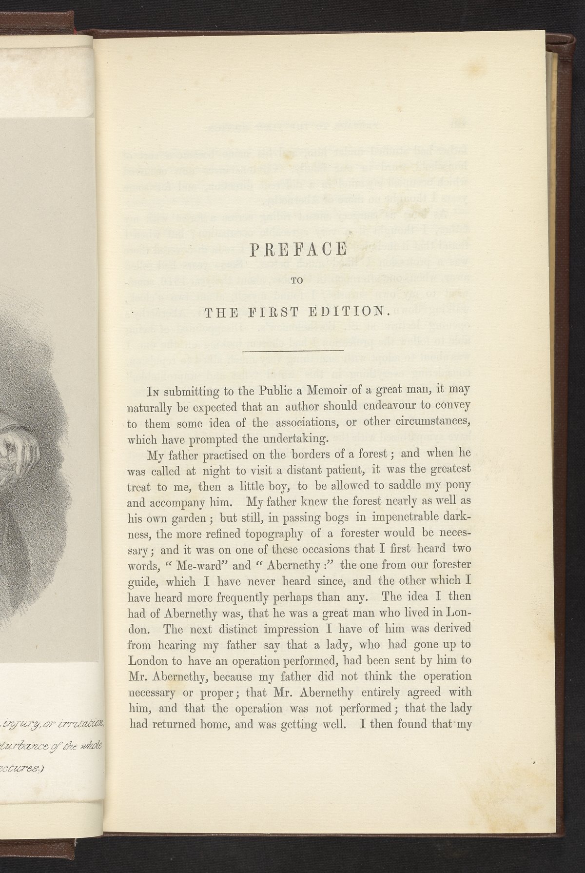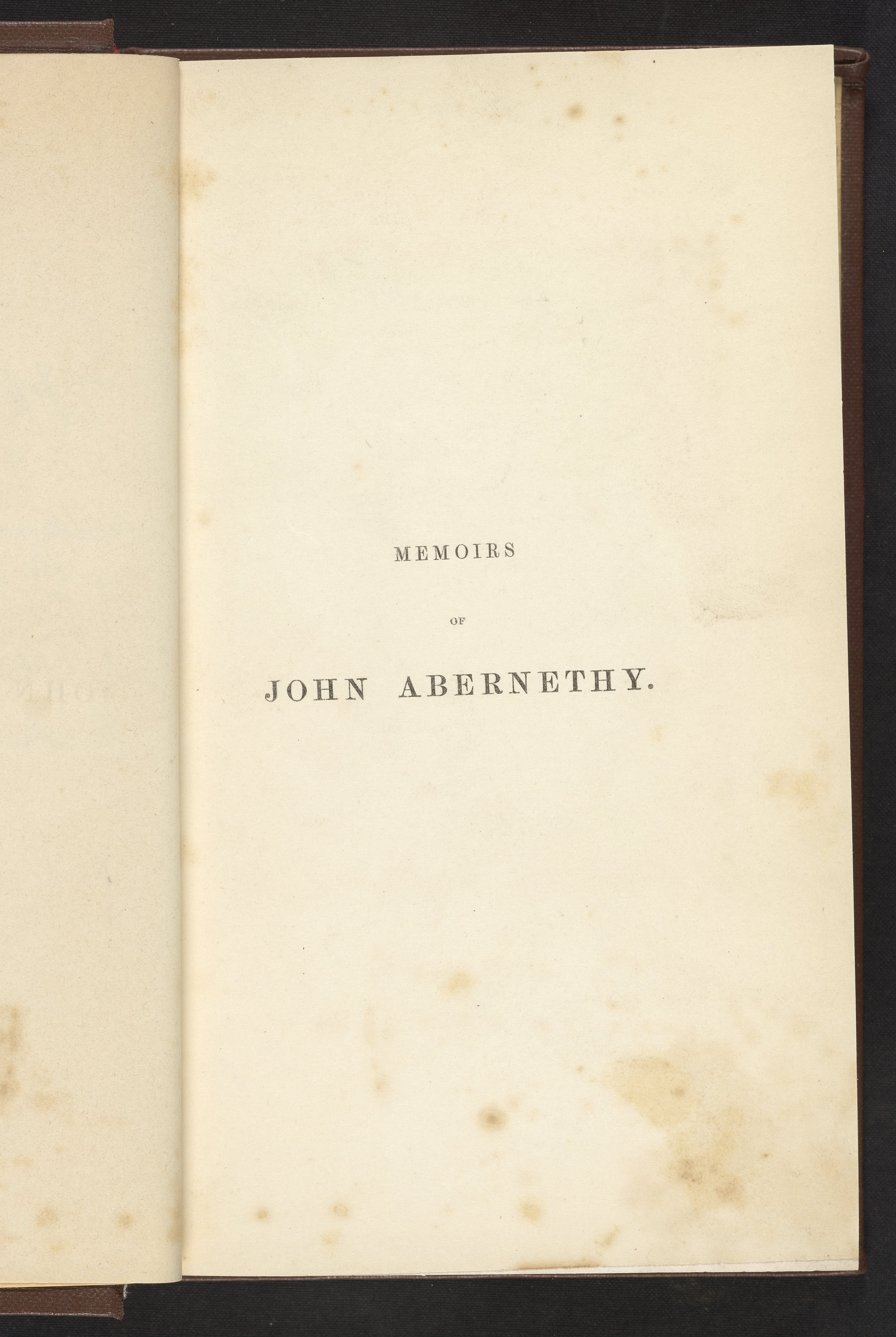 Small JPG1200 x 1790px — 296 KBLarge JPG2880 x 4295px — 1.9 MBFull-sized JPG3822 x 5700px — 3.2 MBOriginal fileTIFF — 3822 x 5700px — 62.4 MBCover, frontismatter and title page have been digitized from this biography of English surgeon John Abernethy (1764-1831). Abernethy invented the Abernethy biscuit as an aid for digestion. He wrote one of the earliest popular works on medical science intended to be read by patients.