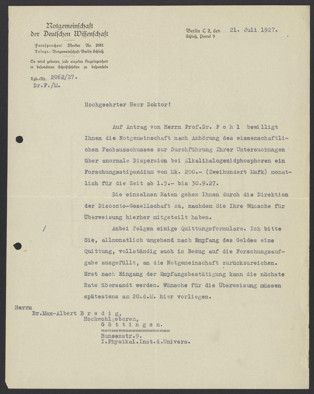 Letter from Friedrich Schmidt-Ott to Max Bredig, July 21, 1927