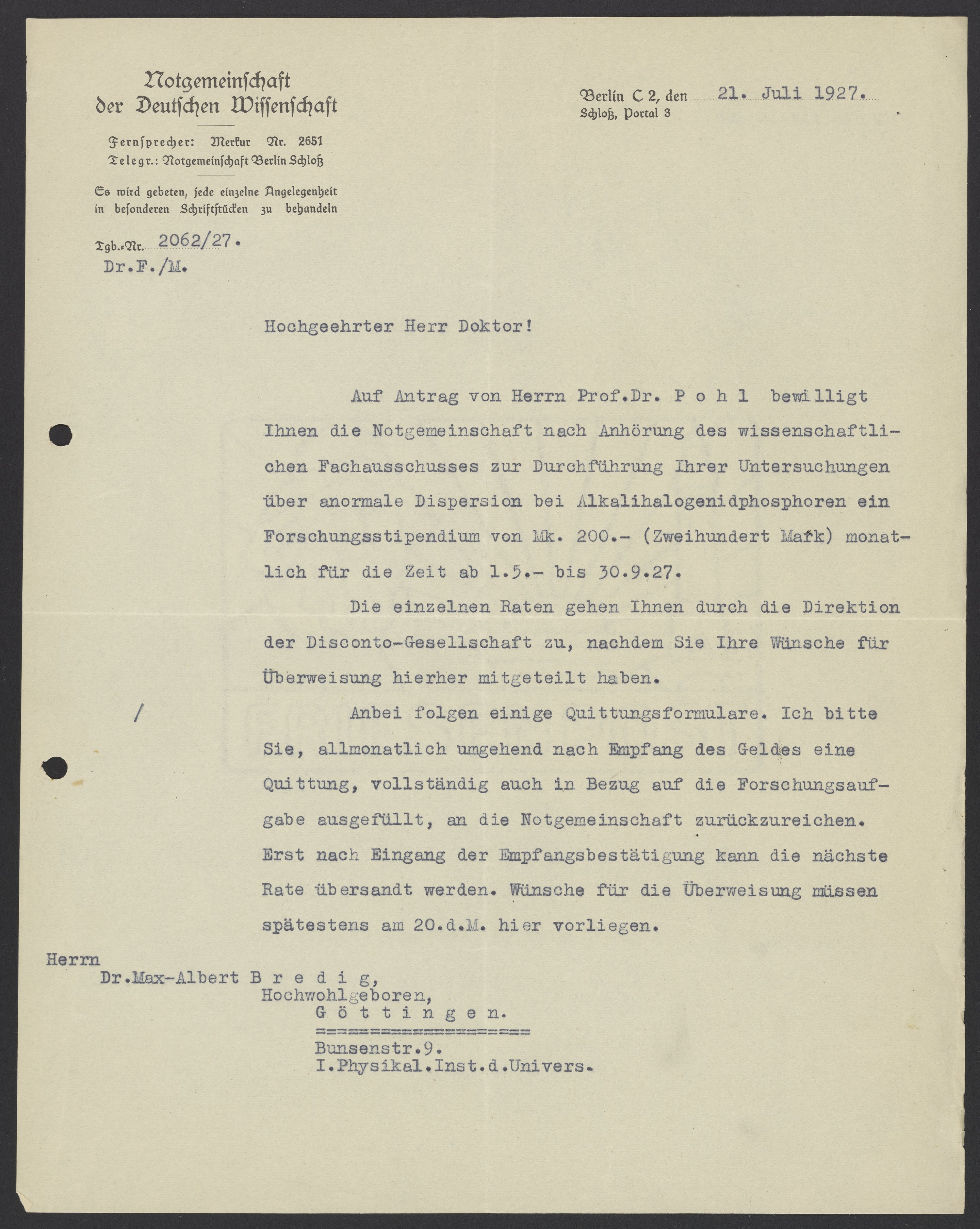 At the request of Professor Dr. Pohl and after hearing from the scientific expert committee, the German Science Funding Association approves a research grant of 200 Marks (two hundred marks) per month for the period of May 1 to September 30, 1927 to carry out research on abnormal dispersion in alkali halide phosphates.