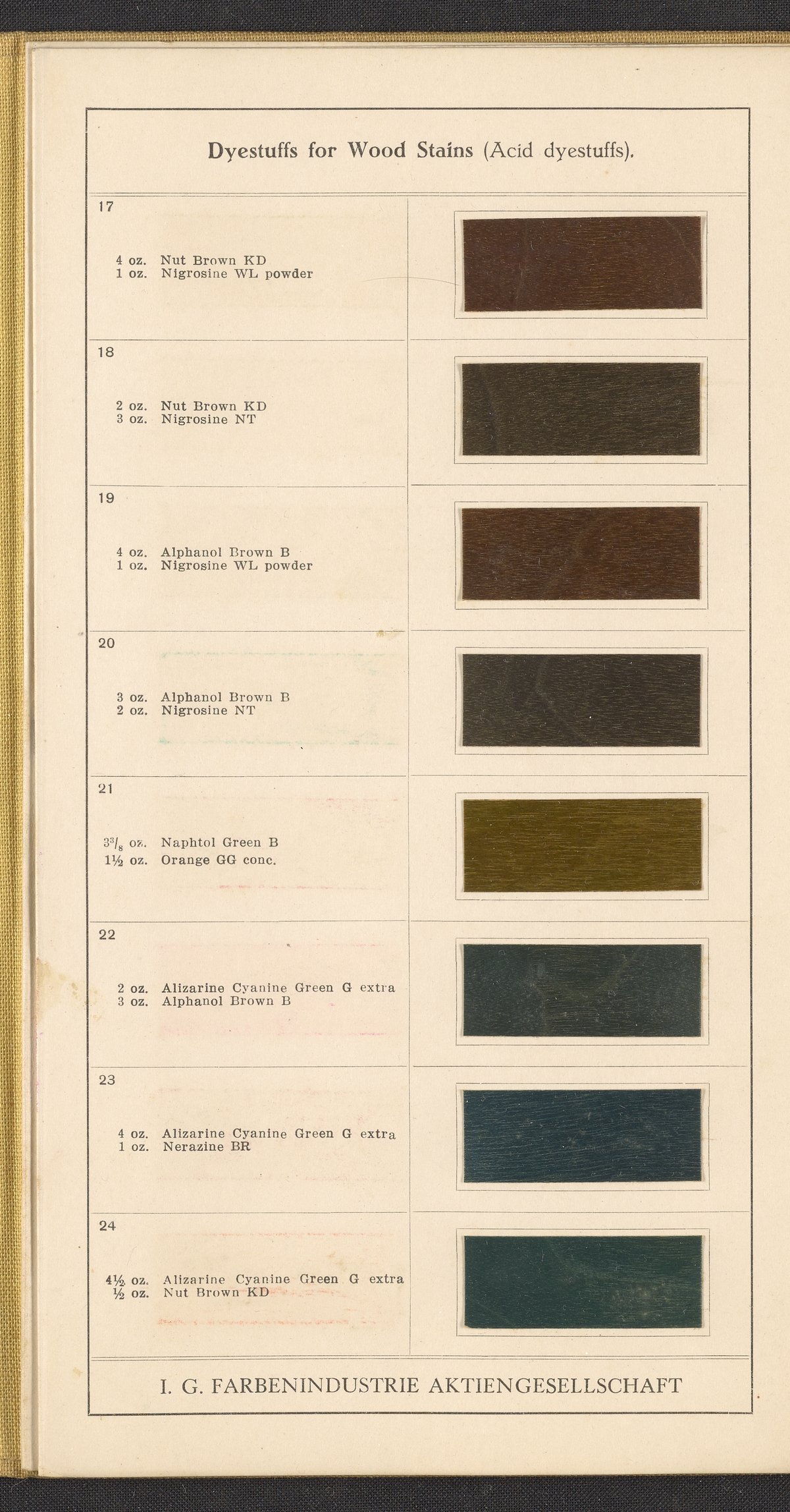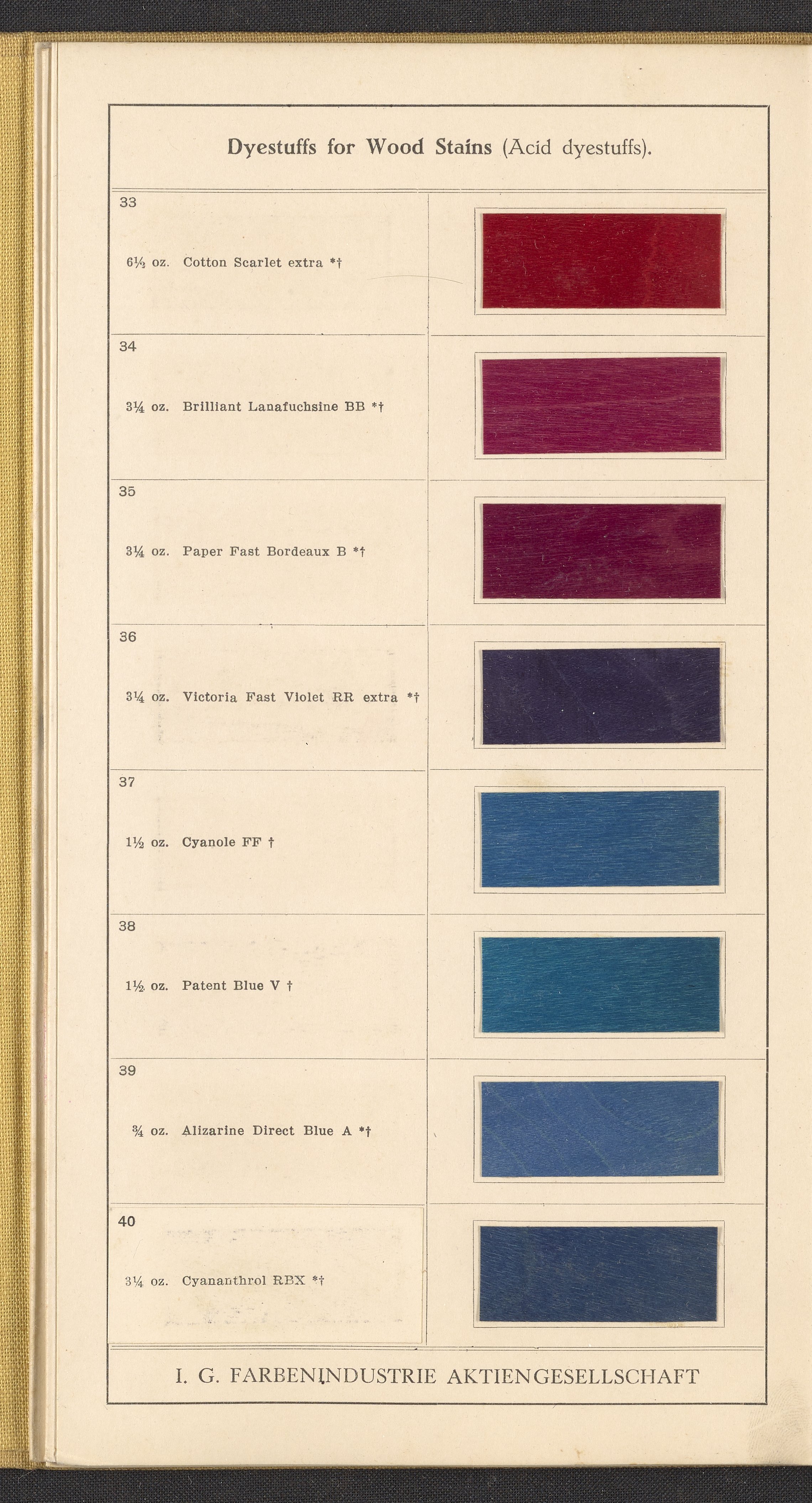 Small JPG1200 x 1992px — 868 KBFull-sized JPG2545 x 4225px — 3.2 MBOriginal fileTIFF — 2545 x 4225px — 30.8 MBSample book for dyeing solutions on wood from the Interessengemeinschaft Farbenindustrie Aktiengesellschaft, a German chemical and pharmaceutical conglomerate. Contains dyeing instructions and sixty-four mounted wood samples on accordion-folded pages. Digital content includes all pages and a representative image of the full foldout.