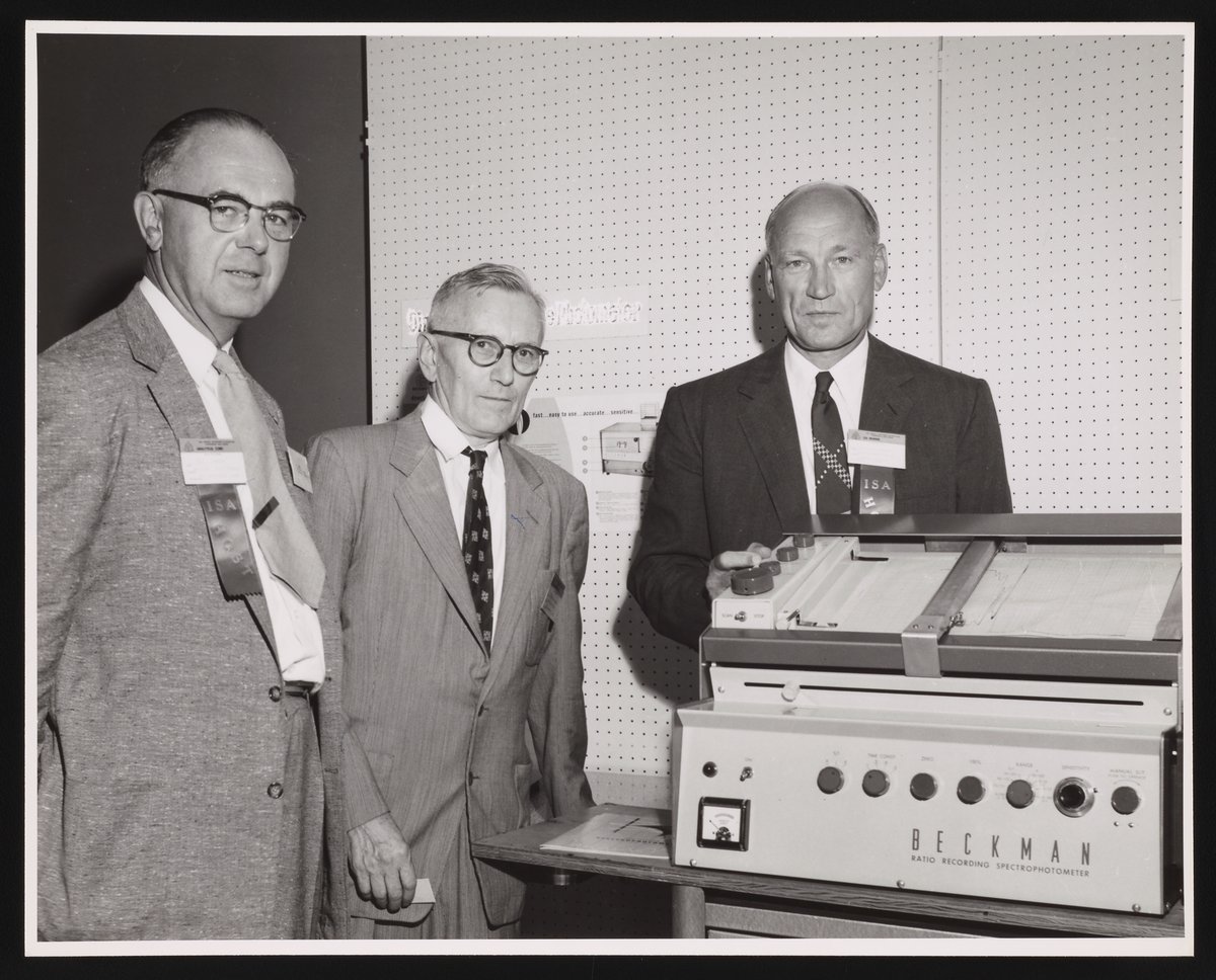“Robert T. Sheen, W. G. Brombacher, and Arnold O. Beckman with a Ratio Recording Spectrophotometer,” September 15, 1955. Beckman Historical Collection, Box 55, Folder 123. Science History Institute. Philadelphia. https://digital.sciencehistory.org/works/fj236210v.