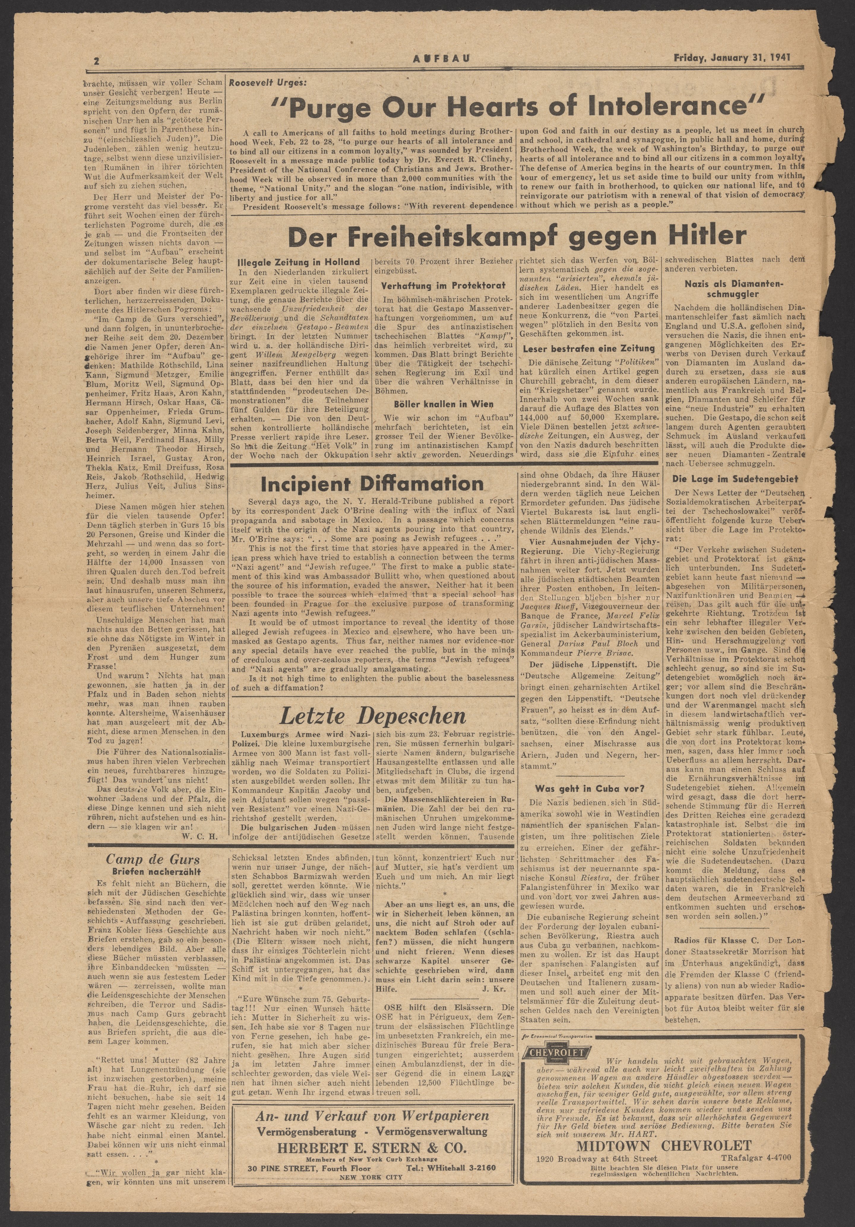 Small JPG1200 x 1722px — 529 KBLarge JPG2880 x 4133px — 2.7 MBFull-sized JPG7307 x 10486px — 14.9 MBOriginal fileTIFF — 7307 x 10486px — 219 MBFront page of Aufbau, a periodical which began publication in 1934 as a newsletter for the German-Jewish Club of New York. In the beginning, the newspaper contained mostly news about club activities, articles about Jewish culture and contemporary events, and helpful facts for Jewish refugees. Over time, its articles focused more and more on international events and especially the treatment of Jews in Germany. Aufbau became one of the leading anti-Nazi publications of the German press in exile. From September 1944 through September 1946, the Aufbau printed numerous lists of Jewish Holocaust survivors located in Europe, as well as a few lists of victims.