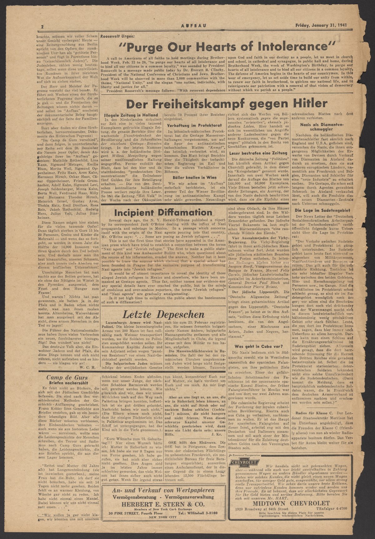 “Aufbau, Volume 7, Number 5.” Aufbau (New York, N.Y.), January 31, 1941. Papers of Max Bredig, Box 8, Folder 8. Science History Institute. Philadelphia. https://digital.sciencehistory.org/works/fj5h1tg.