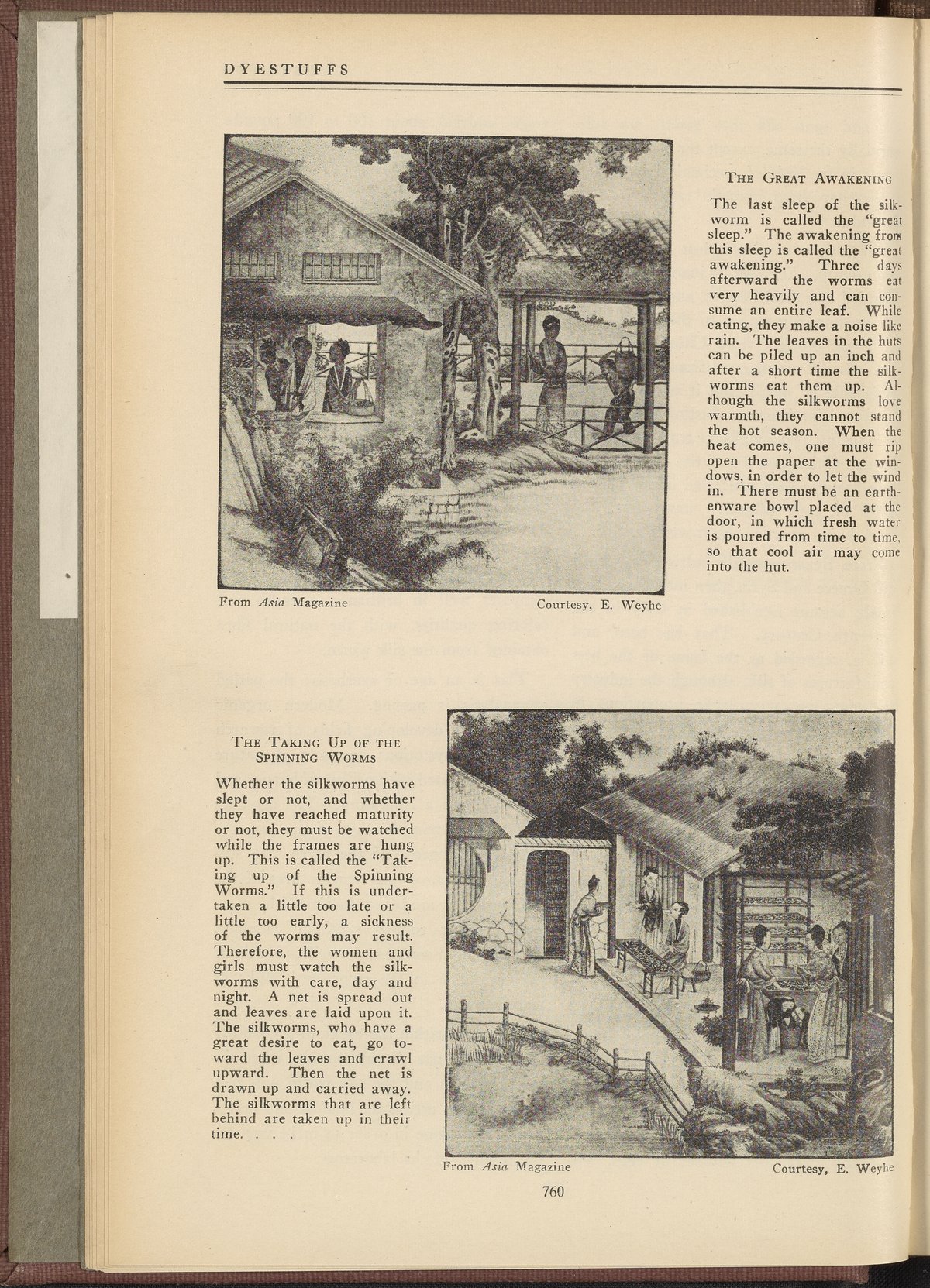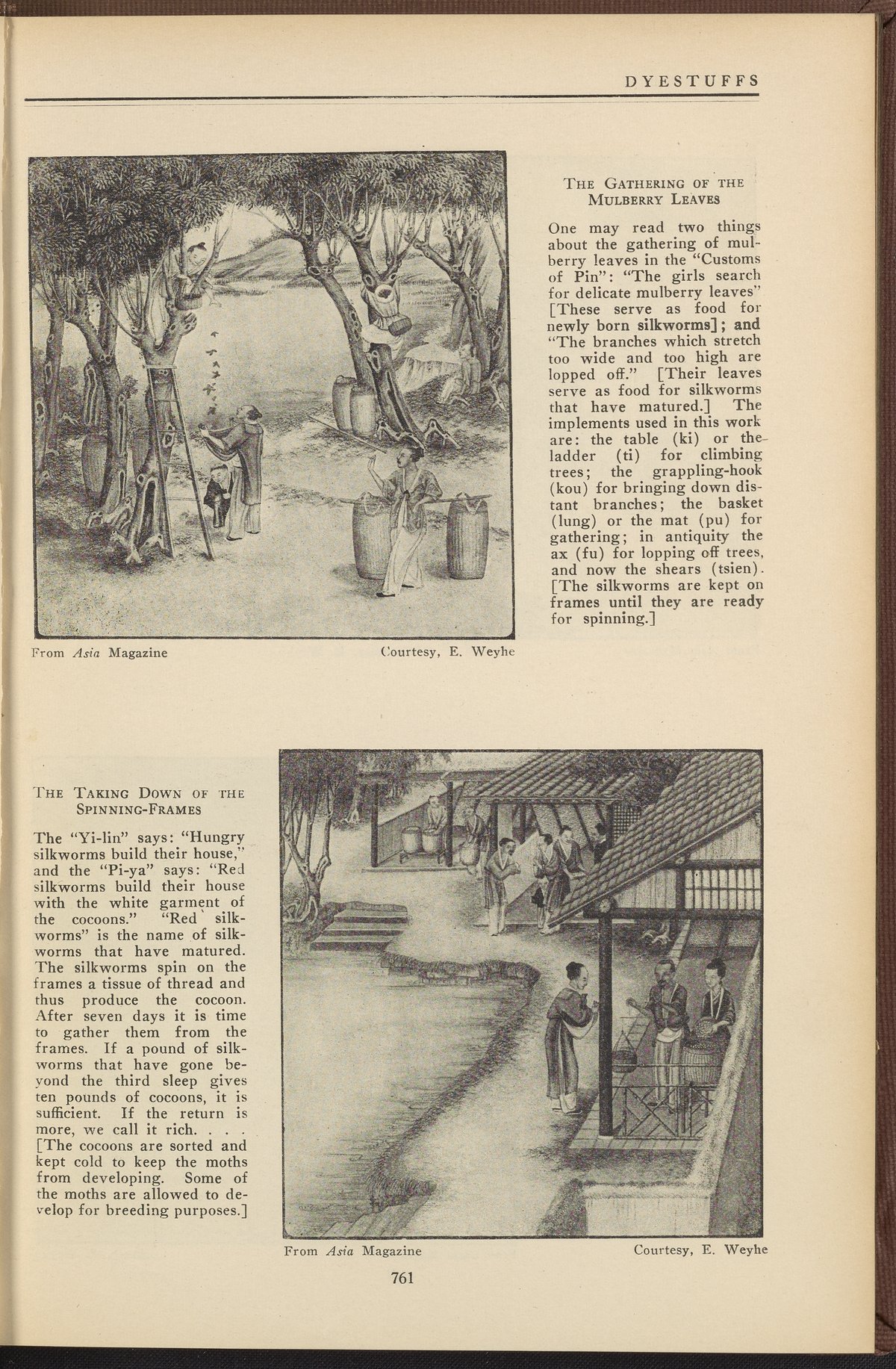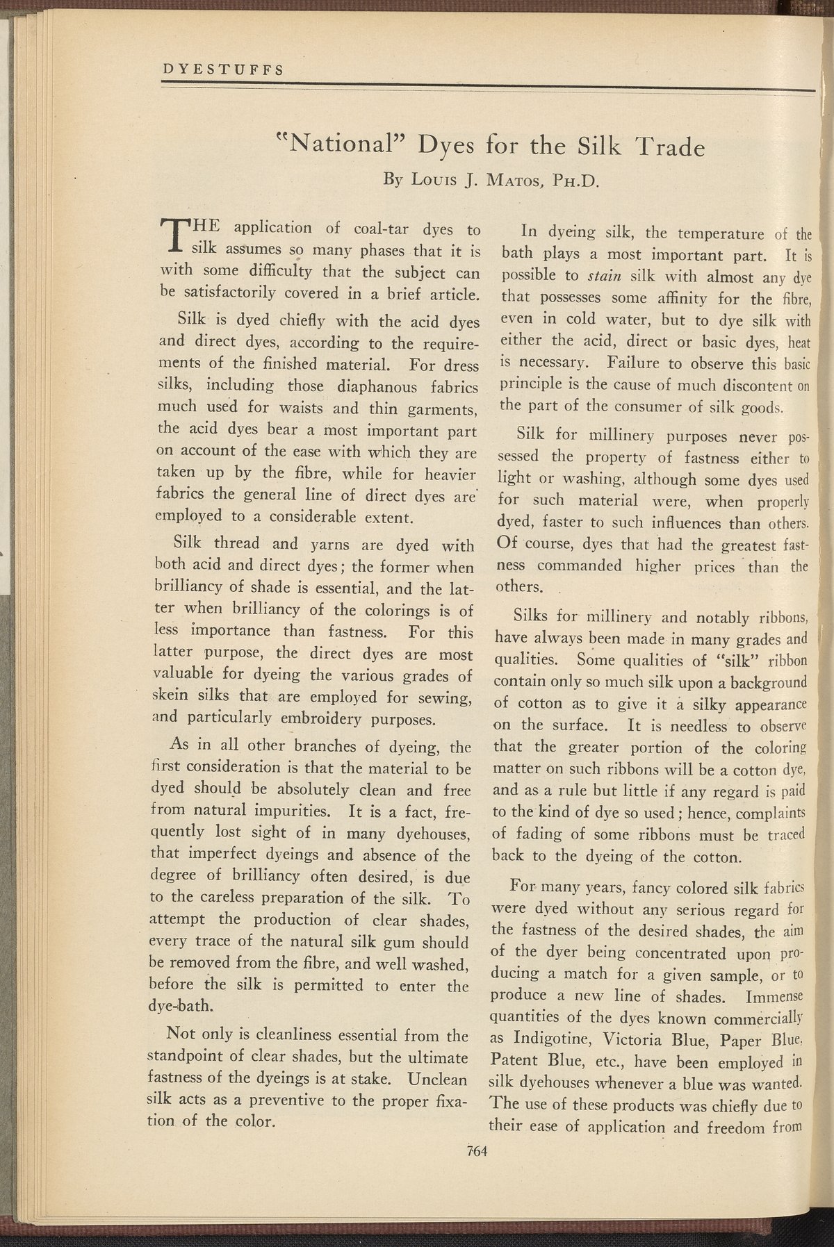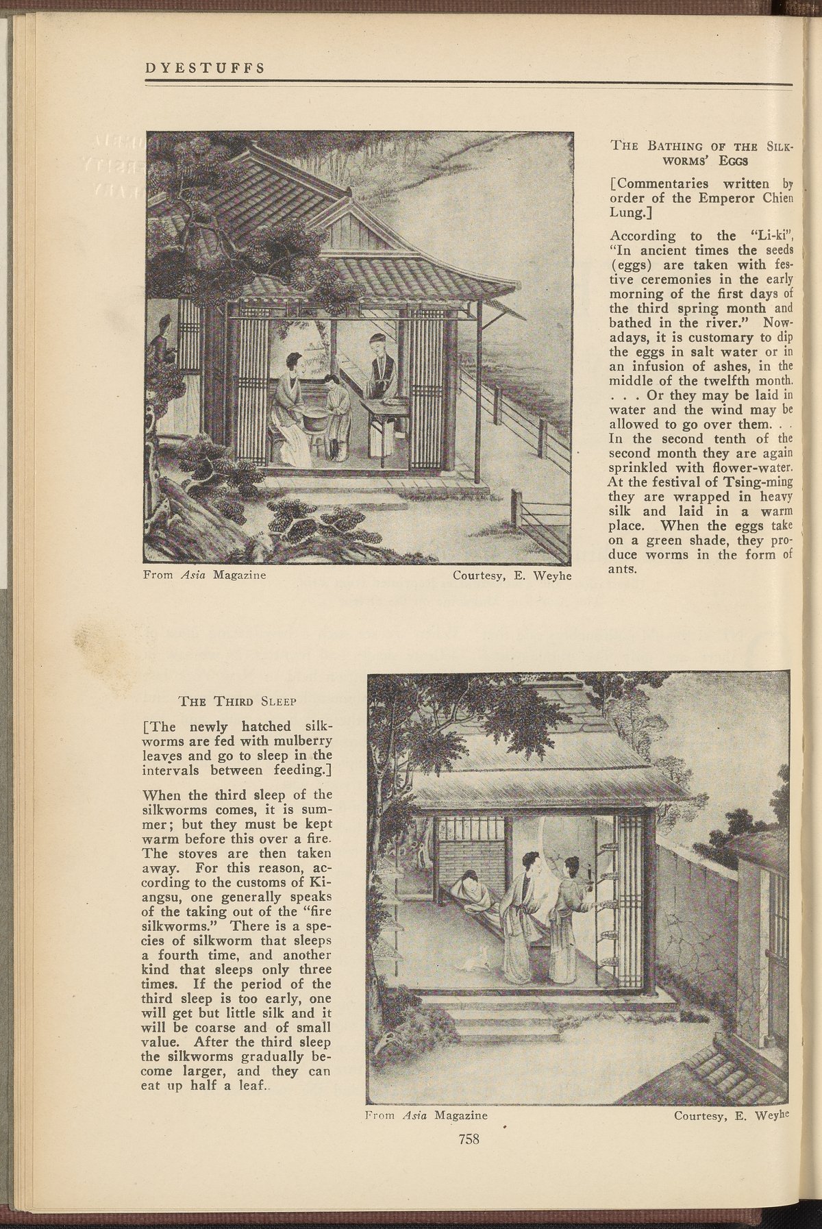 The journal contains reprints of select articles from periodicals in the dyeing and textile fields. This issue focuses on silk dying. Contains articles such as An Old Chinese Story of the Origin of Silk from The American Magazine on the Orient; "National" Dyes for the Silk Trade by Louis J. Matos; Dyeing Artificial Silk from The Textile Recorder; Buffalo Dye Plant Endeavors to Set High Standards of Production by M. D. C. Crawford from The Daily News Record; and Waterproofing Artificial Silk from Textiles. This issue includes black and white printed illustrations. Digitized content does not include the final page of the issue due the fragility of the physical work.