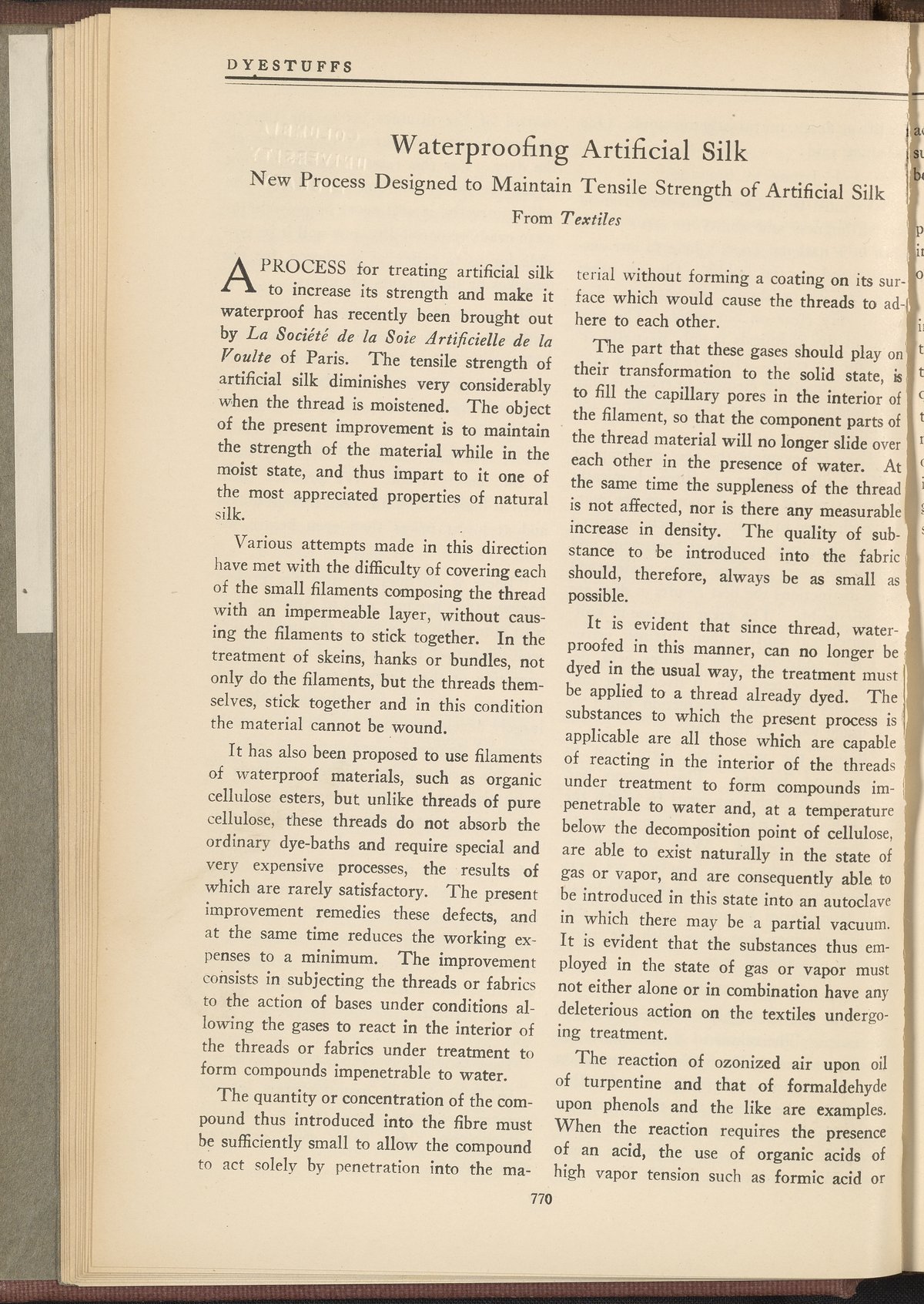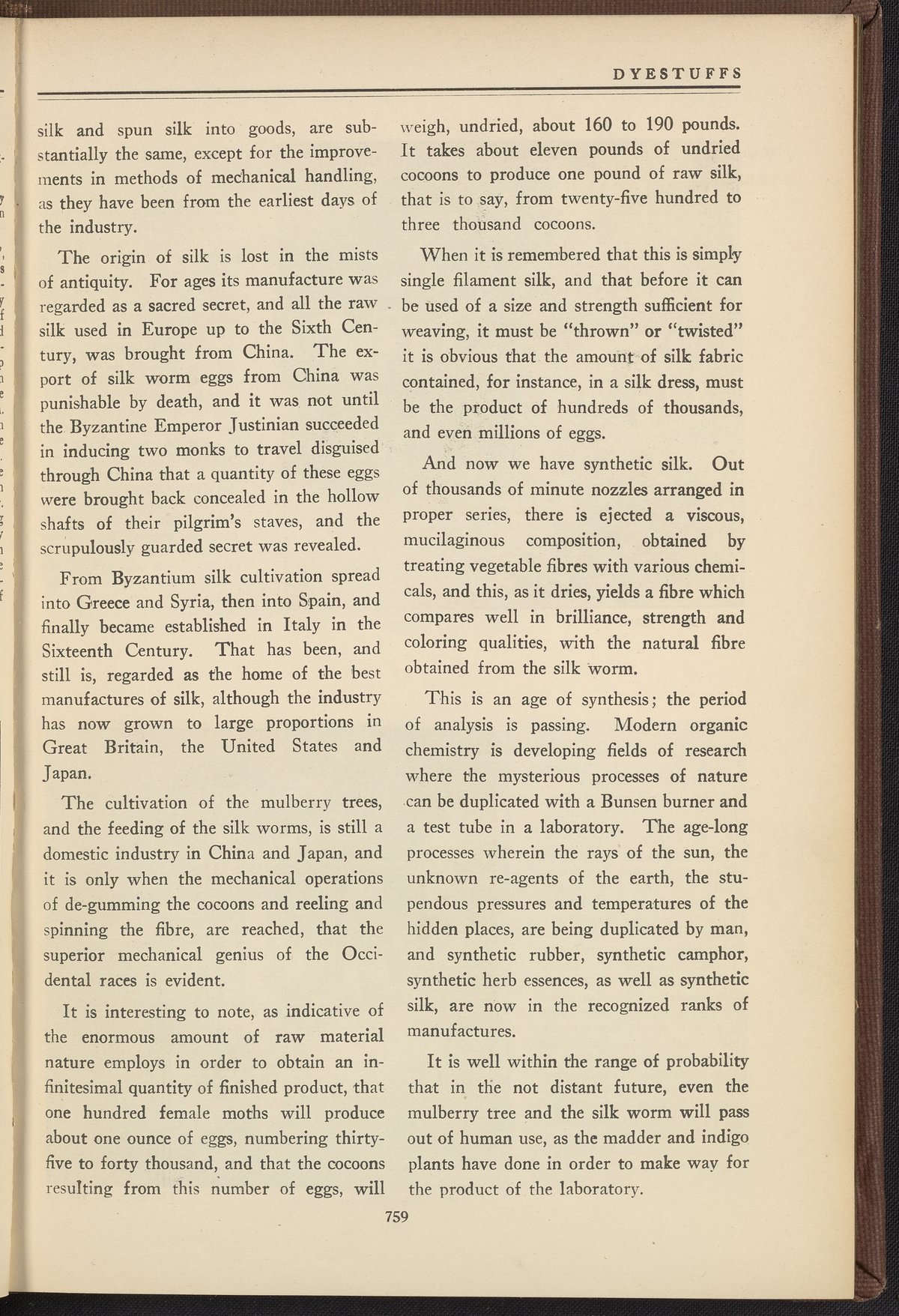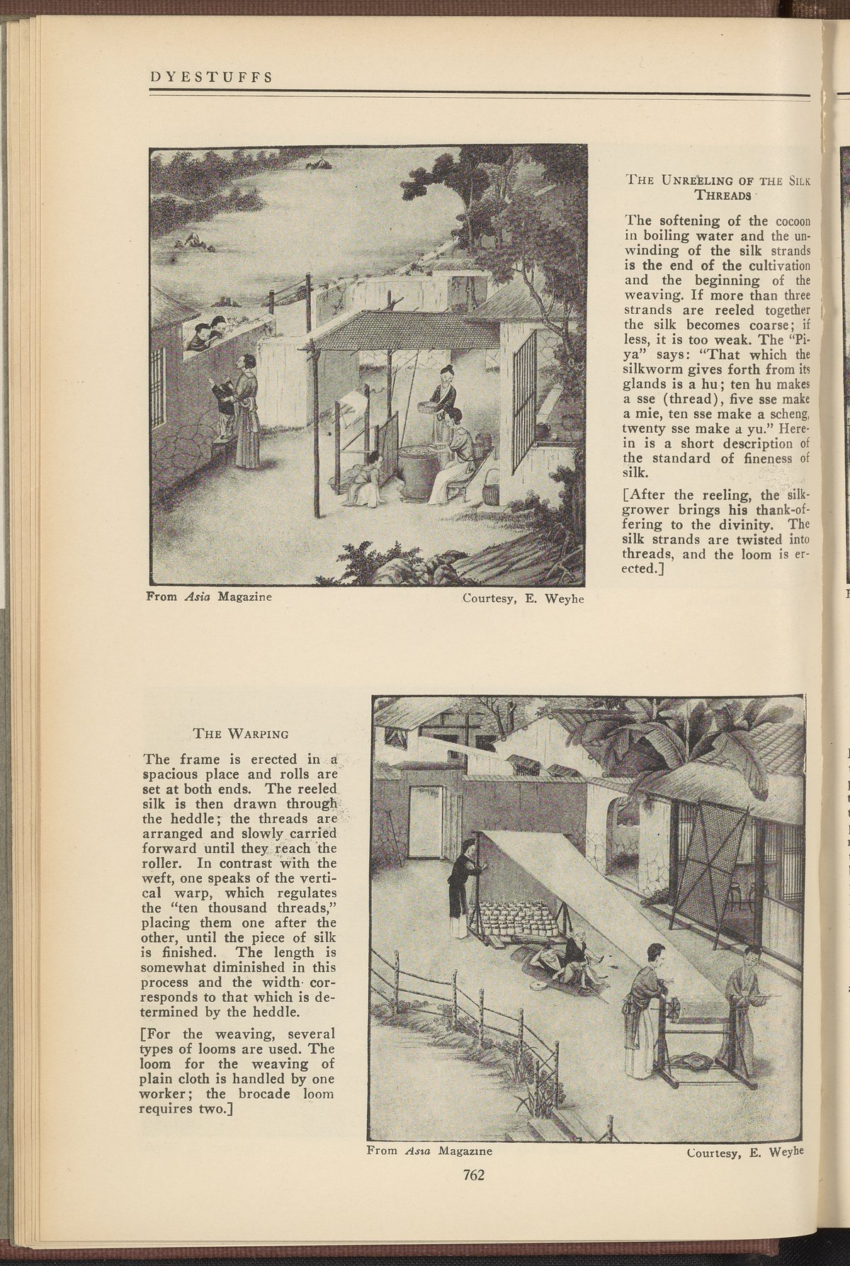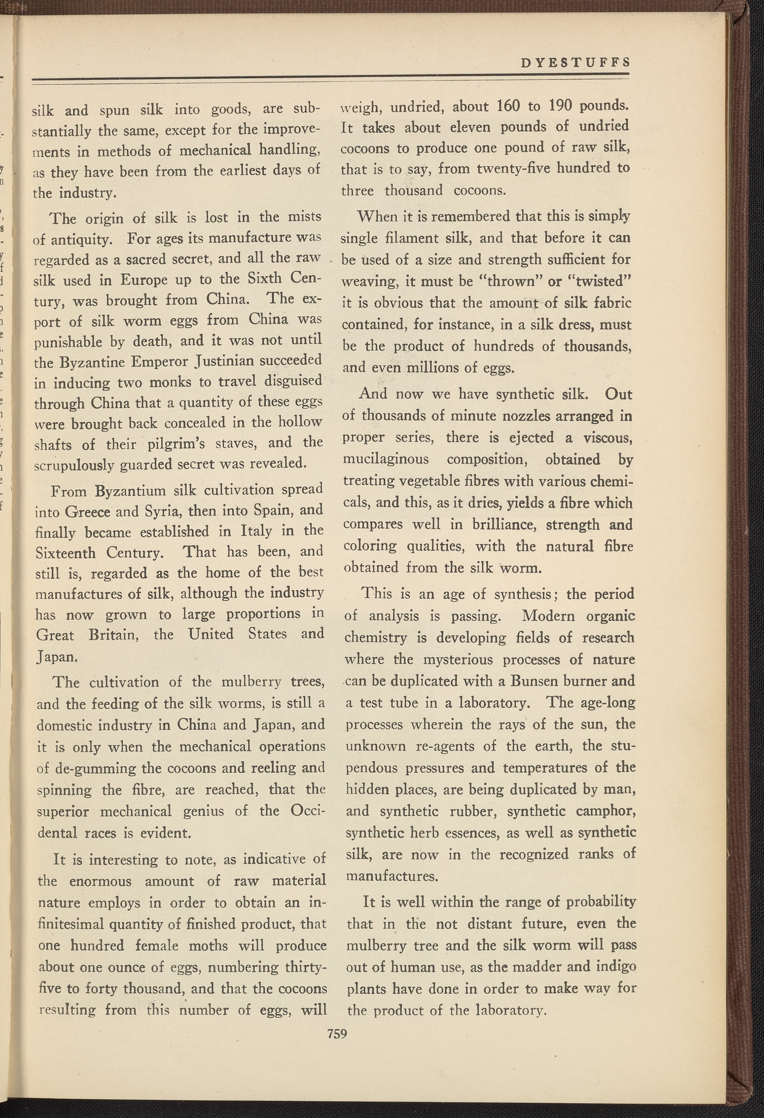 The journal contains reprints of select articles from periodicals in the dyeing and textile fields. This issue focuses on silk dying. Contains articles such as An Old Chinese Story of the Origin of Silk from The American Magazine on the Orient; "National" Dyes for the Silk Trade by Louis J. Matos; Dyeing Artificial Silk from The Textile Recorder; Buffalo Dye Plant Endeavors to Set High Standards of Production by M. D. C. Crawford from The Daily News Record; and Waterproofing Artificial Silk from Textiles. This issue includes black and white printed illustrations. Digitized content does not include the final page of the issue due the fragility of the physical work.