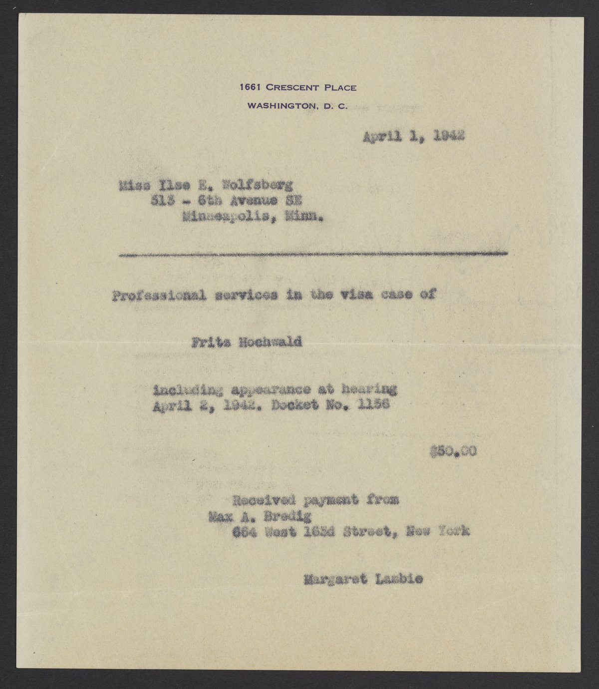 Letter from Margaret Lambie to Ilse Wolfsberg, April 1, 1942
