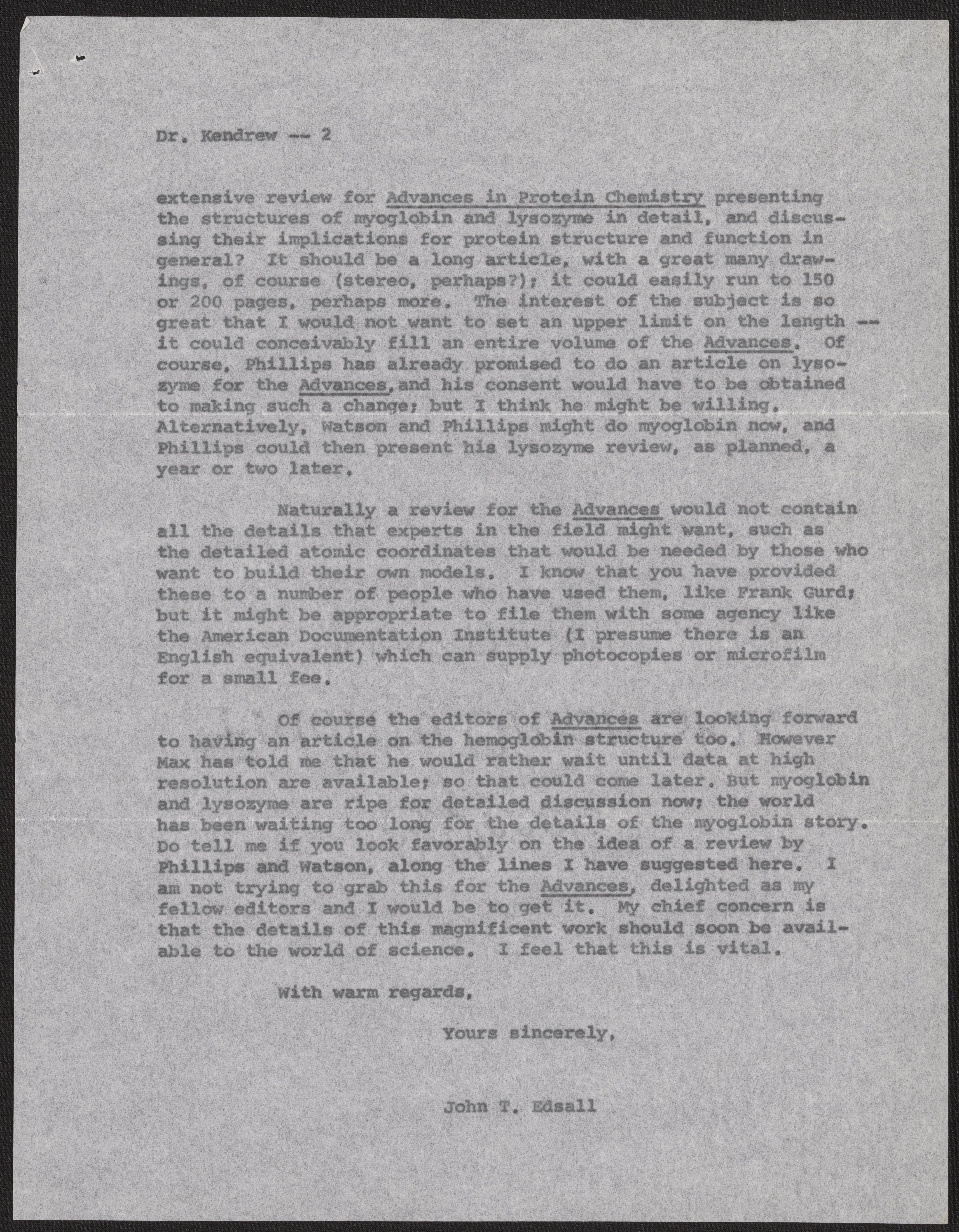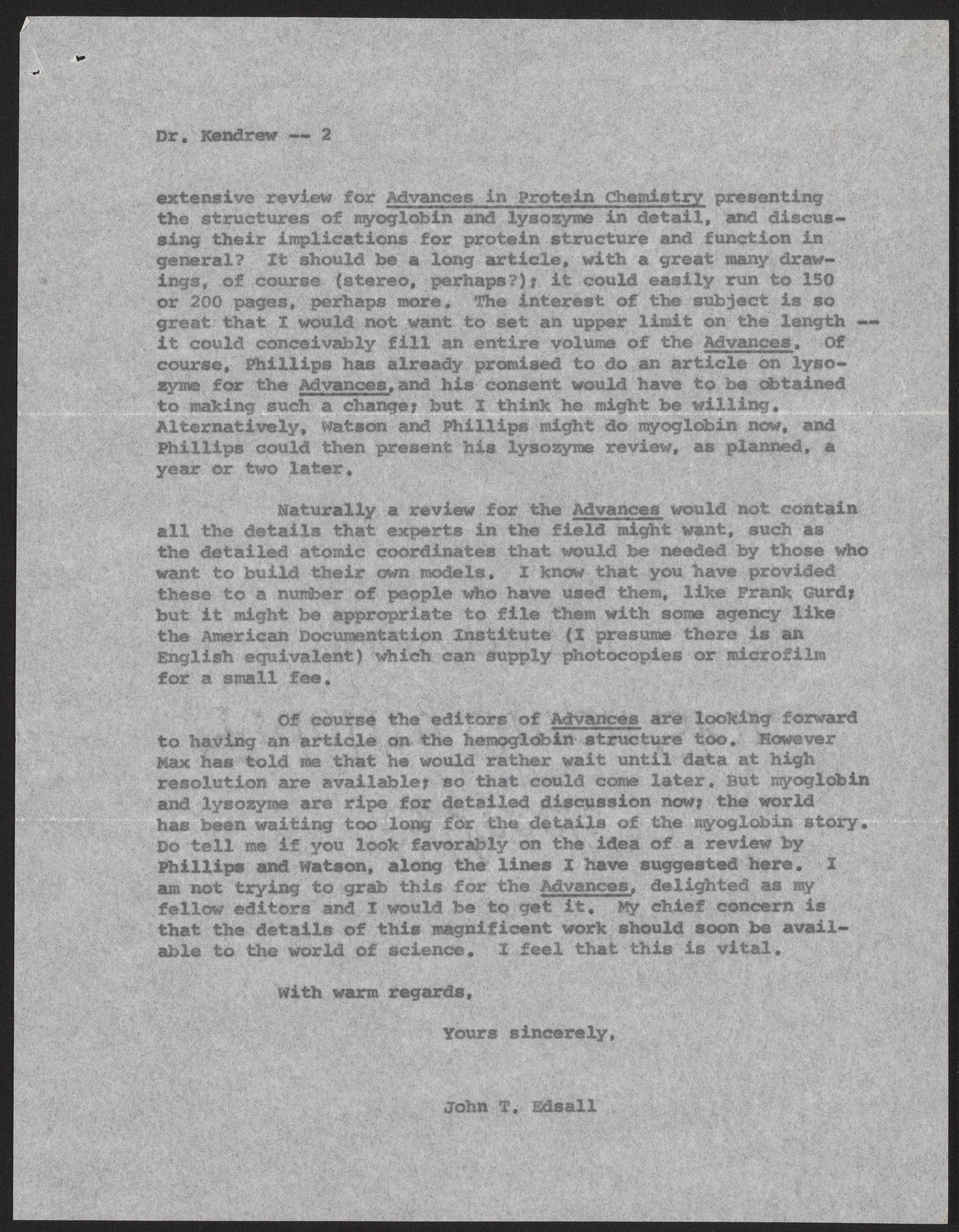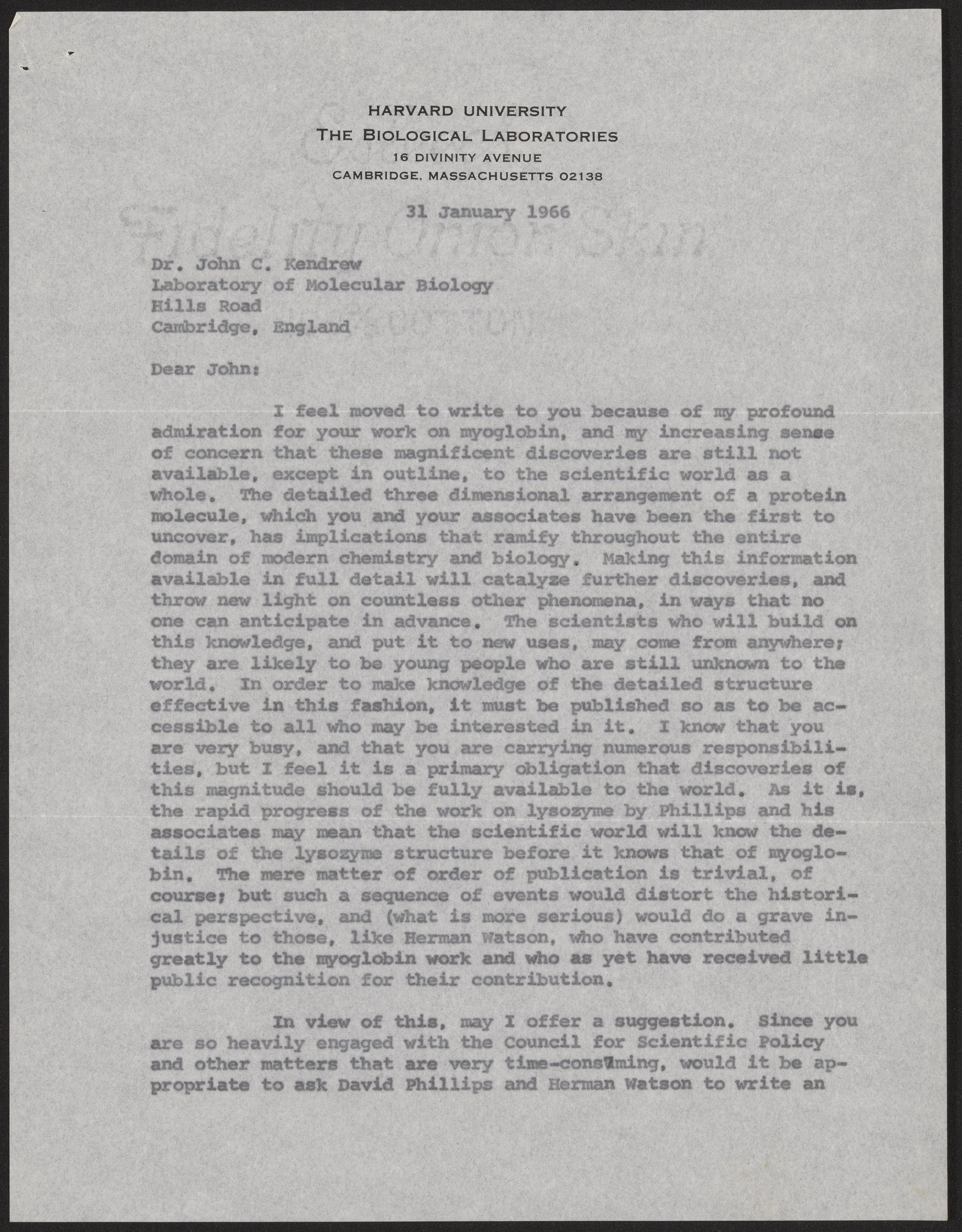 Letter from John T. Edsall to John Kendrew, January 31, 1966