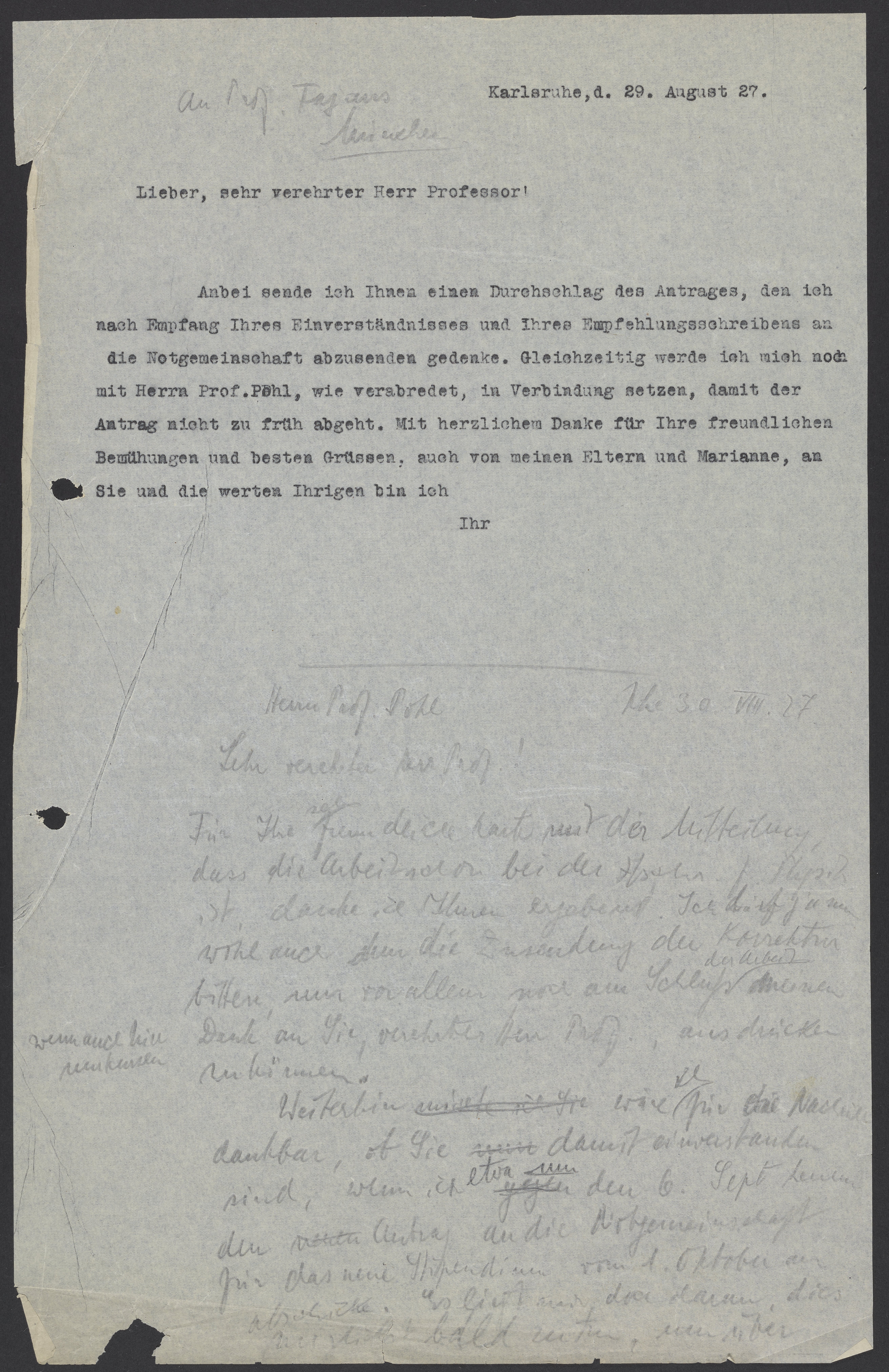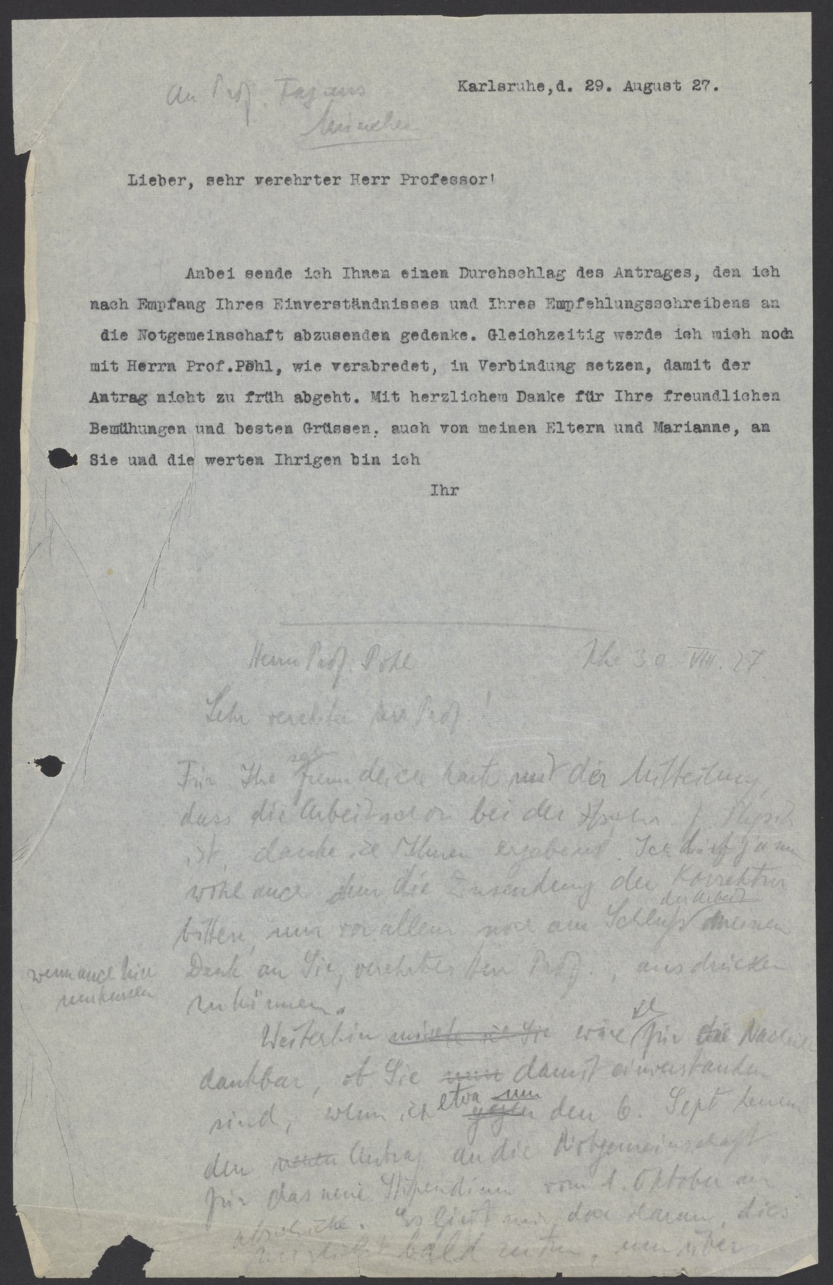 Anbei sende ich Ihnen einen Durchschlag des Antrages, den ich nach Empfang Ihres Einverständnisses und Ihres Empfehlungsschreibens an die Notgemeinschaft abzusenden gedenke. Gleichzeitig werde ich mich noch mit Herrn Prof. Pohl, wie verabredet, in Verbindung setzen, damit der Antrag nicht zu früh abgeht. Mit herzlichem Danke für Ihre freundlichen Bemühungen und besten Grüssen; auch von meinen Eltern und Marianne, an Sie und die werten Ihrigen bin ich