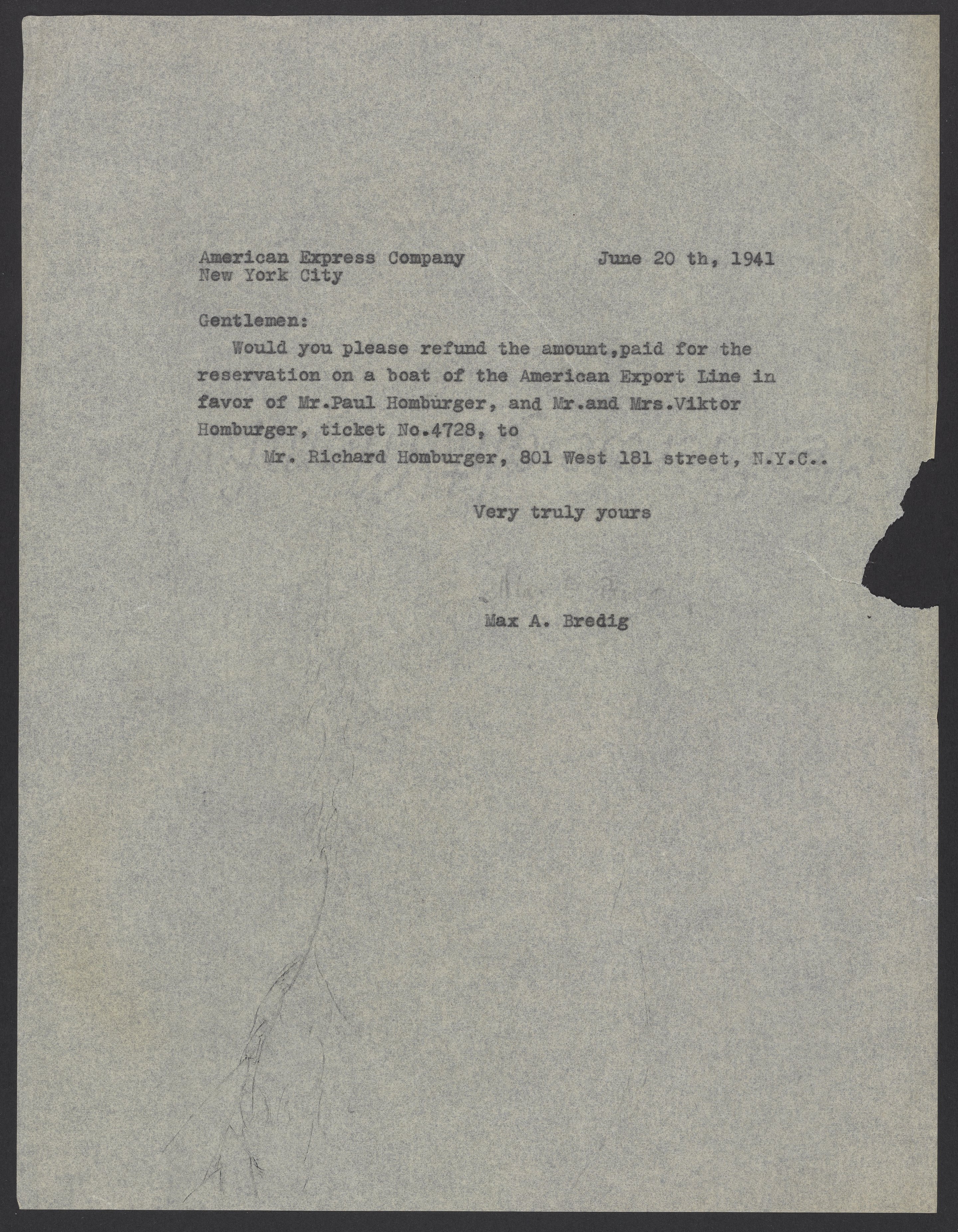 Letter from Max Bredig to American Express Company