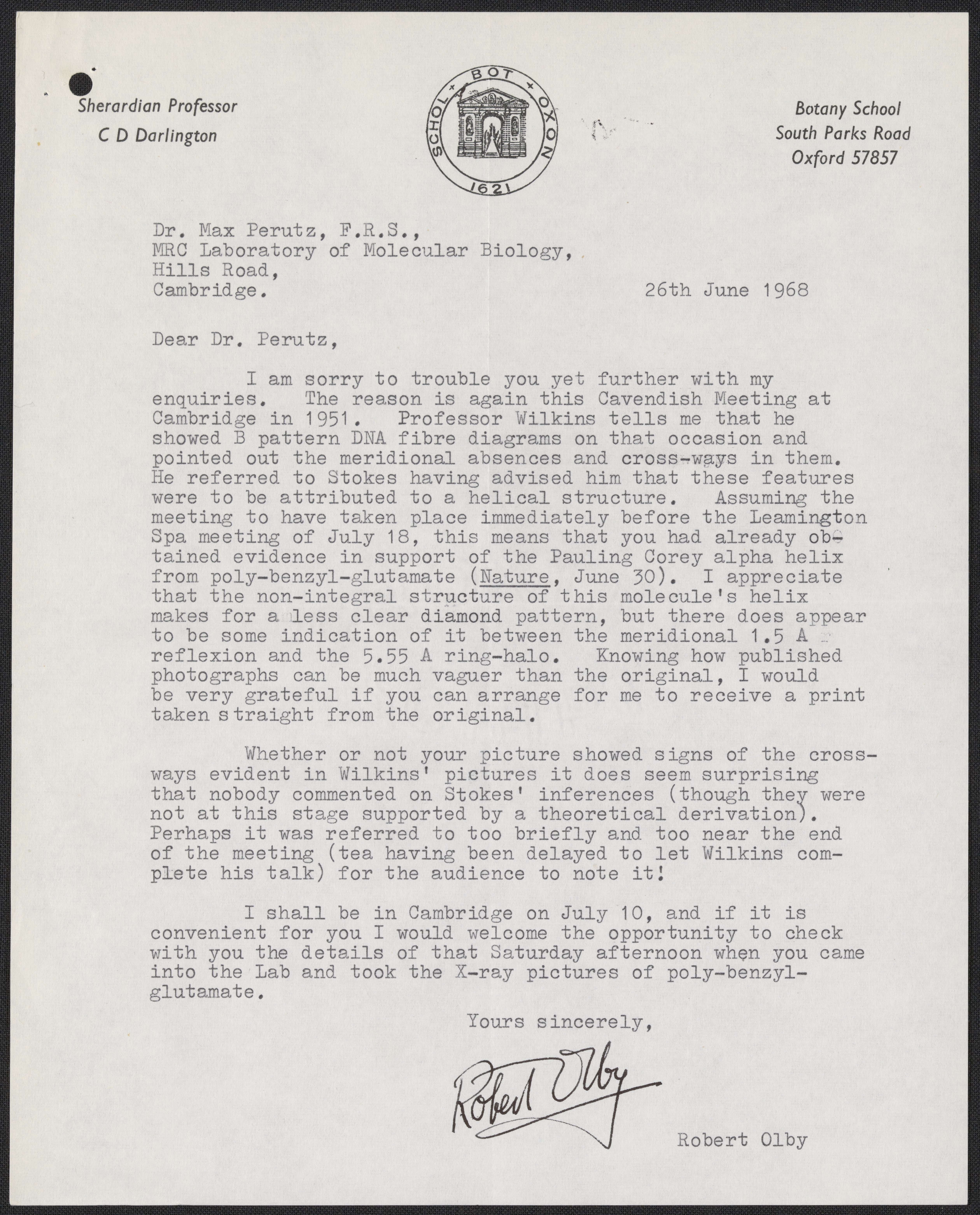 Letter from Robert Olby to Max Perutz, June 26, 1968