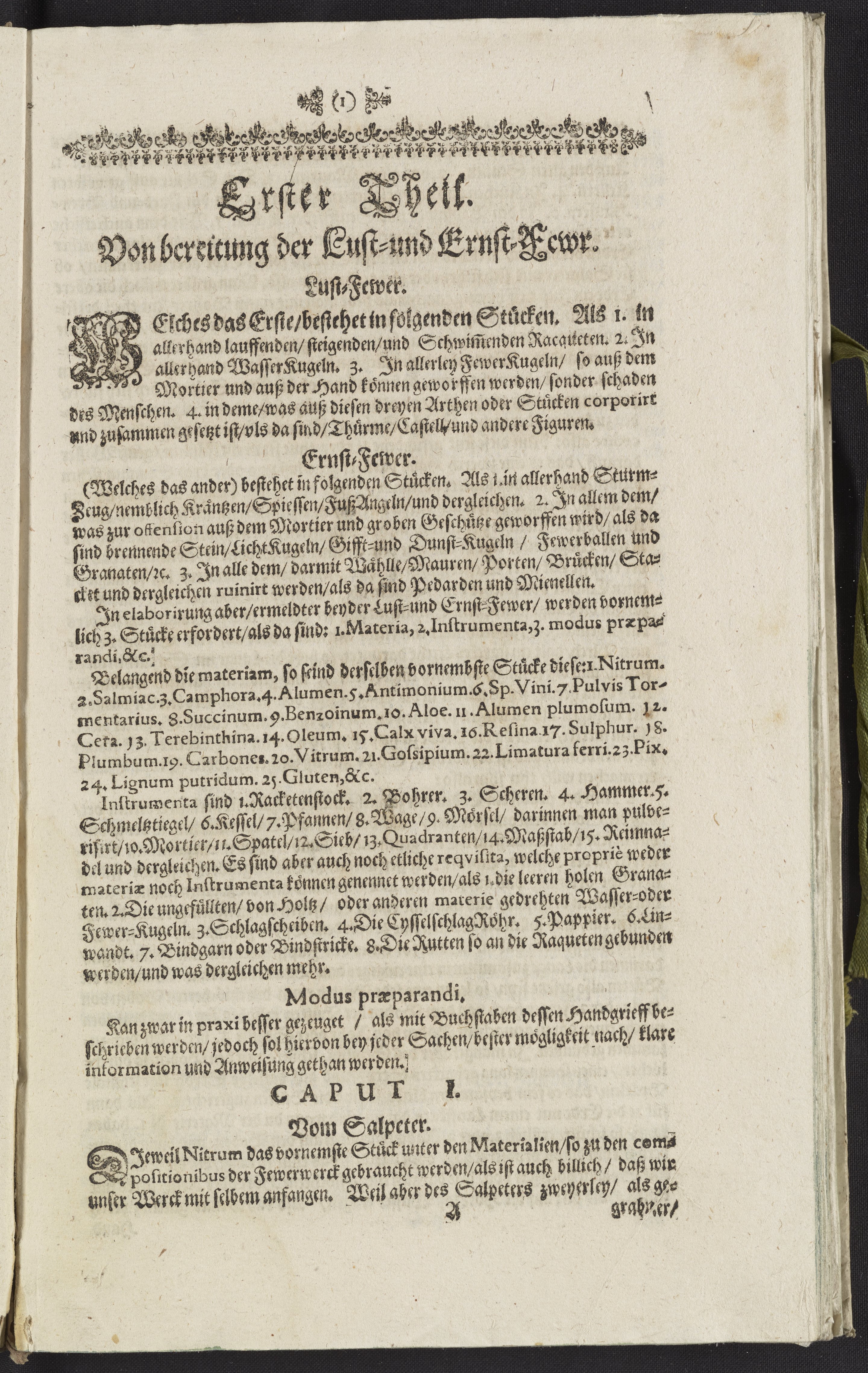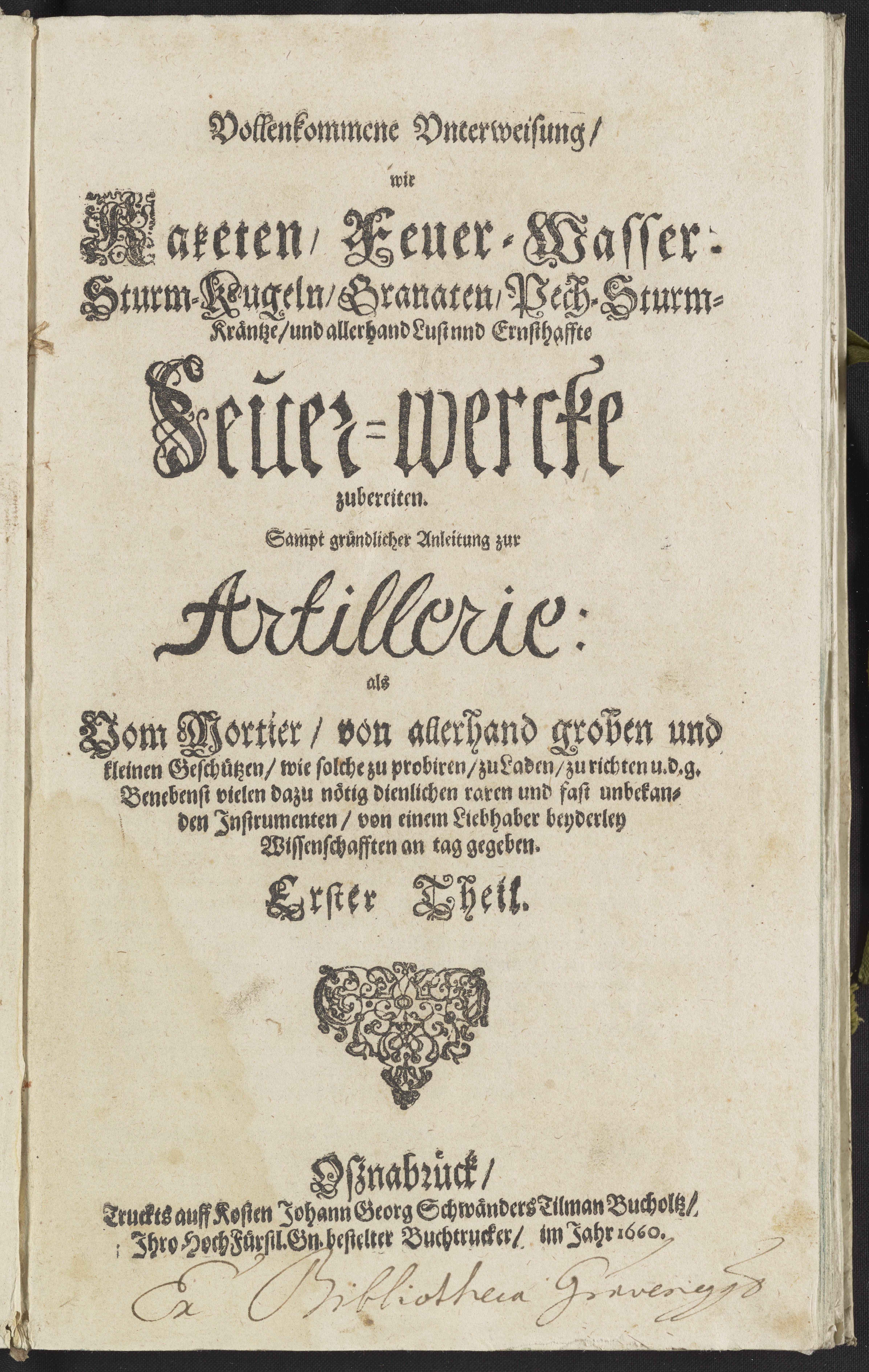 Vollenkommene Unterweisung, wie Raketen, Feuer- Wasser- Sturm-Kugeln, Granaten, Pech-Sturm-Kräntze, und allerhand Lust und Ernsthaffte Feuer-wercke zubereiten