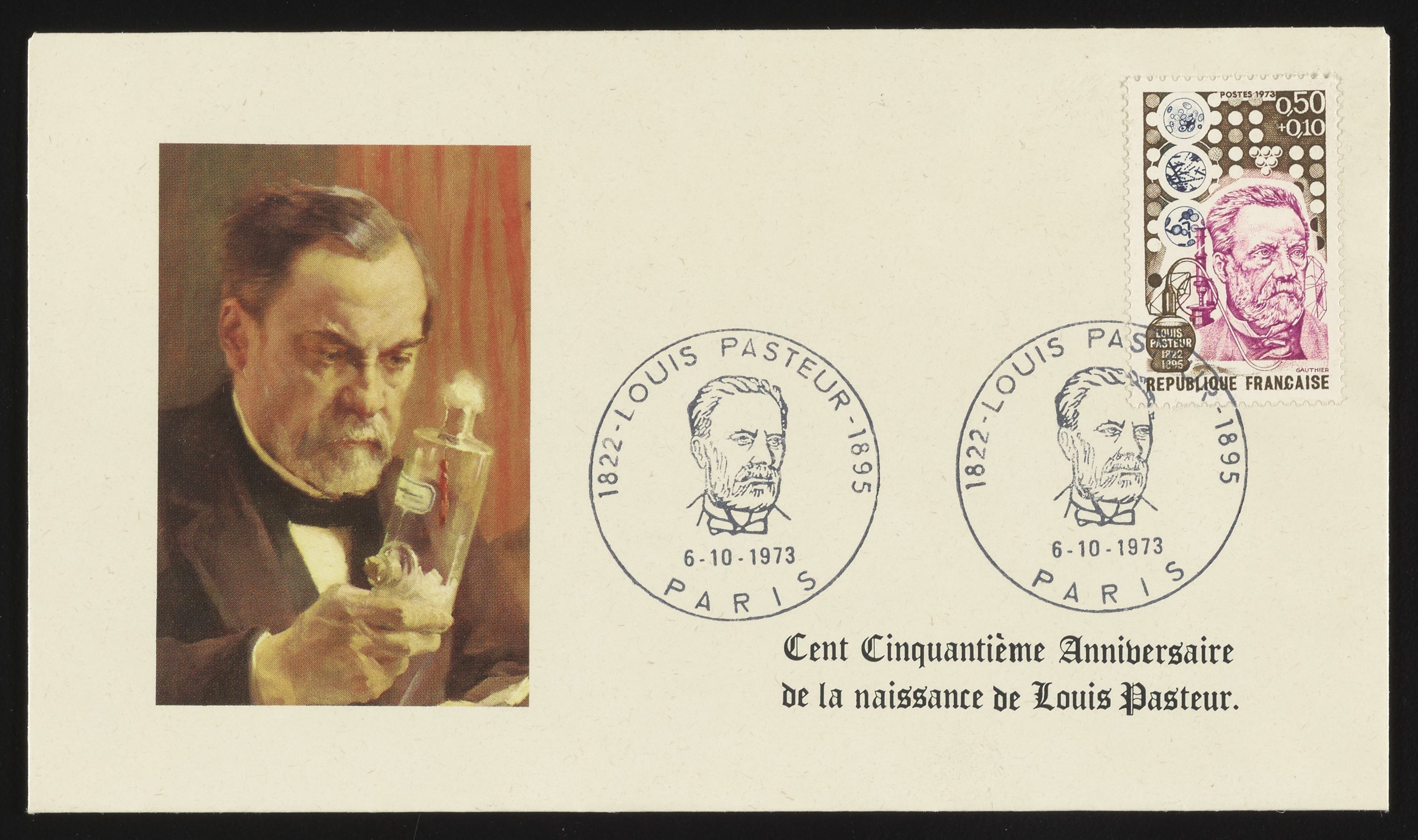 Gauthier, Jacques. “First Day Cover Commemorating the 150th Birthday of Louis Pasteur,” June 10, 1973. Fisher-Pasteur Memorial Collection, Box 1, Folder 24. Science History Institute. Philadelphia. https://digital.sciencehistory.org/works/ft848q73q.