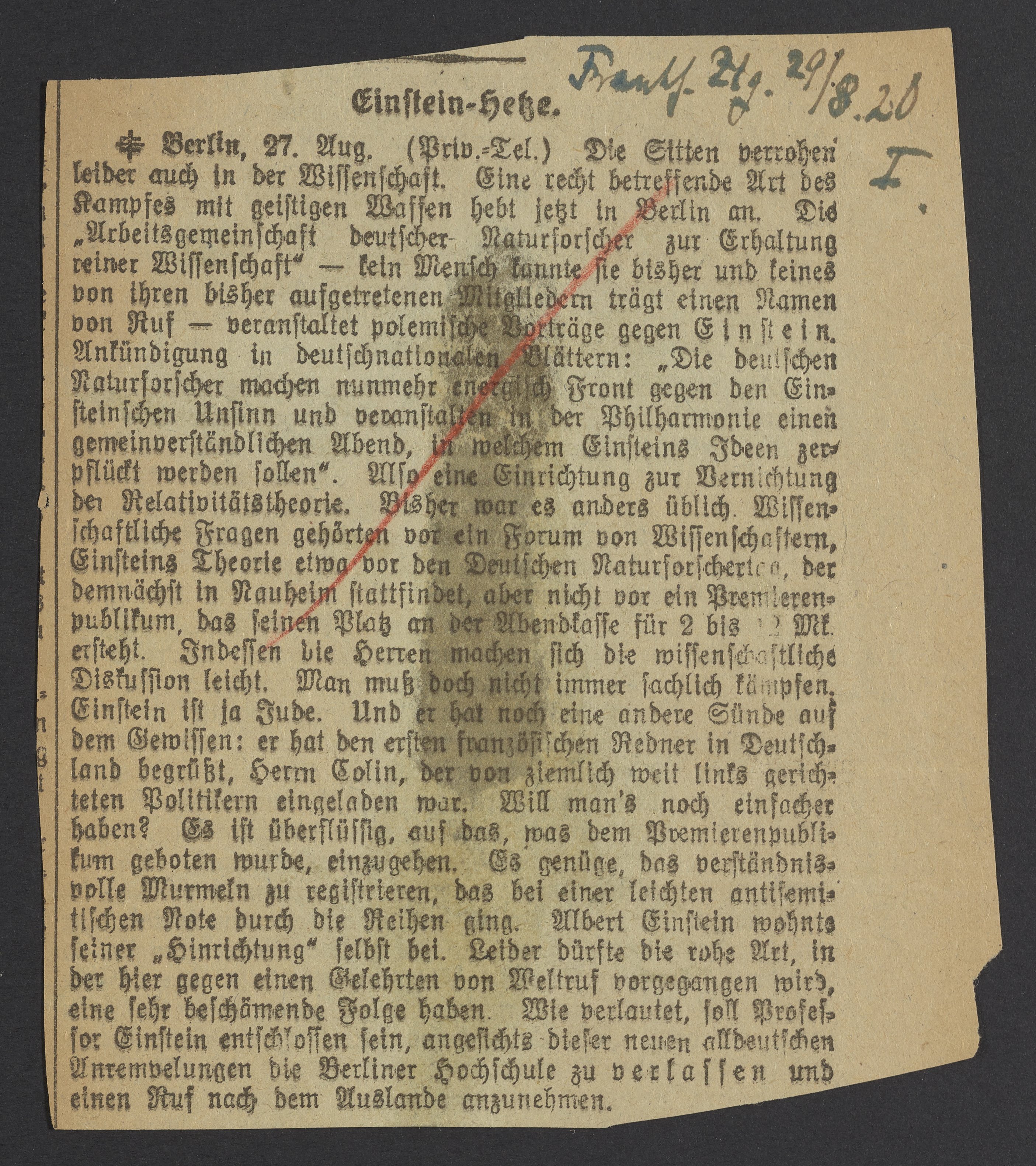 “Einstein-Hetze,” August 29, 1920. Papers of Georg and Max Bredig, Box 5, Folder 2. Science History Institute. Philadelphia. https://digital.sciencehistory.org/works/fui0rb8.