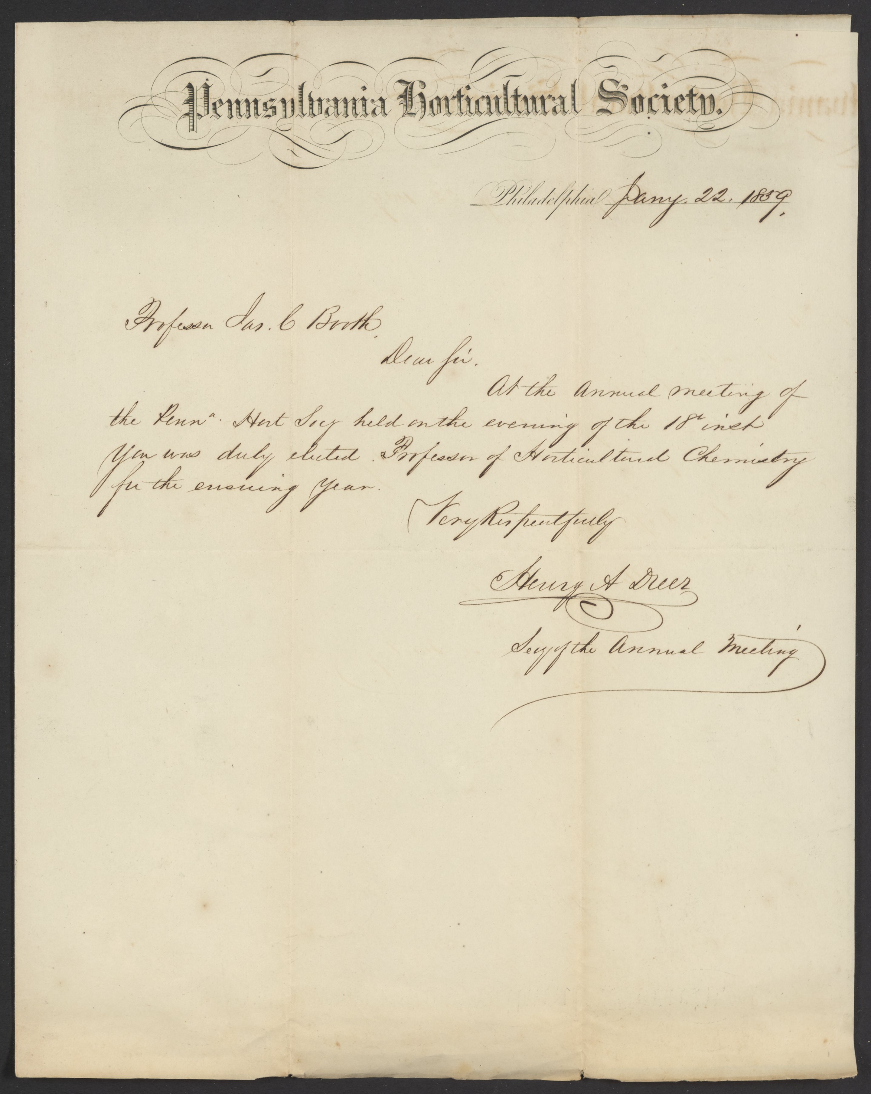 Small JPG1200 x 1507px — 179 KBLarge JPG2880 x 3617px — 825 KBFull-sized JPG3506 x 4403px — 1.1 MBOriginal fileTIFF — 3506 x 4403px — 44.2 MBJames Curtis Booth (1810-1888) is elected a Professor of the Pennsylvania Horticultural Society for the year 1859.