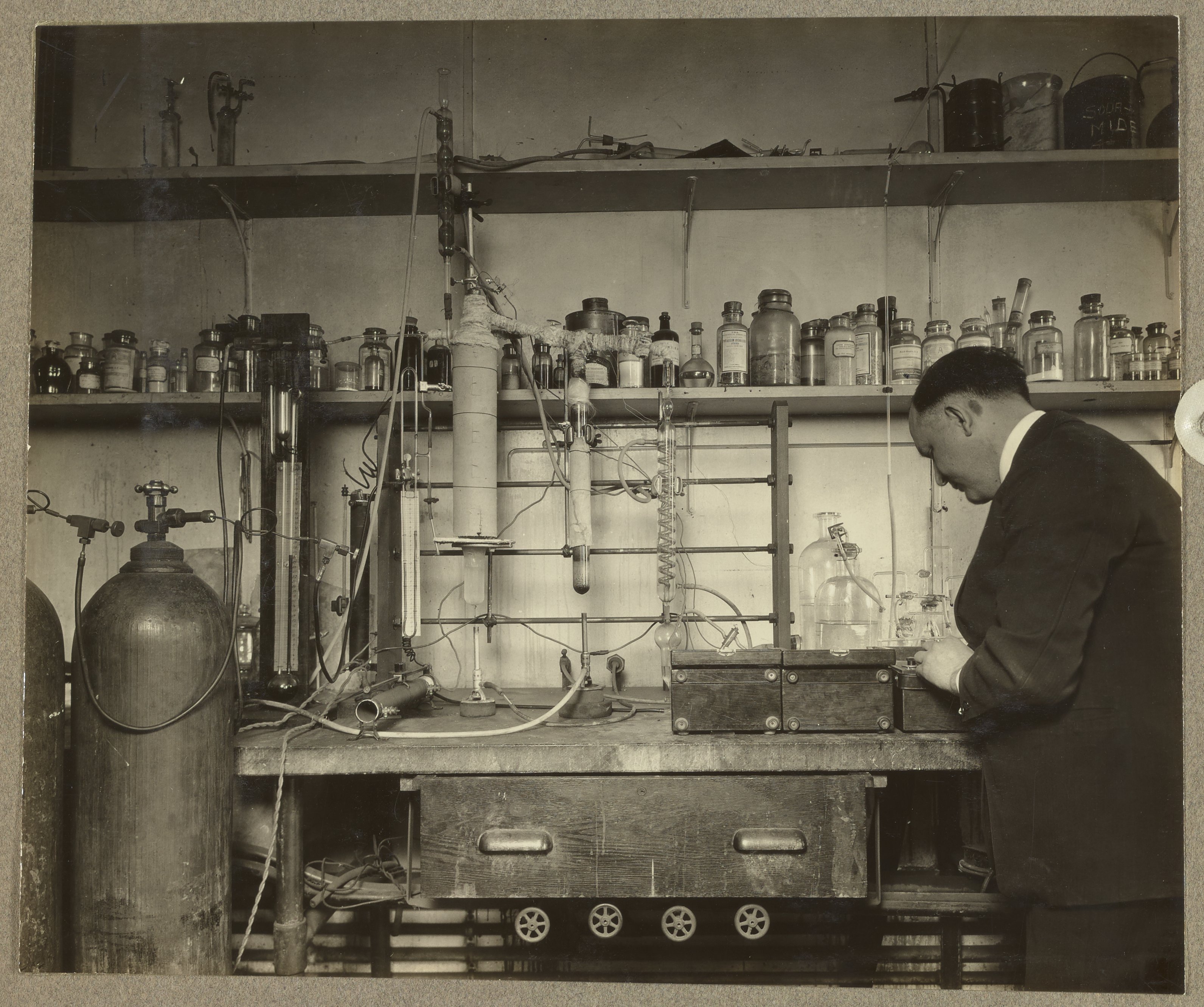General view of W.E. Kuentzel demonstrating use of an apparatus for the removal of carbon monoxide from water gas by means of preferential combustion at the U.S. Department of Agriculture's Fixed Nitrogen Research Laboratory located in Washington, D.C. The term "water gas" commonly refers to the mixture of carbon monoxide and hydrogen and was popularly used in industrial reactions to manufacture ammonia, hydrocarbons, methanol, and hydrogen in the early 20th century.
