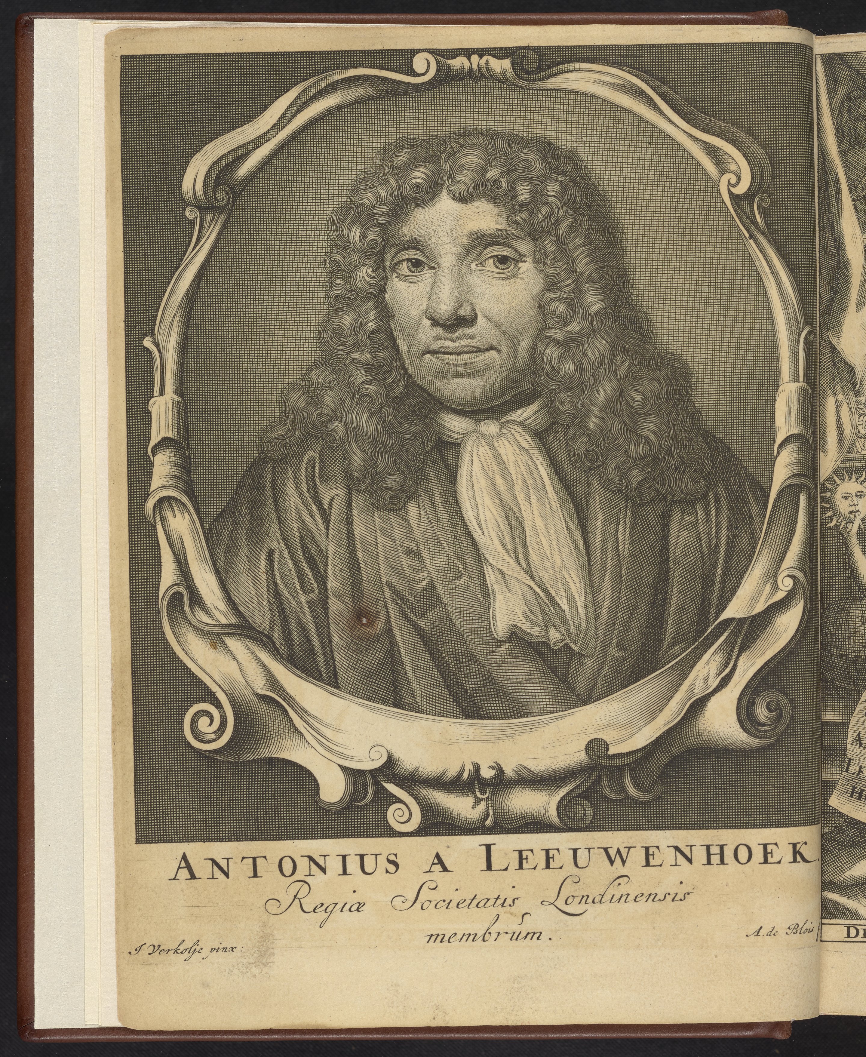 Frontispiece half-length portrait engraving of Antoni van Leeuwenhoek (1632-1723). "Antonius A. Leeuwenhoeck" and "Regiæ Societatis Londinensis membrum" are listed underneath the portrait, with the latter translating to "member of the Royal Society of London".
