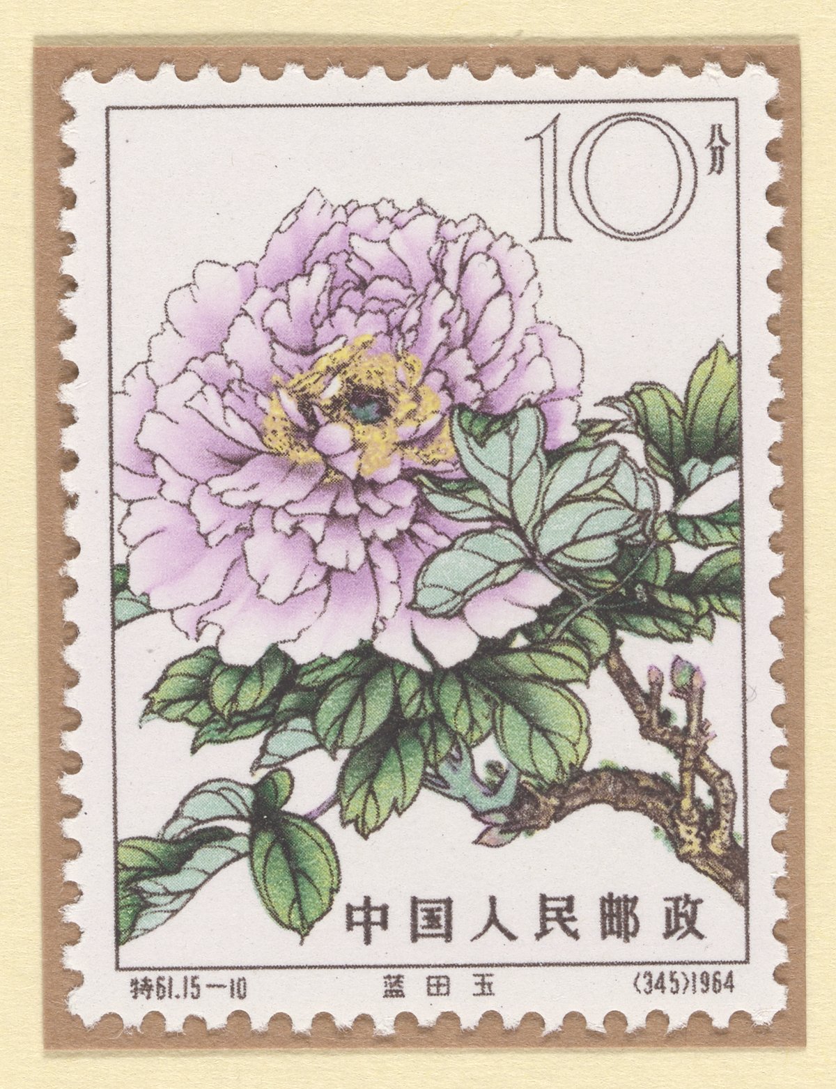 Postage stamp featuring an illustration of a variety of tree peonies called Lan Tian Jade (藍田玉). This stamp is part of a stamp series titled "Tree Peonies," which was issued in 1964 by the People's Republic of China.
