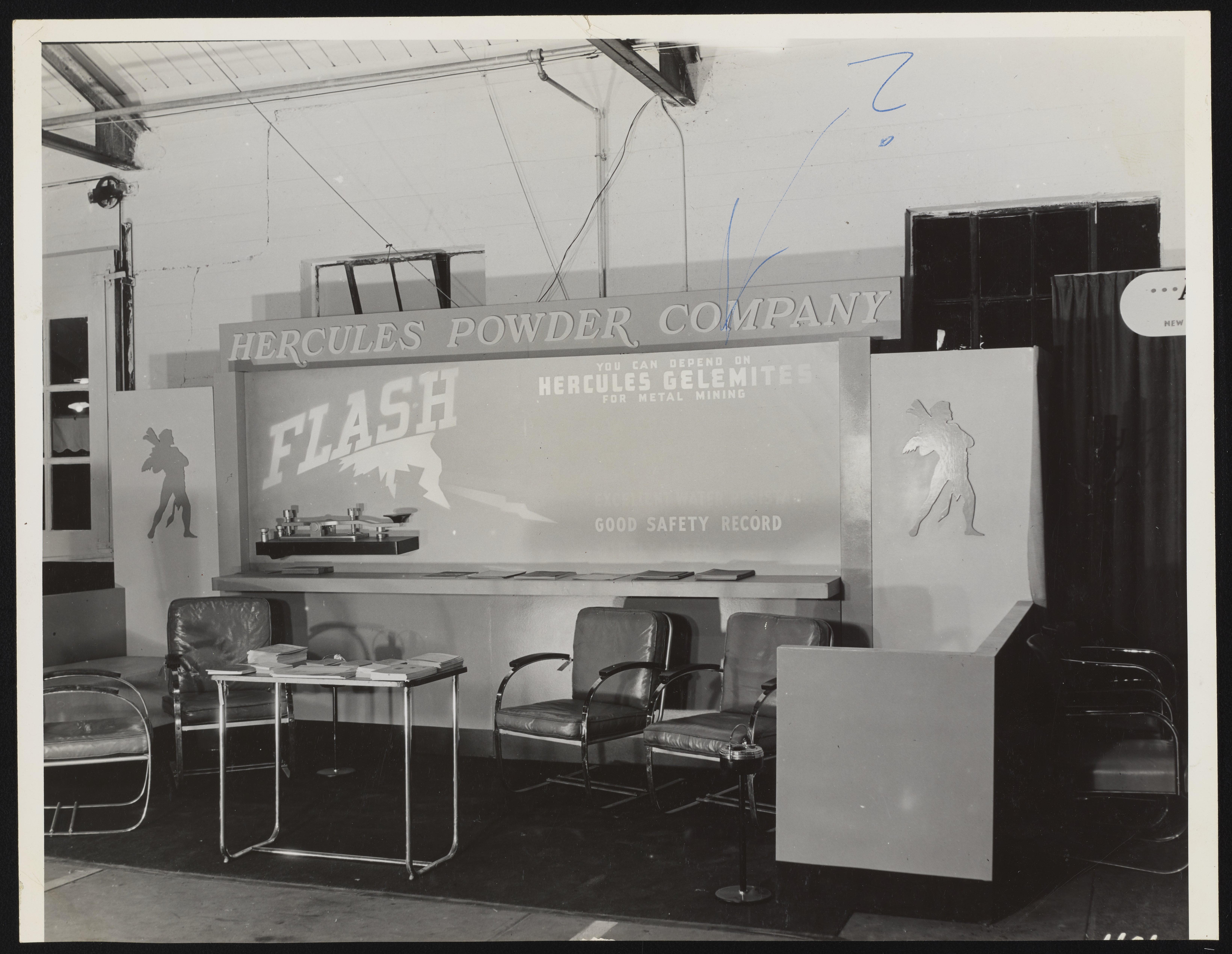General view of an exhibition display promoting Gelemite explosives manufactured and sold by the Hercules Powder Company for use in metal mining.