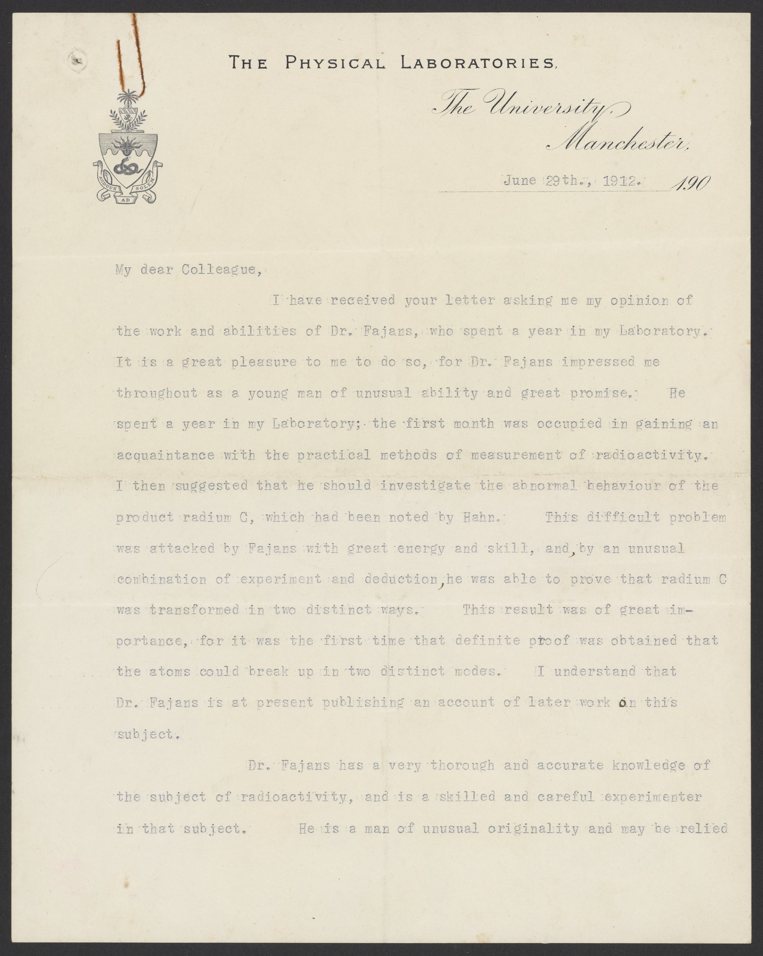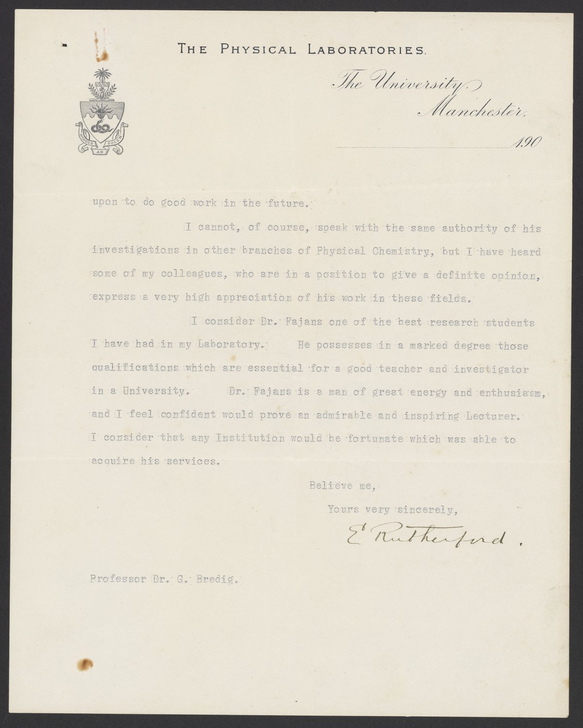 Small JPG1200 x 1504px — 198 KBLarge JPG2880 x 3610px — 1.1 MBFull-sized JPG5122 x 6420px — 3.3 MBOriginal fileTIFF — 5122 x 6420px — 94.1 MBErnest Rutherford (1871-1937) provides Georg Bredig (1868-1944) with a reference for Kasimir Fajans (1887-1975). Rutherford speaks to Fajans' work in his laboratory, his work ethic, and his qualifications to work with Bredig.
