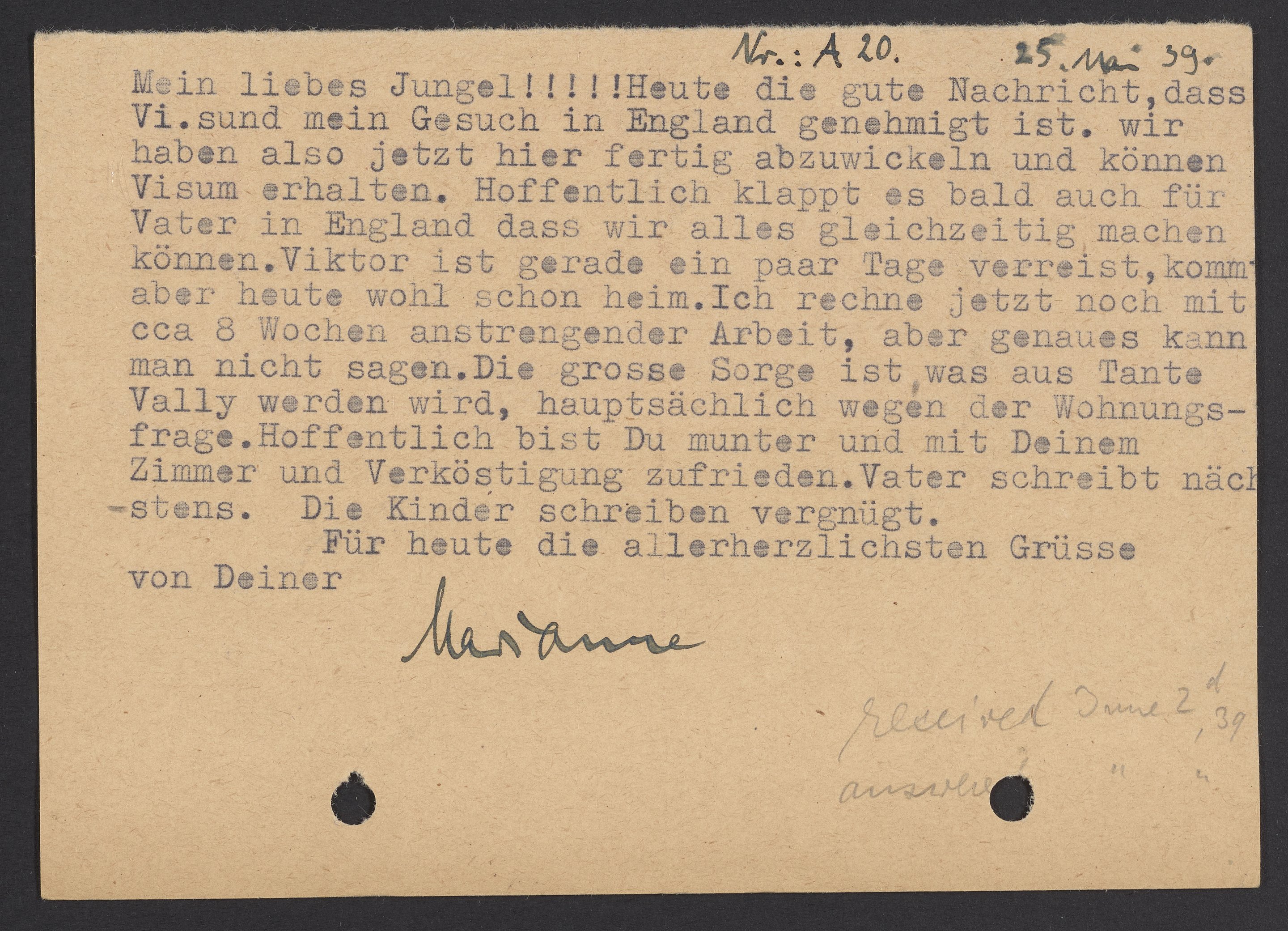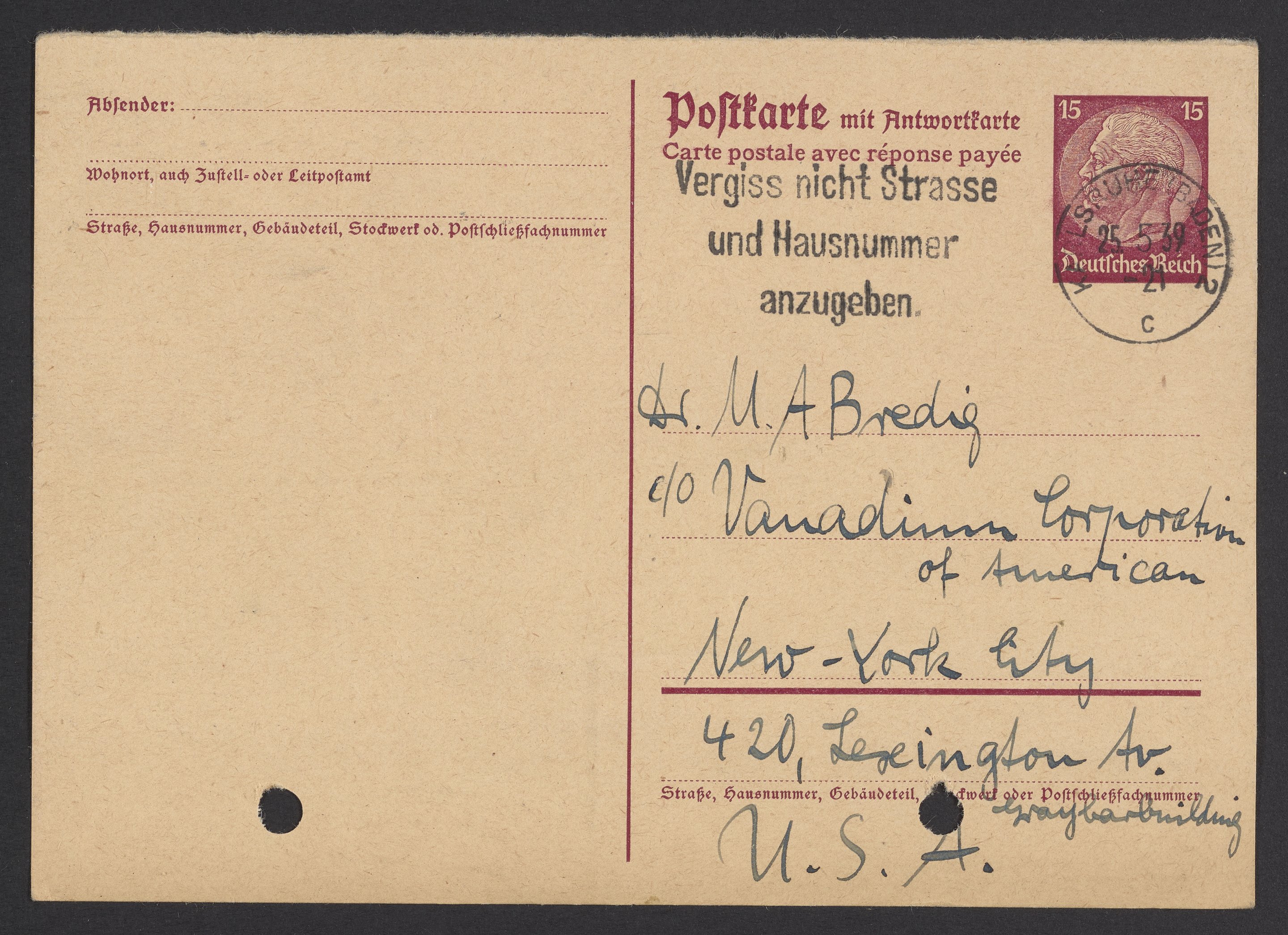 Postcard from Marianne Homburger to Max Bredig, May 25, 1939