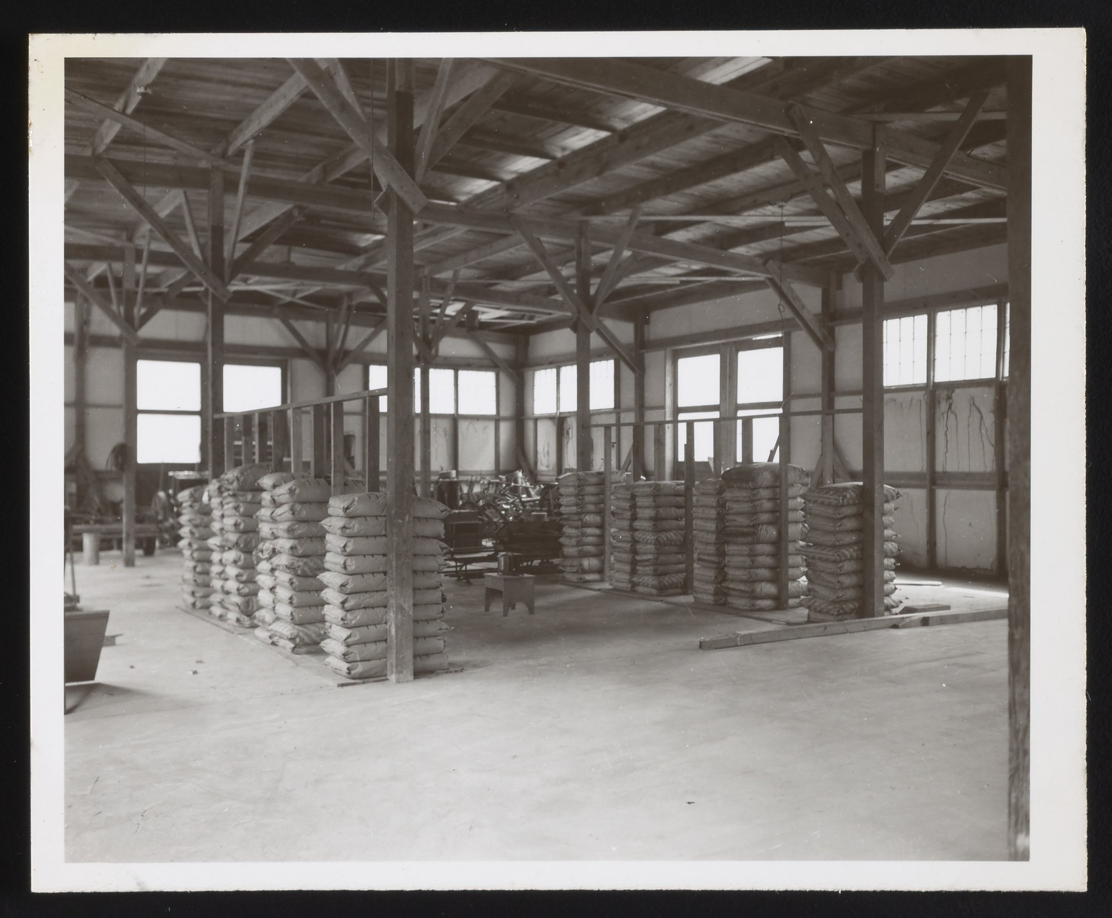 General view of fertilizer storage piles supported between uprights at the U.S. Department of Agriculture's Agricultural Engineering Laboratory. Text accompanying the photograph notes that each row contained a full set of replicates and thus constituted a "block" for analysis.