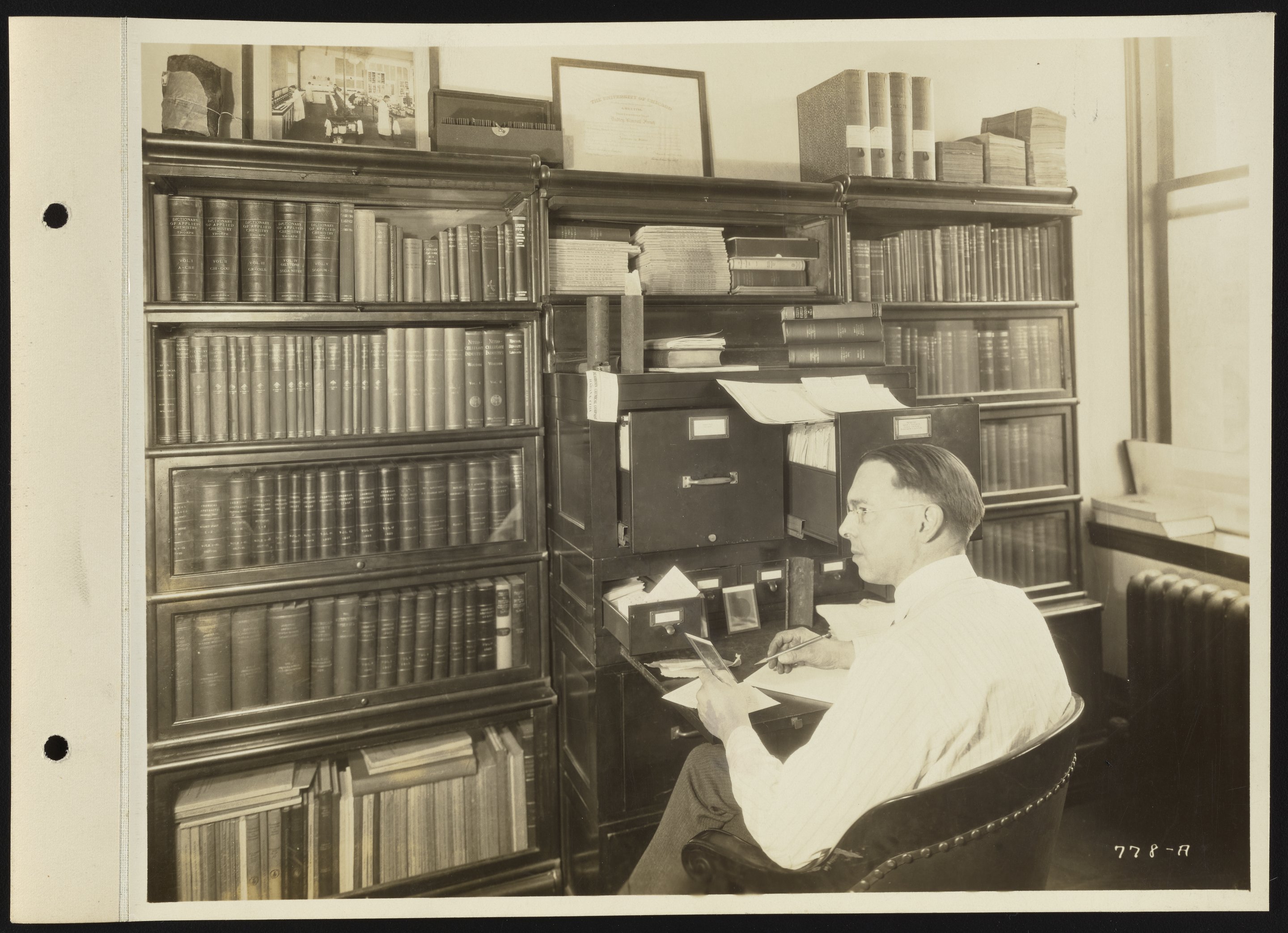 General view of employee Dudley Kimball French at work in the offices at the Dearborn Chemical Company's 35th Street laboratory facility and manufacturing plant. Founded in 1887, the Dearborn Chemical Company was a corporate ancestor of BetzDearborn, Incorporated best known for manufacturing water treatment chemicals for use in boilers and cooling towers.