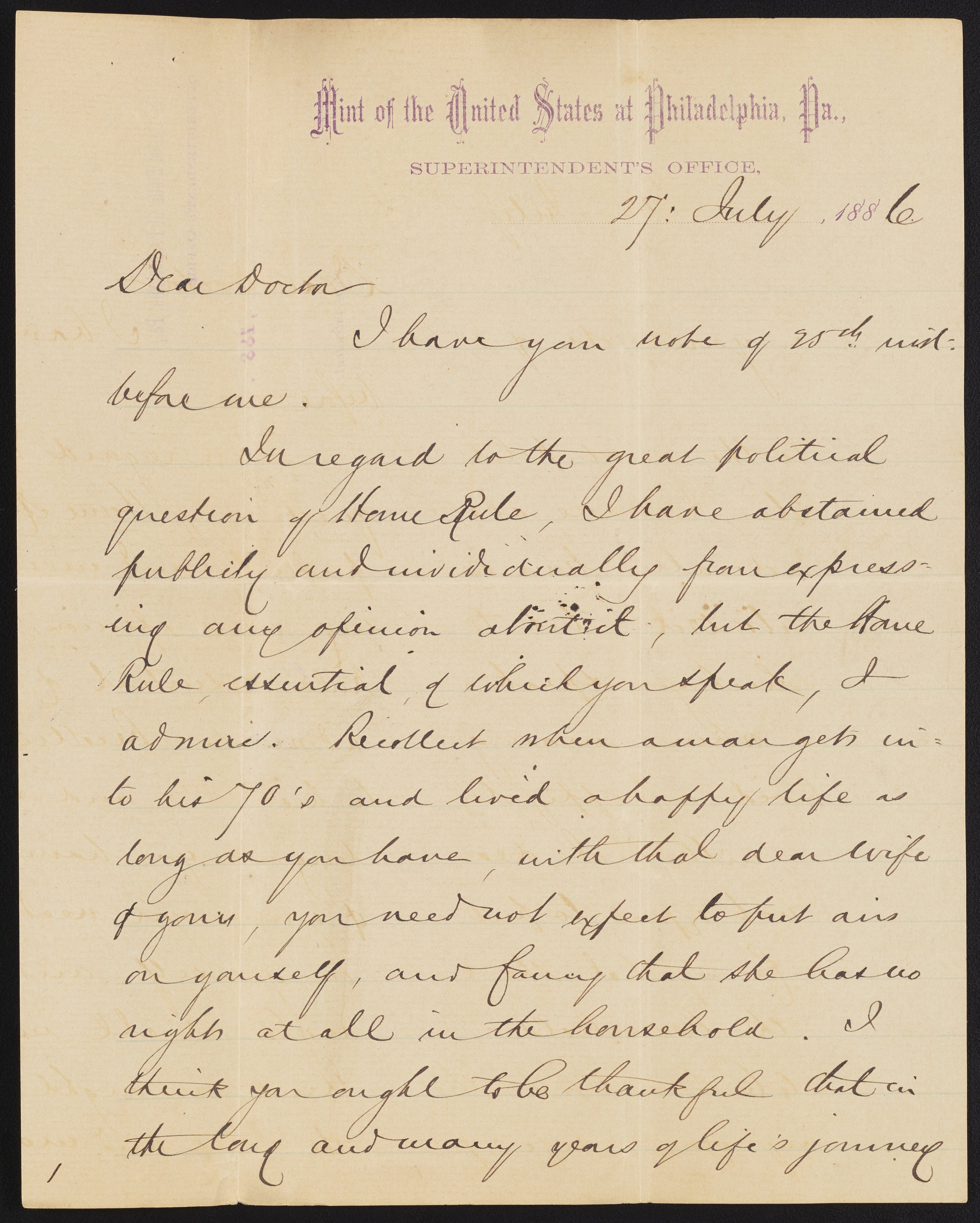 Small JPG1200 x 1497px — 270 KBLarge JPG2880 x 3593px — 1.5 MBFull-sized JPG4741 x 5914px — 3.9 MBOriginal fileTIFF — 4741 x 5914px — 80.3 MBDaniel M. Fox (1819-1890), Superintendent of the Mint of the United States at Philadelphia, writes again to James Curtis Booth (1810-1888) following his letter of December 15, to enquire on the states of Booth's health and his slow recovery.