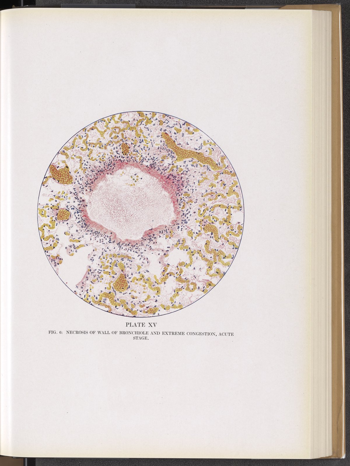 Plate XV (Fig. 6): Necrosis of wall of bronchiole and extreme congestion, acute stage.