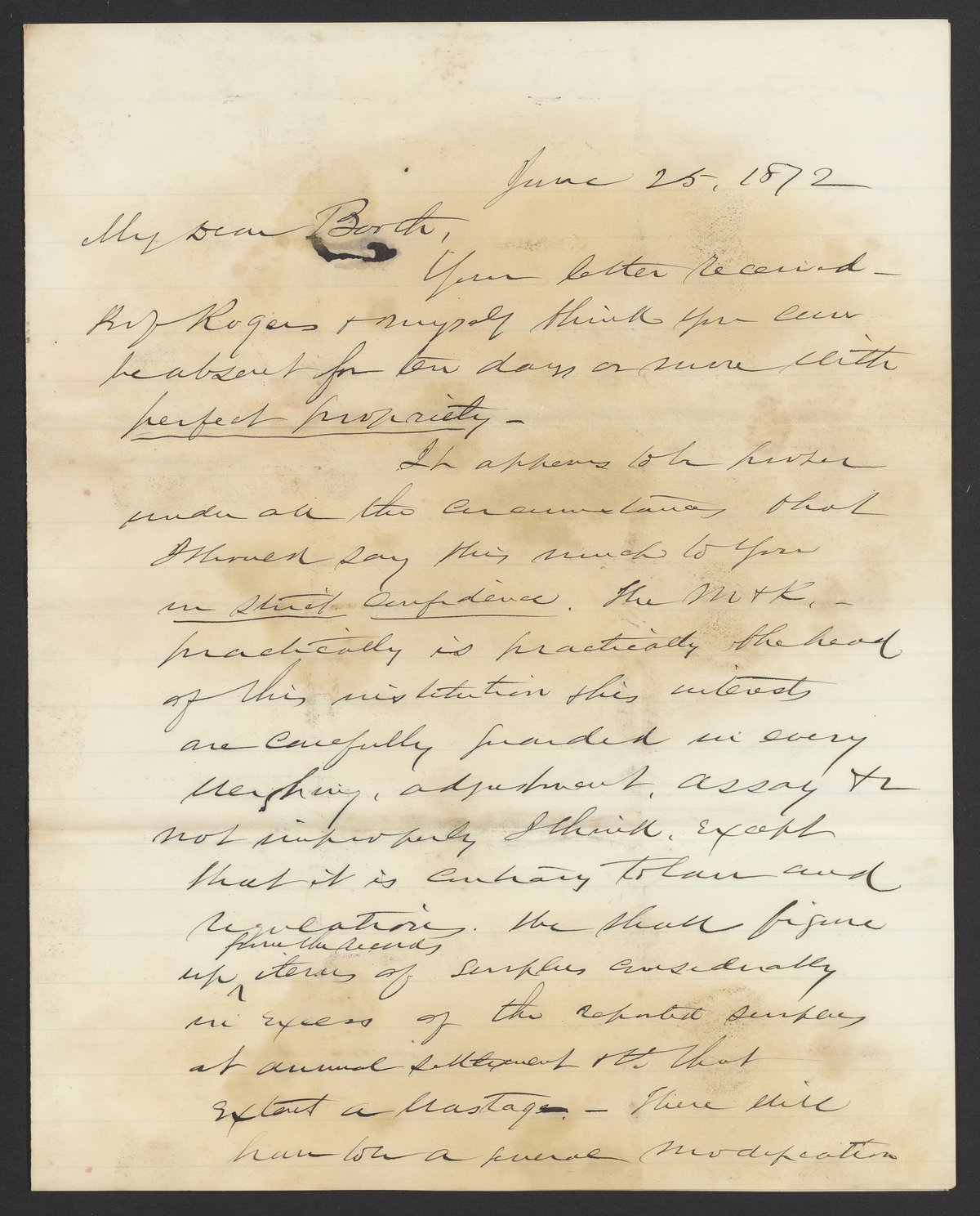 Letter from H. R. Linderman to James Curtis Booth, June 25, 1872