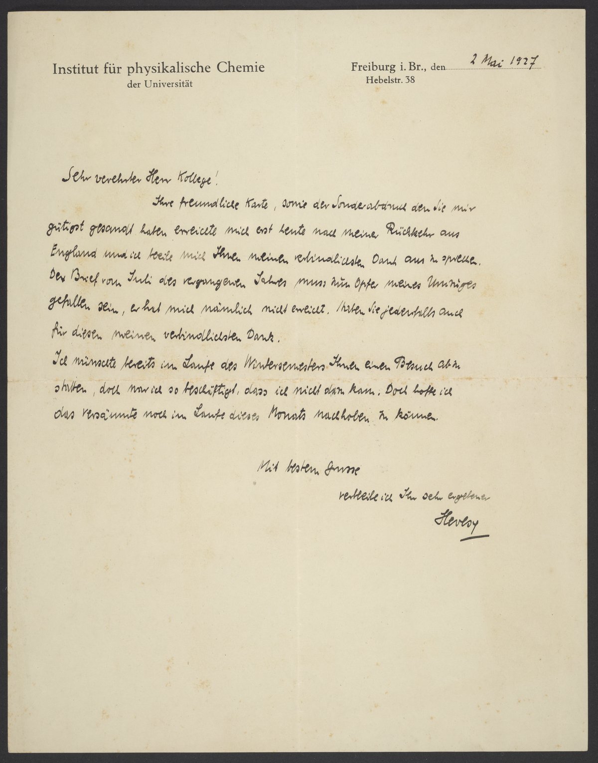 Hevesy, Georg von. “Letter from George Hevesy to Georg Bredig,” May 2, 1927. Papers of Georg and Max Bredig, Box 1, Folder 28. Science History Institute. Philadelphia. https://digital.sciencehistory.org/works/g4vtfcj.