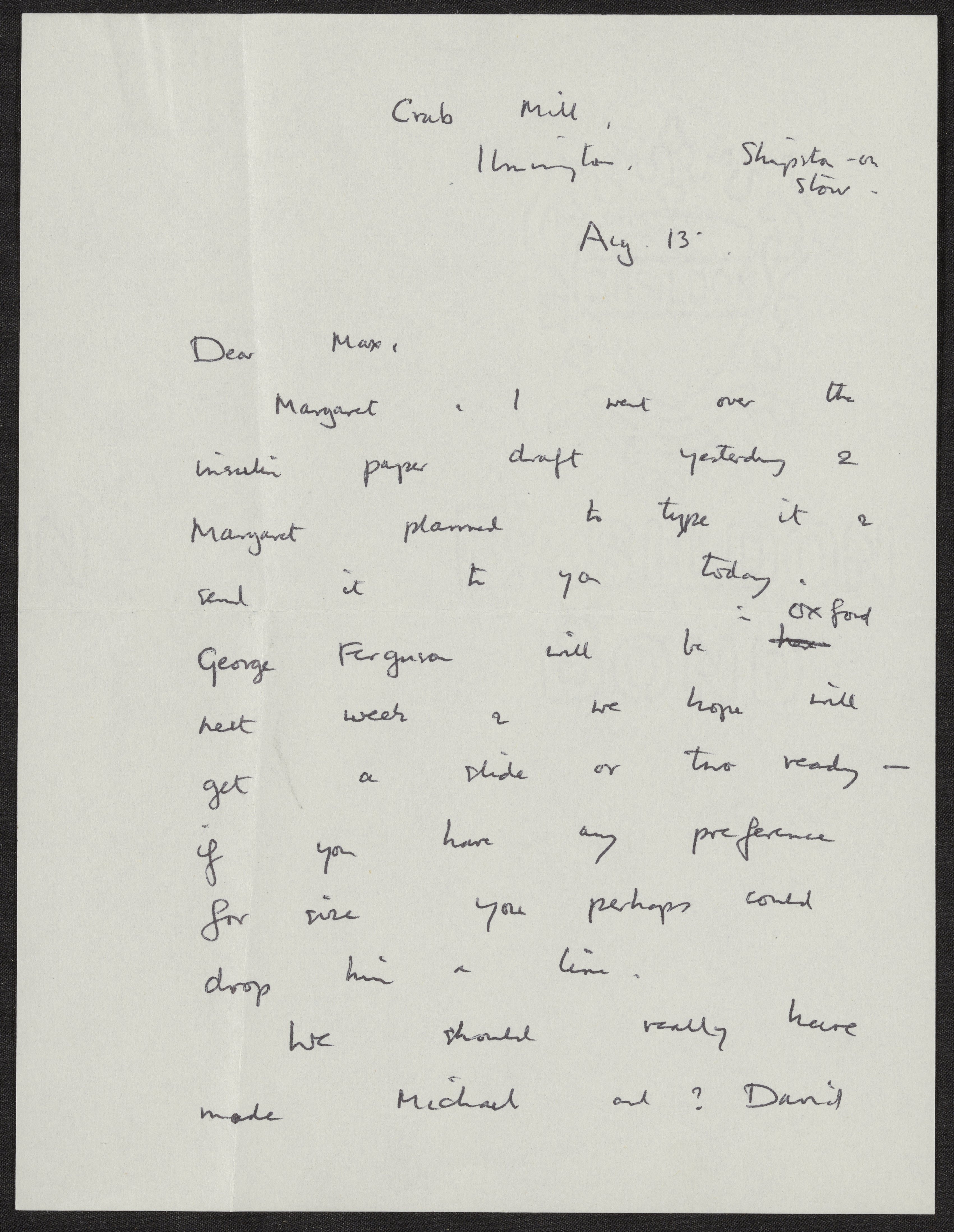 Letter from Dorothy Hodgkin to Max Perutz, August 13, 1963