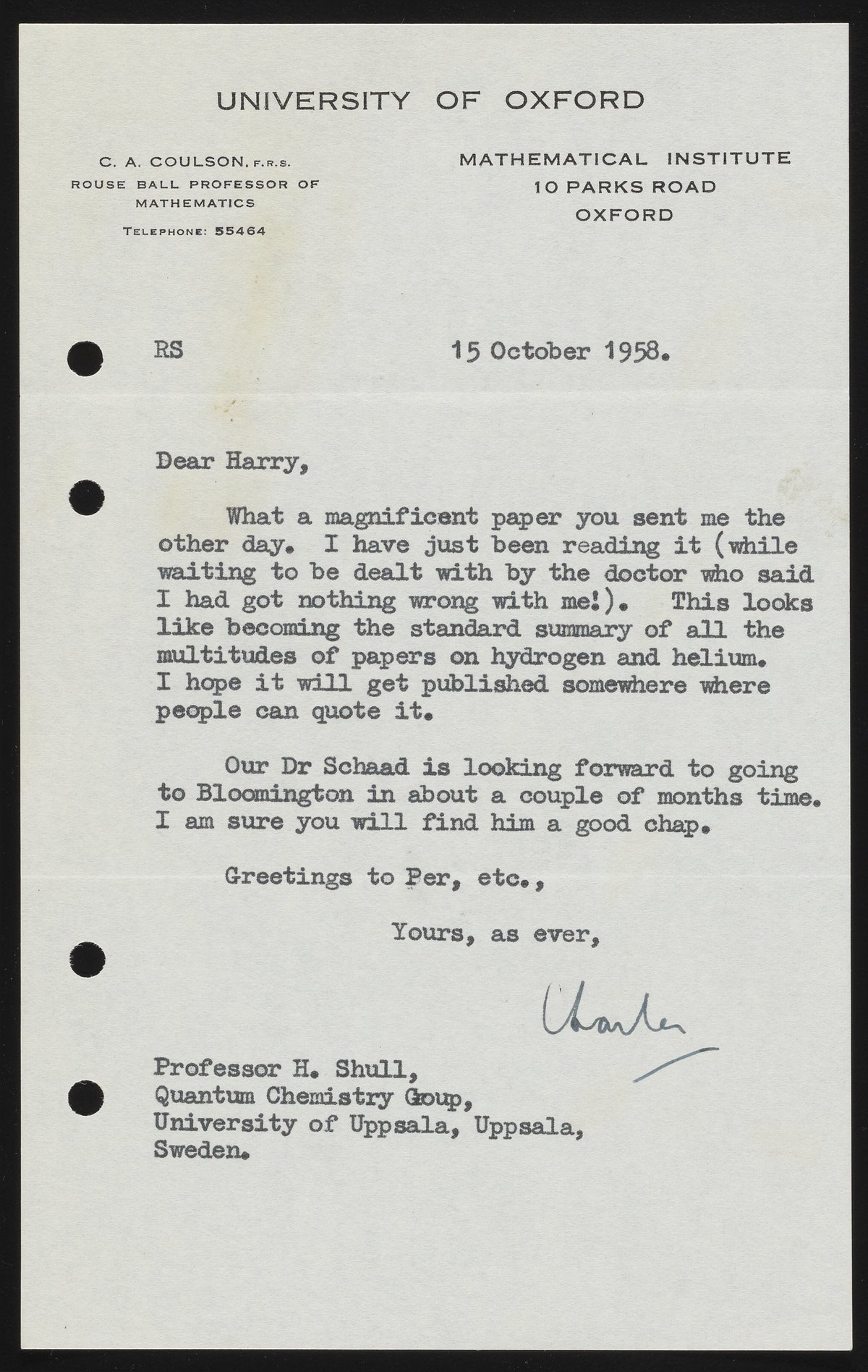 Letter from Charles Coulson to Harrison Shull, 1958