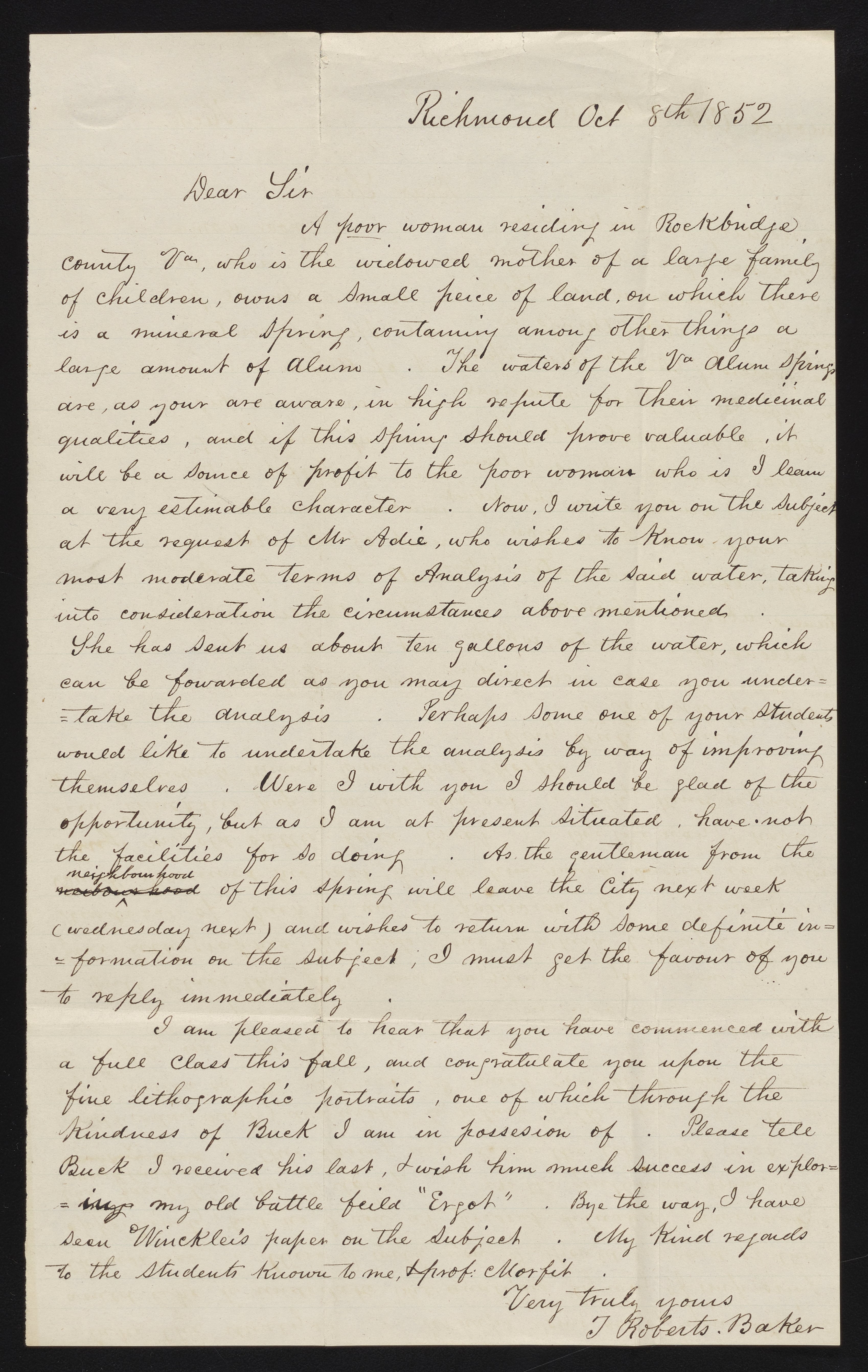 Small JPG1200 x 1897px — 431 KBLarge JPG2880 x 4552px — 2.1 MBFull-sized JPG3396 x 5368px — 2.8 MBOriginal fileTIFF — 3396 x 5368px — 52.2 MBHandwritten letter to James Curtis Booth (1810-1888) from the James Curtis Booth Papers. Booth, a nineteenth-century analytical chemist, established the first student training laboratory in 1836. He was also the chief melter and refiner of the U.S. Mint in Philadelphia. In his letter, Baker requests an analysis of alum-rich water found on the property of a certain poor woman in need of funds.