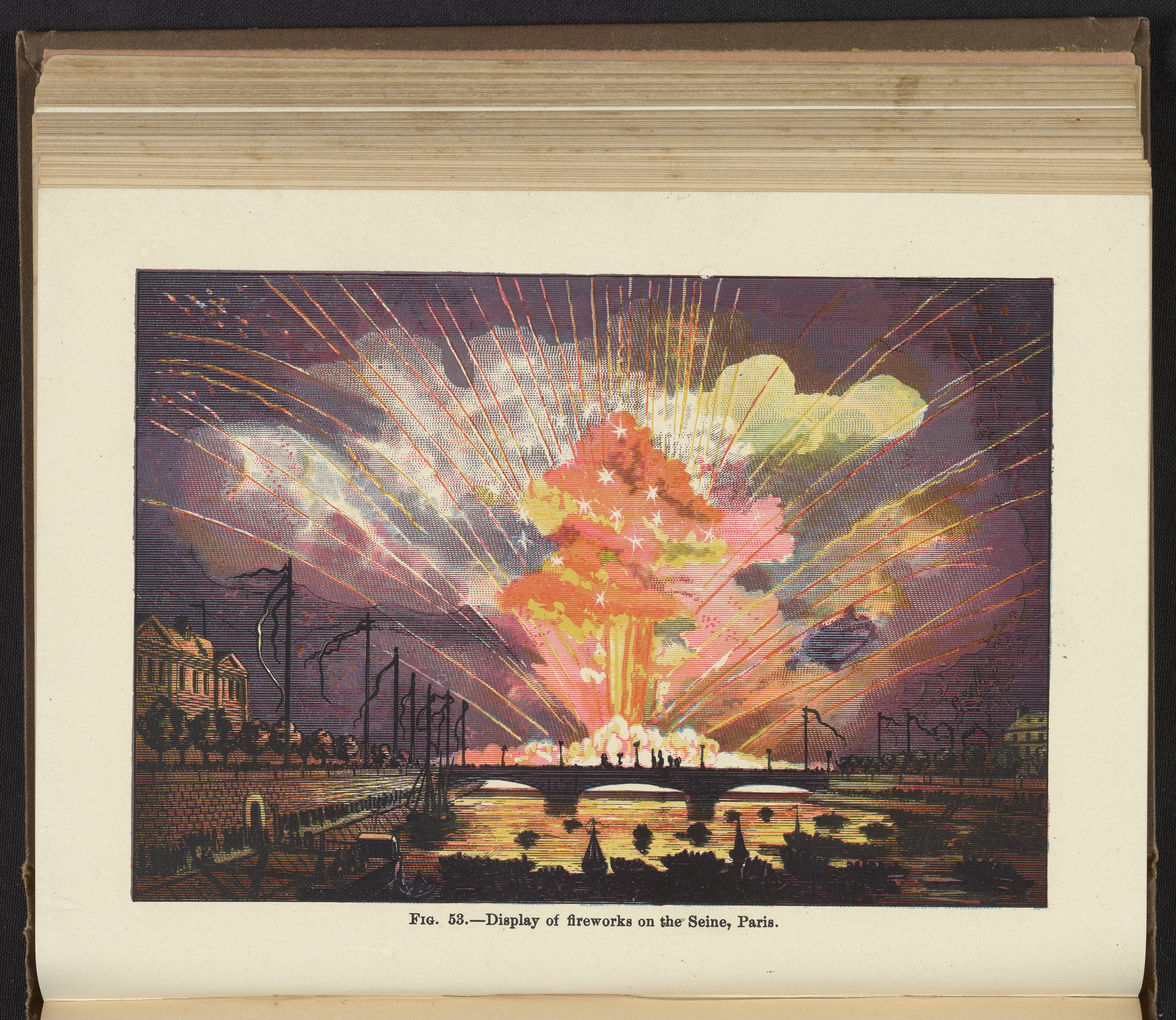 Appleton, John Howard. “Figure 53: Display of Fireworks on the Seine, Paris.” Chemistry, Developed by Facts and Principles Drawn Chiefly from the Non-Metals. Providence, Rhode Island: Providence Lithograph Company, 1884. Science History Institute. Philadelphia. https://digital.sciencehistory.org/works/g7ye8xl.