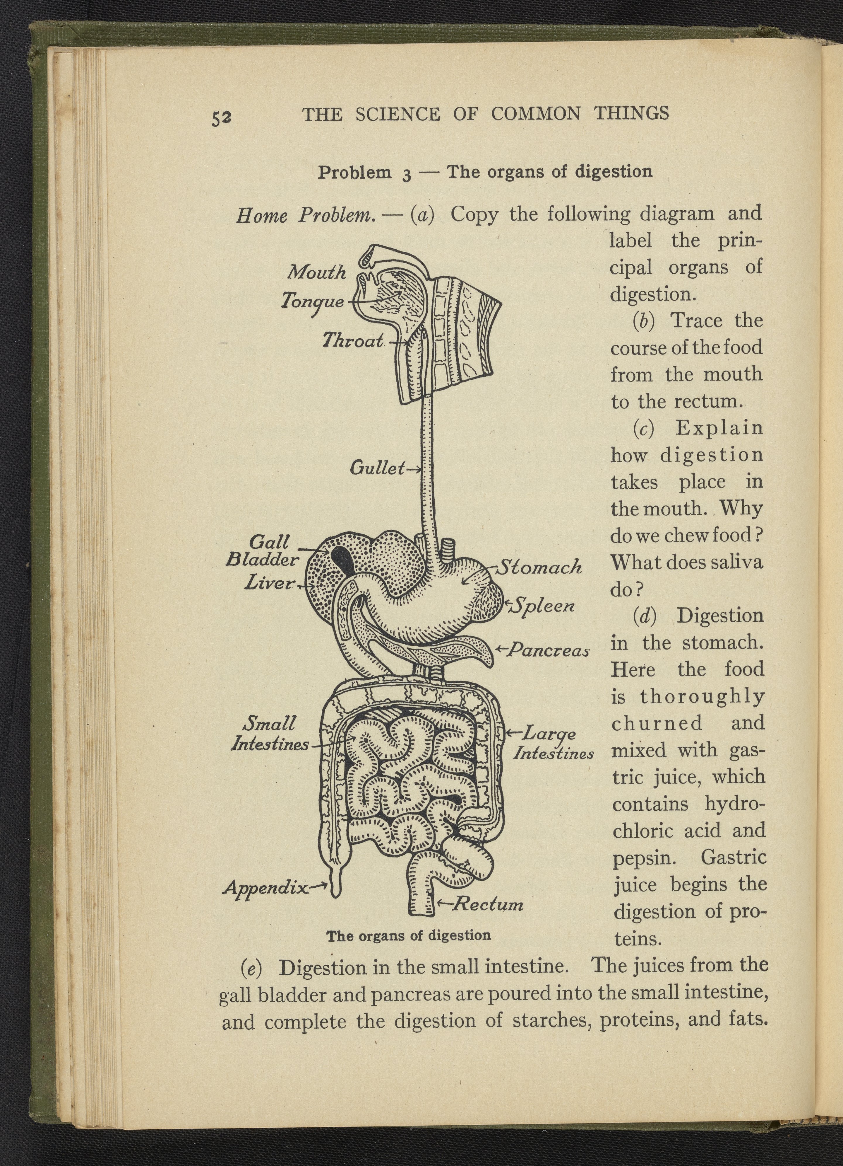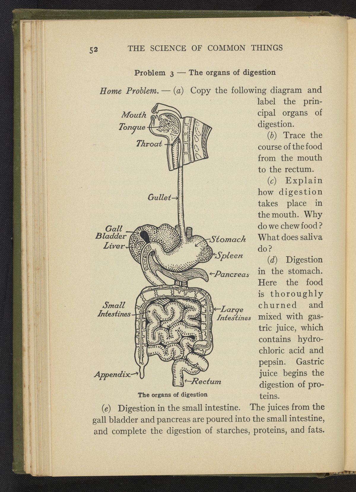 Diagram from page 52 of the 1922 volume The Science of Common Things depicting the organs of the digestive system, including the mouth, throat, stomach, gall bladder, and spleen.