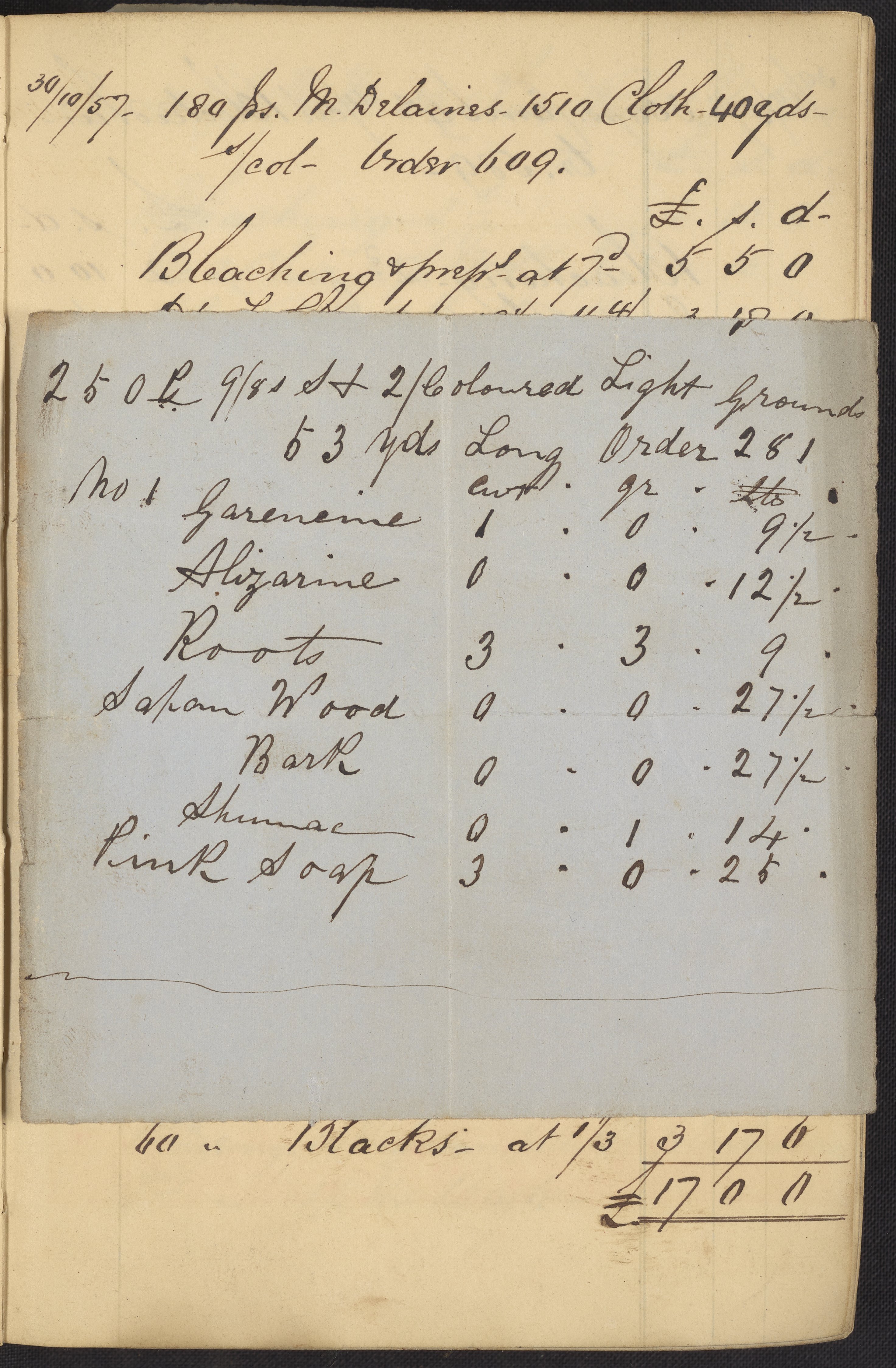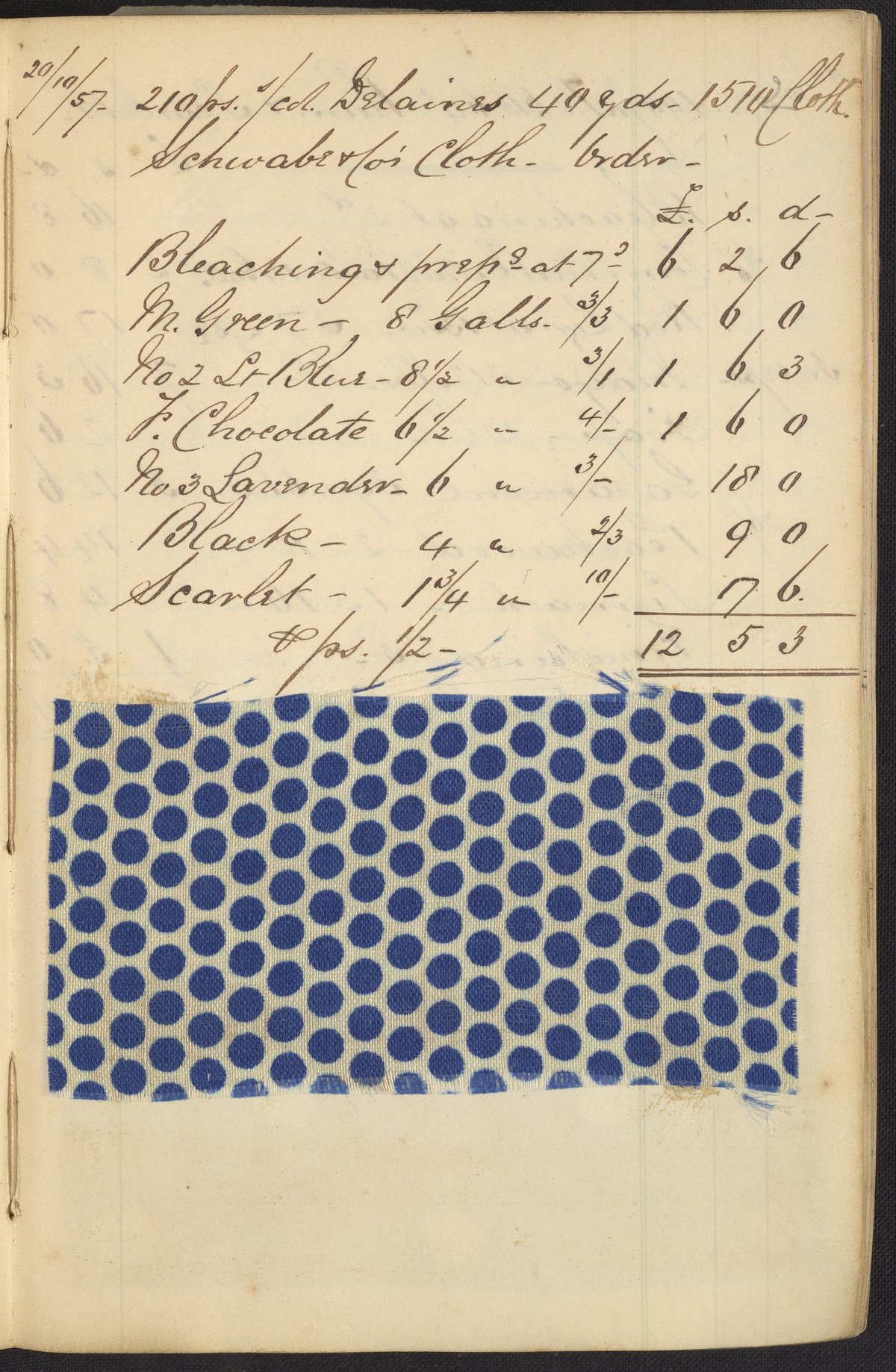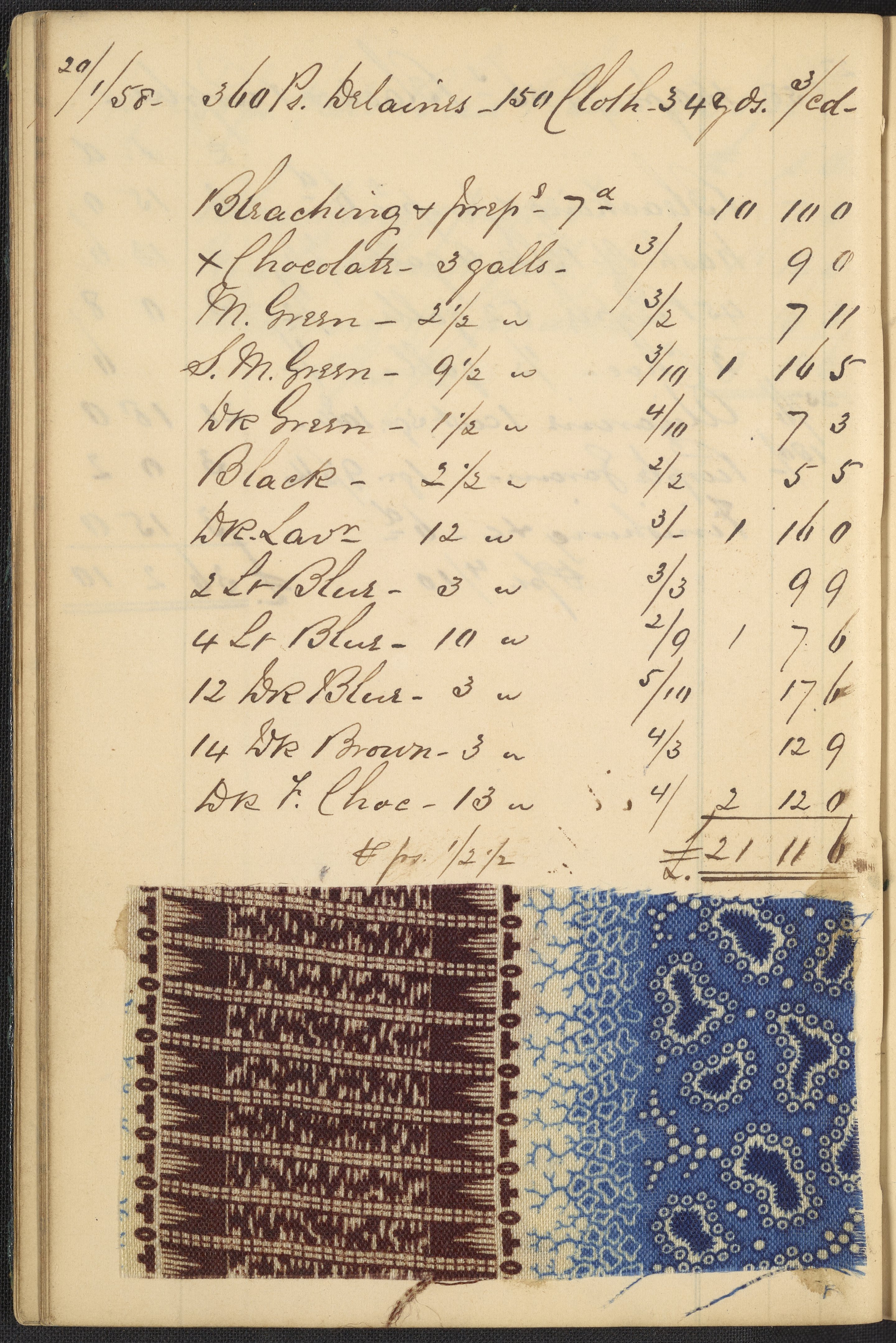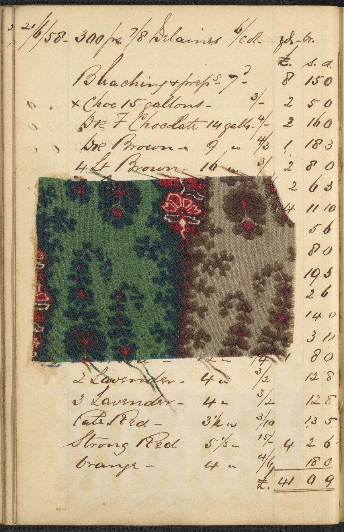 The two journals contain a total of 164 pasted or tipped-in cloth samples. Many of these fabric samples are listed as “Delaine,” a mix of cotton and wool typically used for blouses and dresses. This combination of materials produces a unique appearance when dyed, as wool absorbs dye color better than cotton. For each sample, a recipe listing all the materials used along with prices and quantities for each is provided. Laid into the works are a number of loose pieces of paper with calculations.