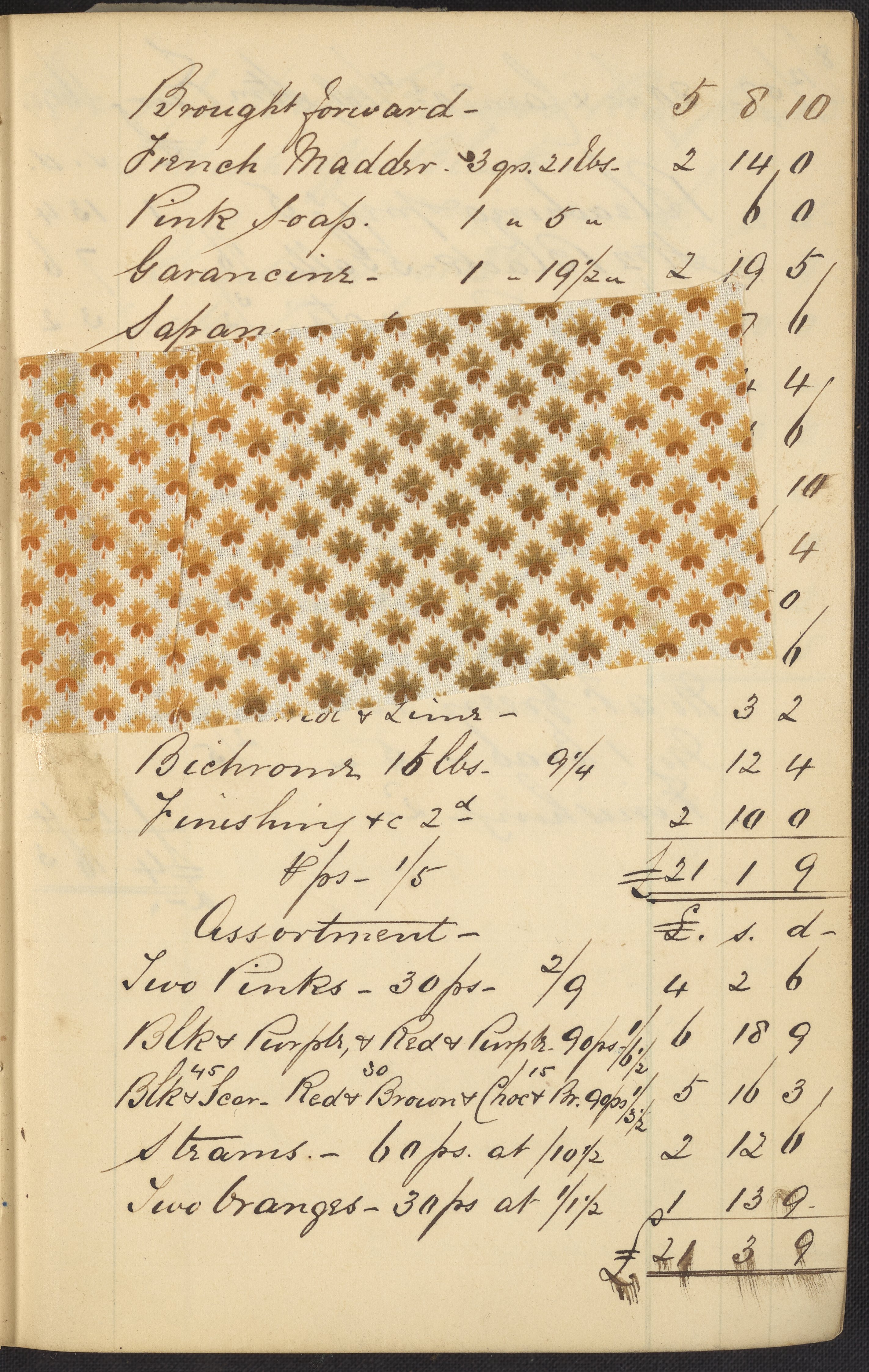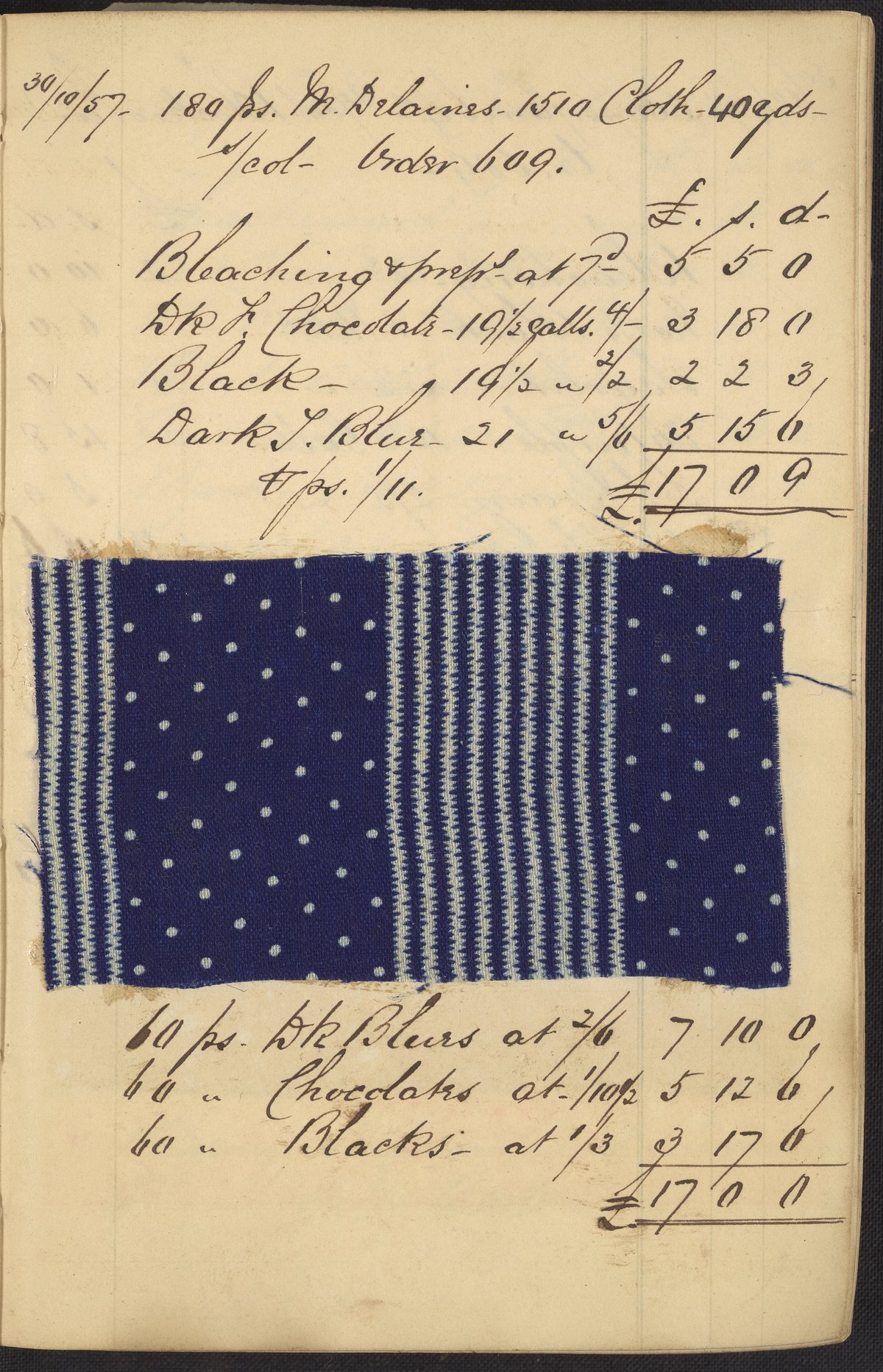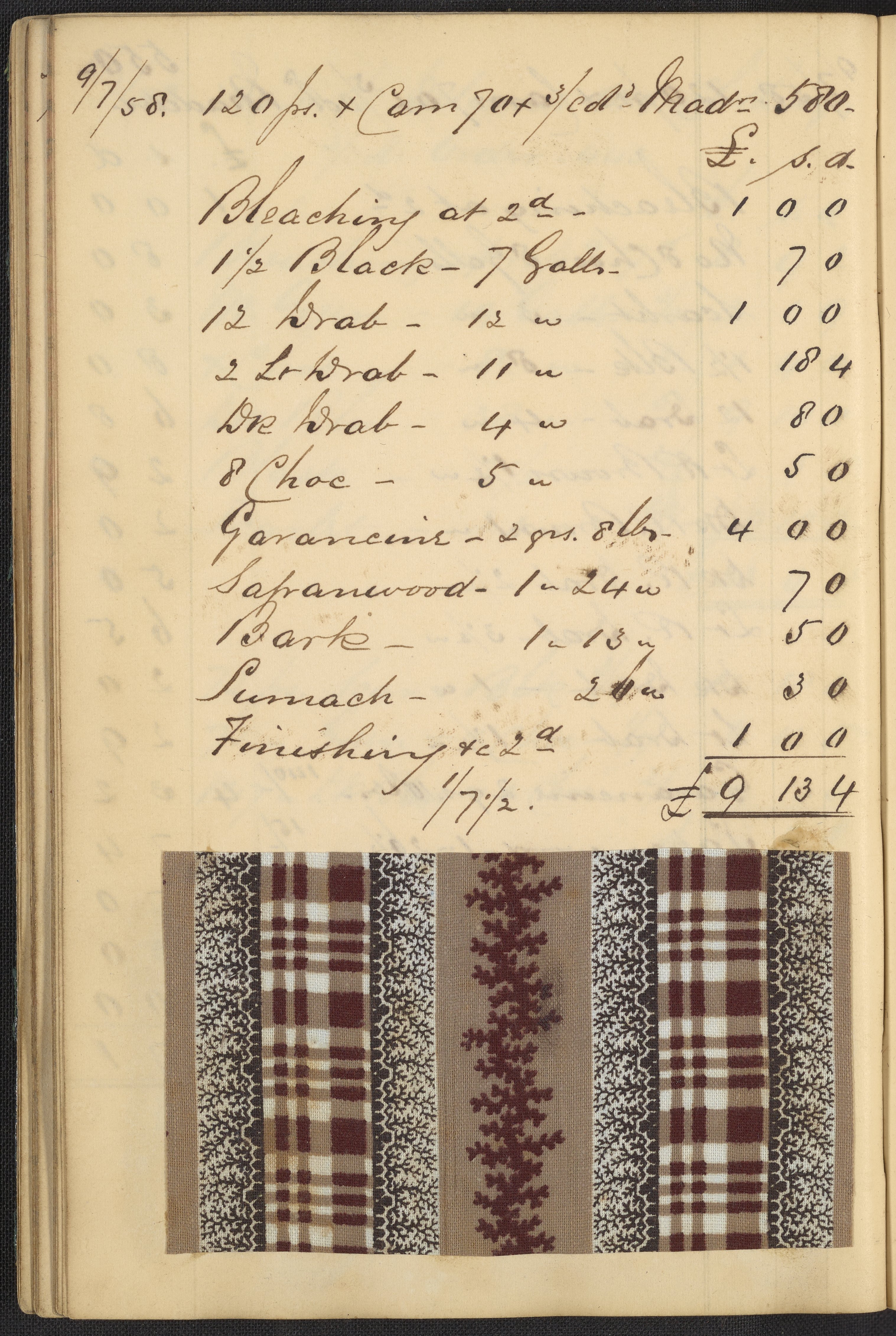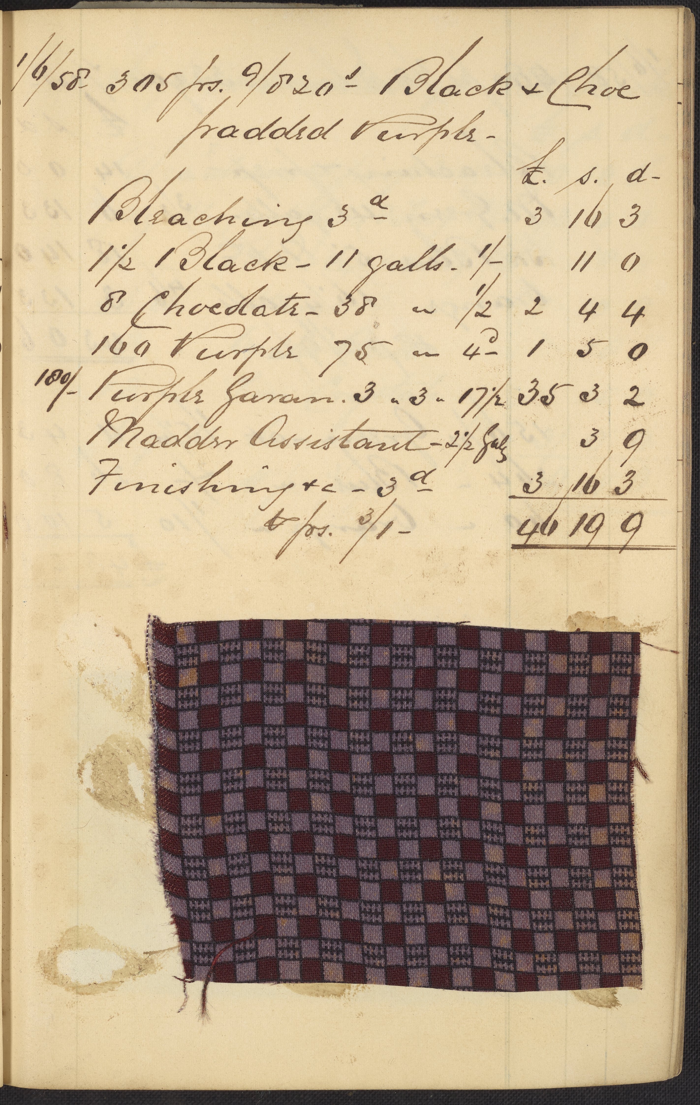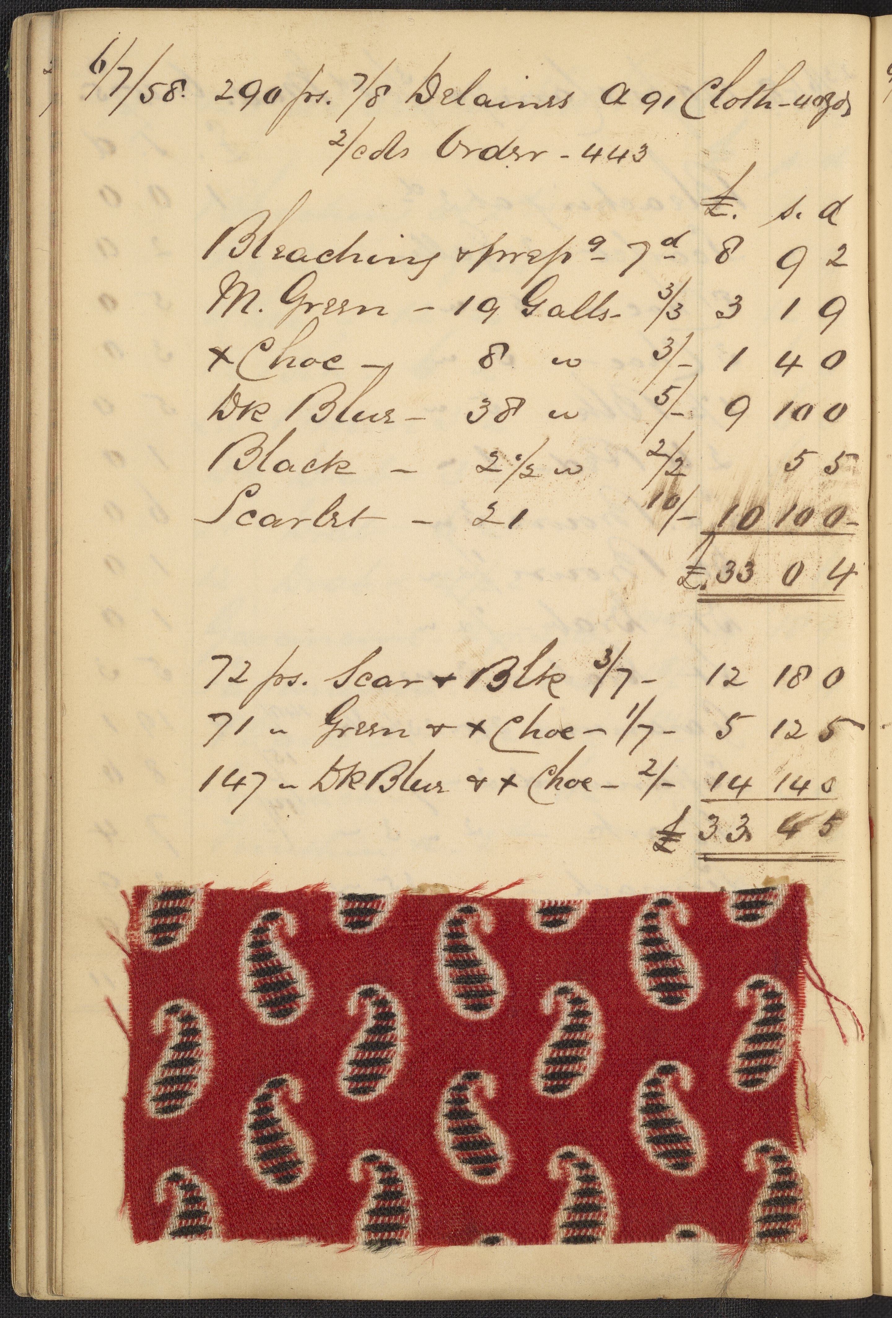 The two journals contain a total of 164 pasted or tipped-in cloth samples. Many of these fabric samples are listed as “Delaine,” a mix of cotton and wool typically used for blouses and dresses. This combination of materials produces a unique appearance when dyed, as wool absorbs dye color better than cotton. For each sample, a recipe listing all the materials used along with prices and quantities for each is provided. Laid into the works are a number of loose pieces of paper with calculations.