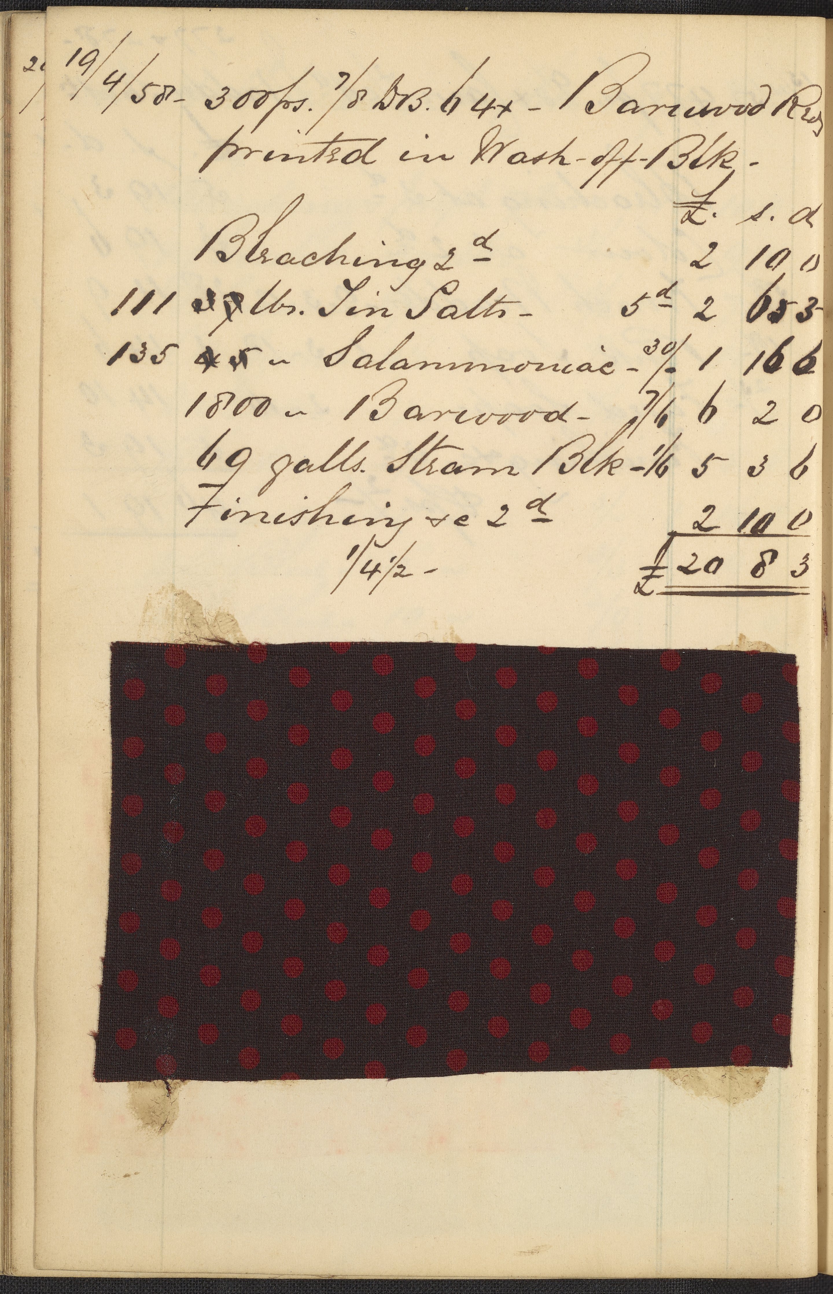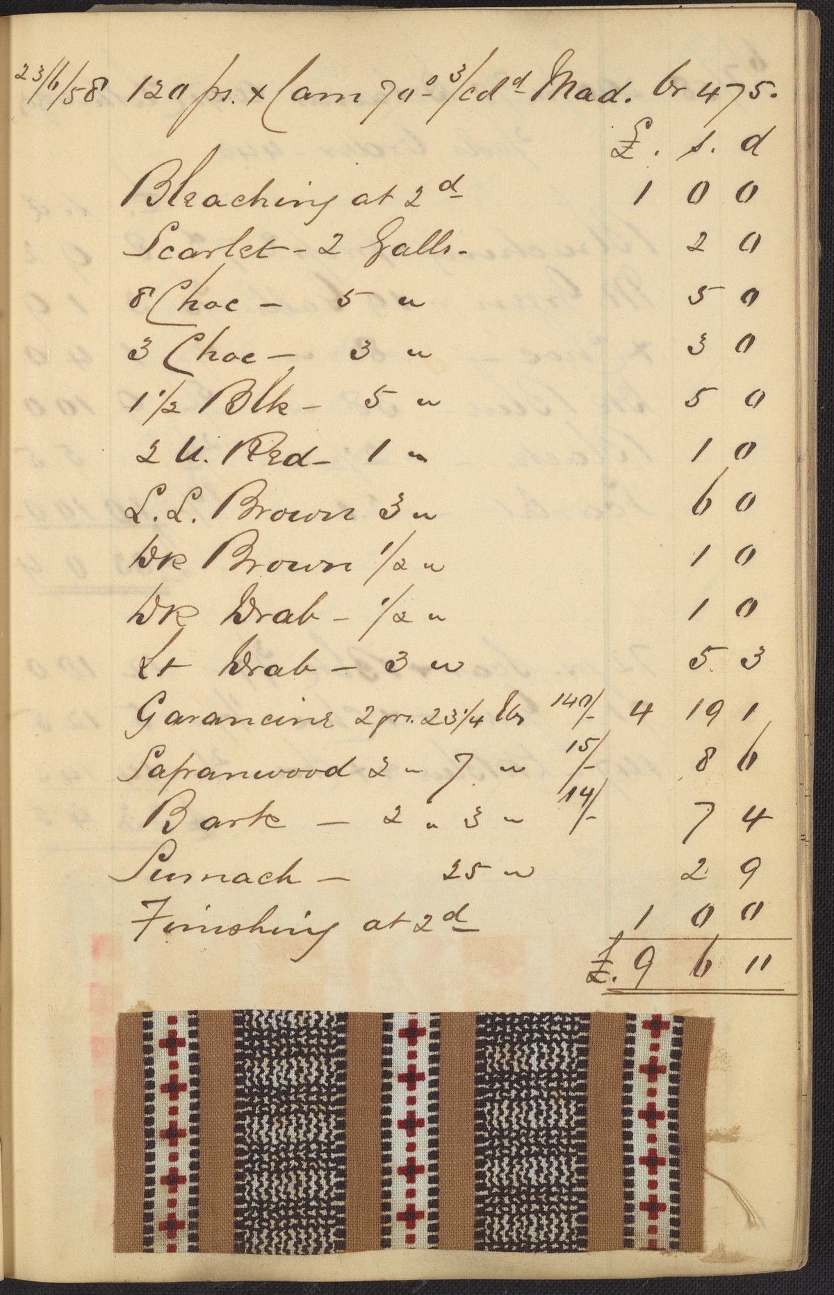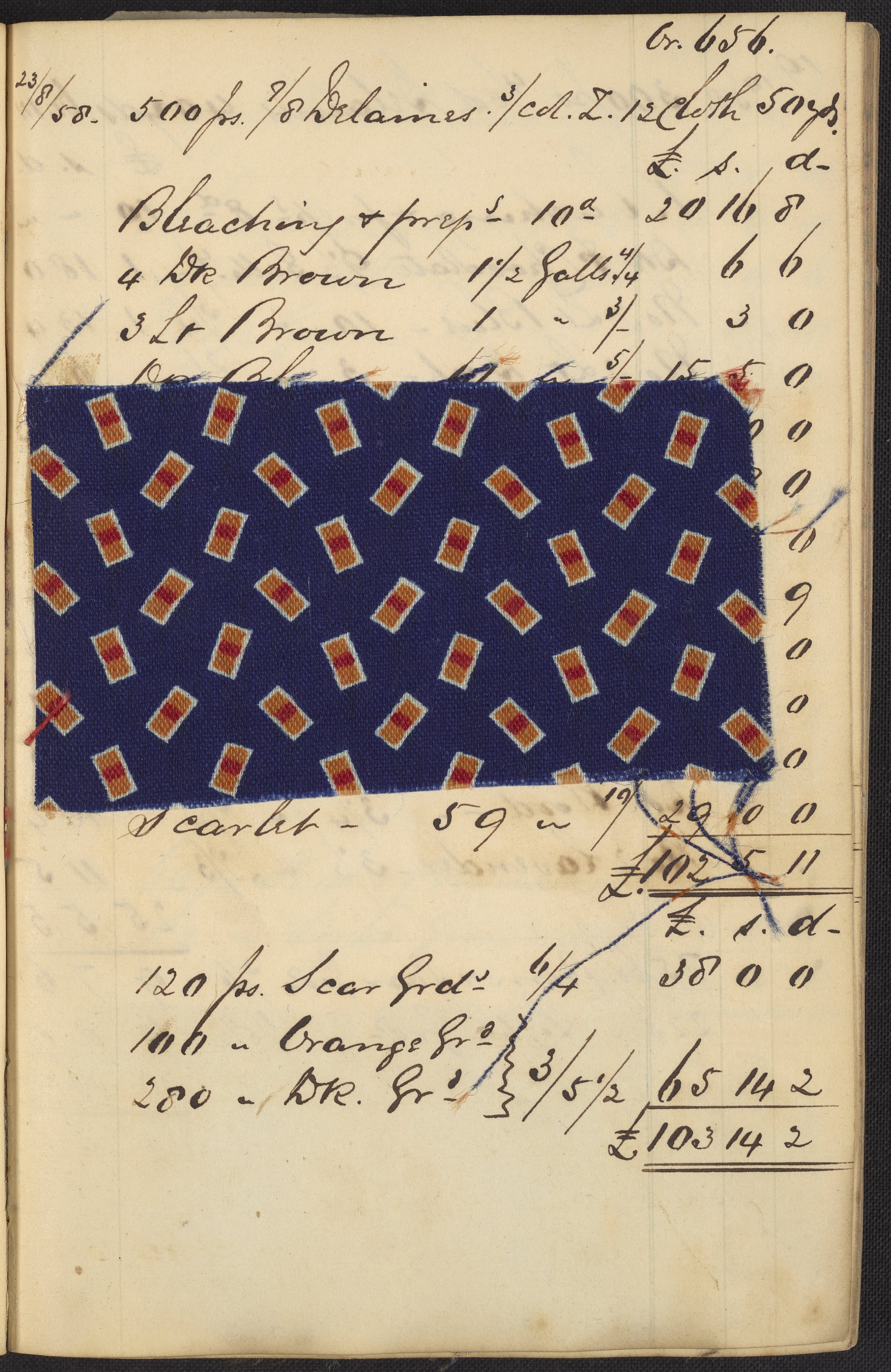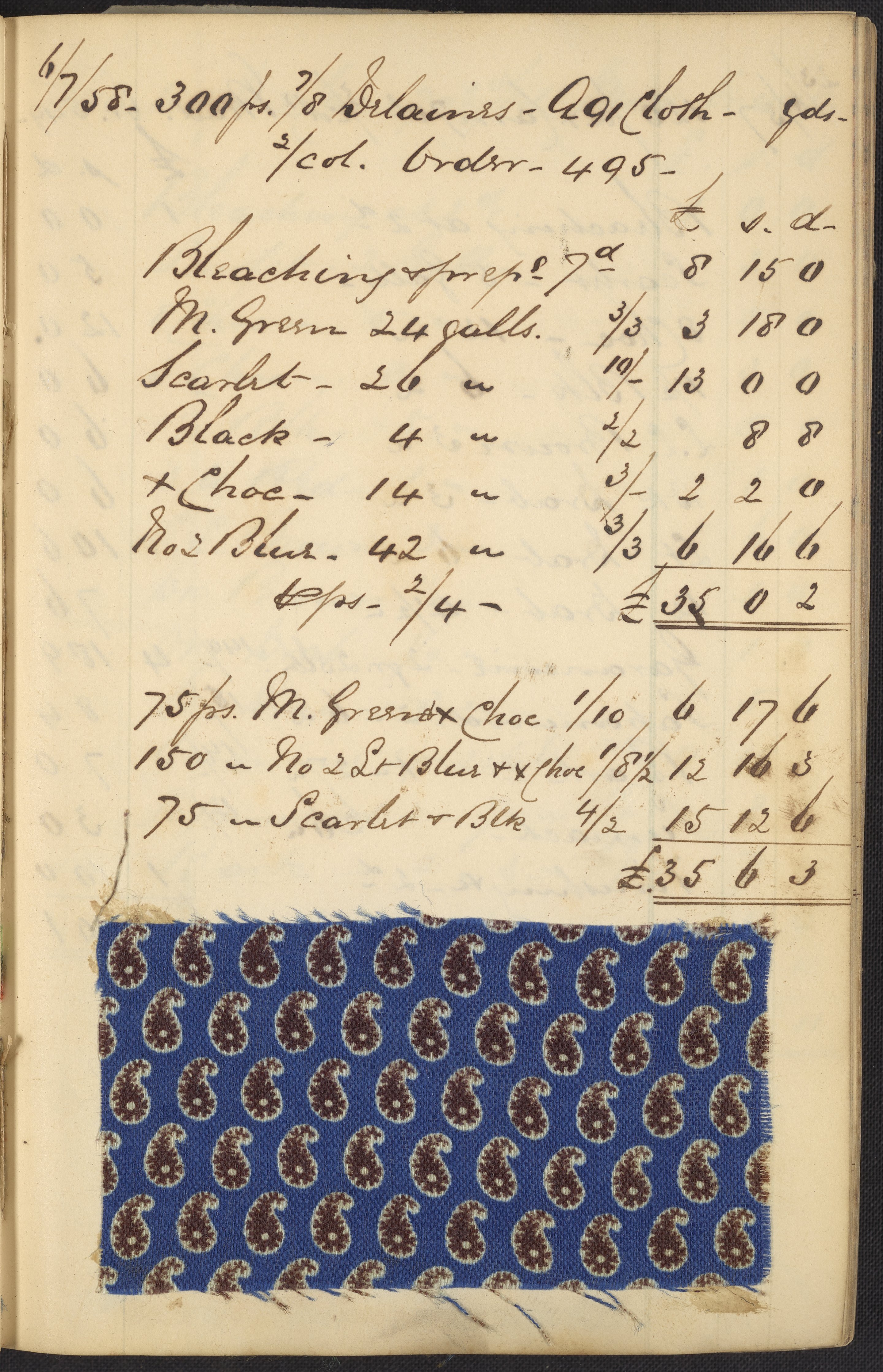 The two journals contain a total of 164 pasted or tipped-in cloth samples. Many of these fabric samples are listed as “Delaine,” a mix of cotton and wool typically used for blouses and dresses. This combination of materials produces a unique appearance when dyed, as wool absorbs dye color better than cotton. For each sample, a recipe listing all the materials used along with prices and quantities for each is provided. Laid into the works are a number of loose pieces of paper with calculations.